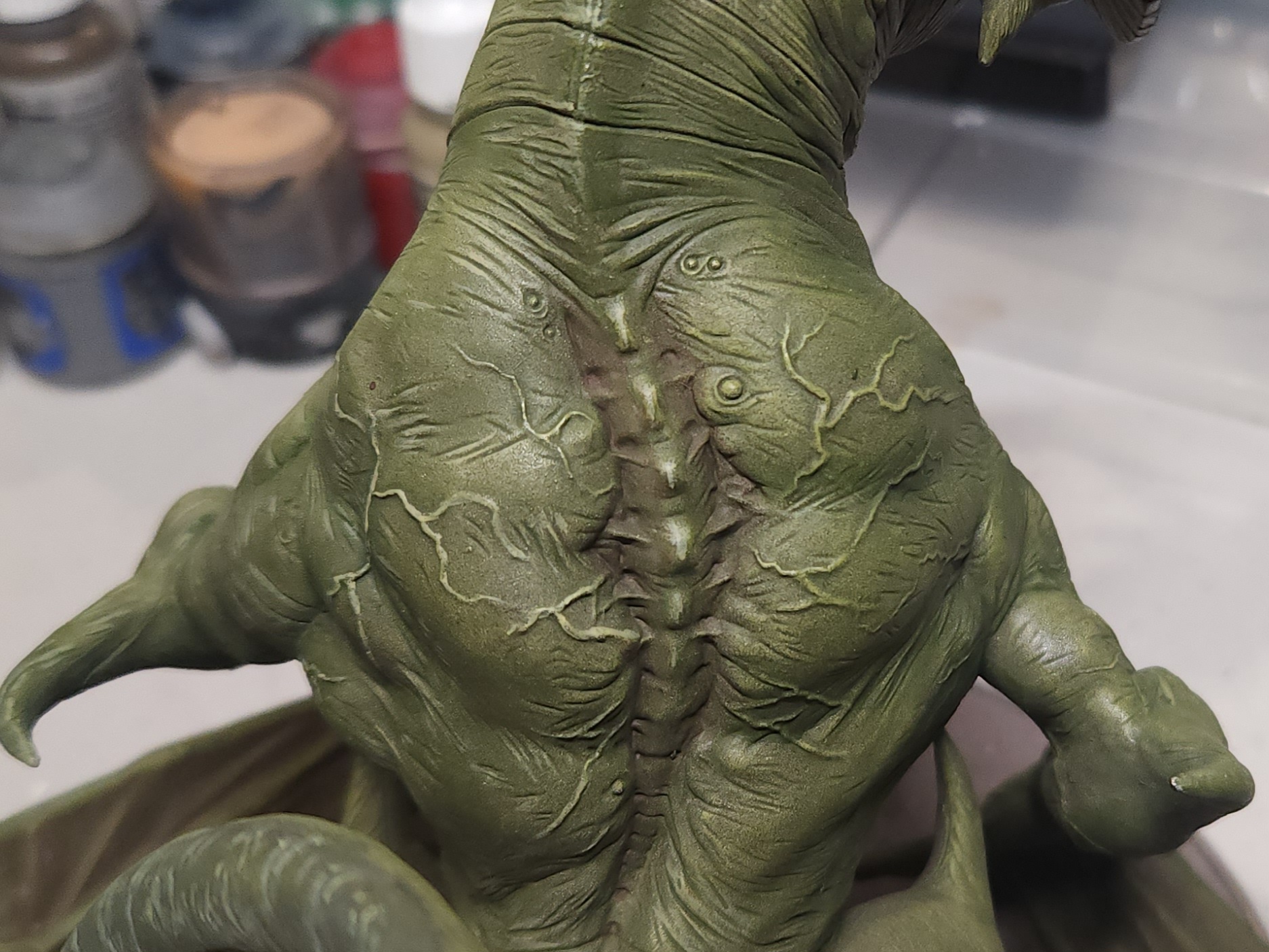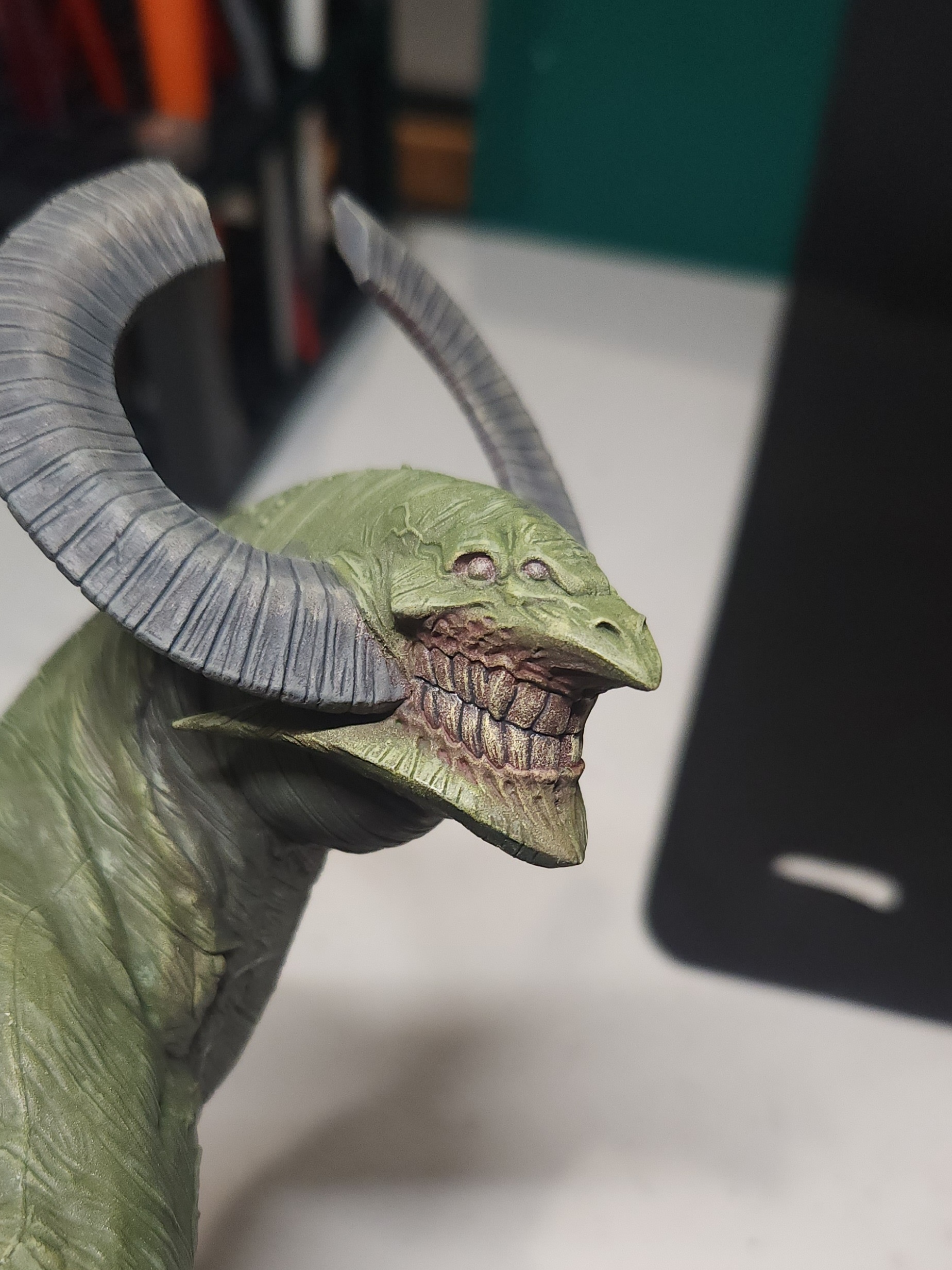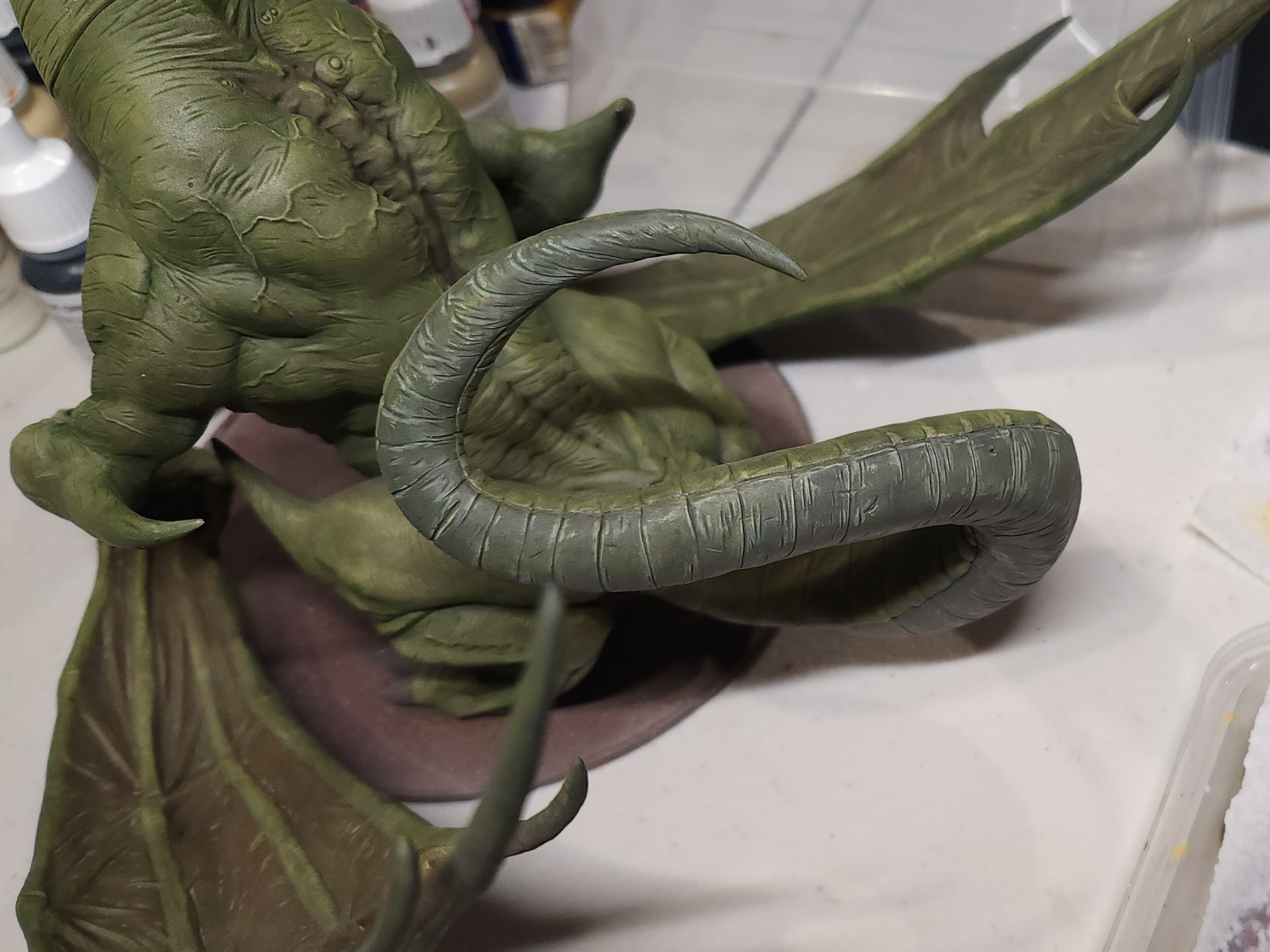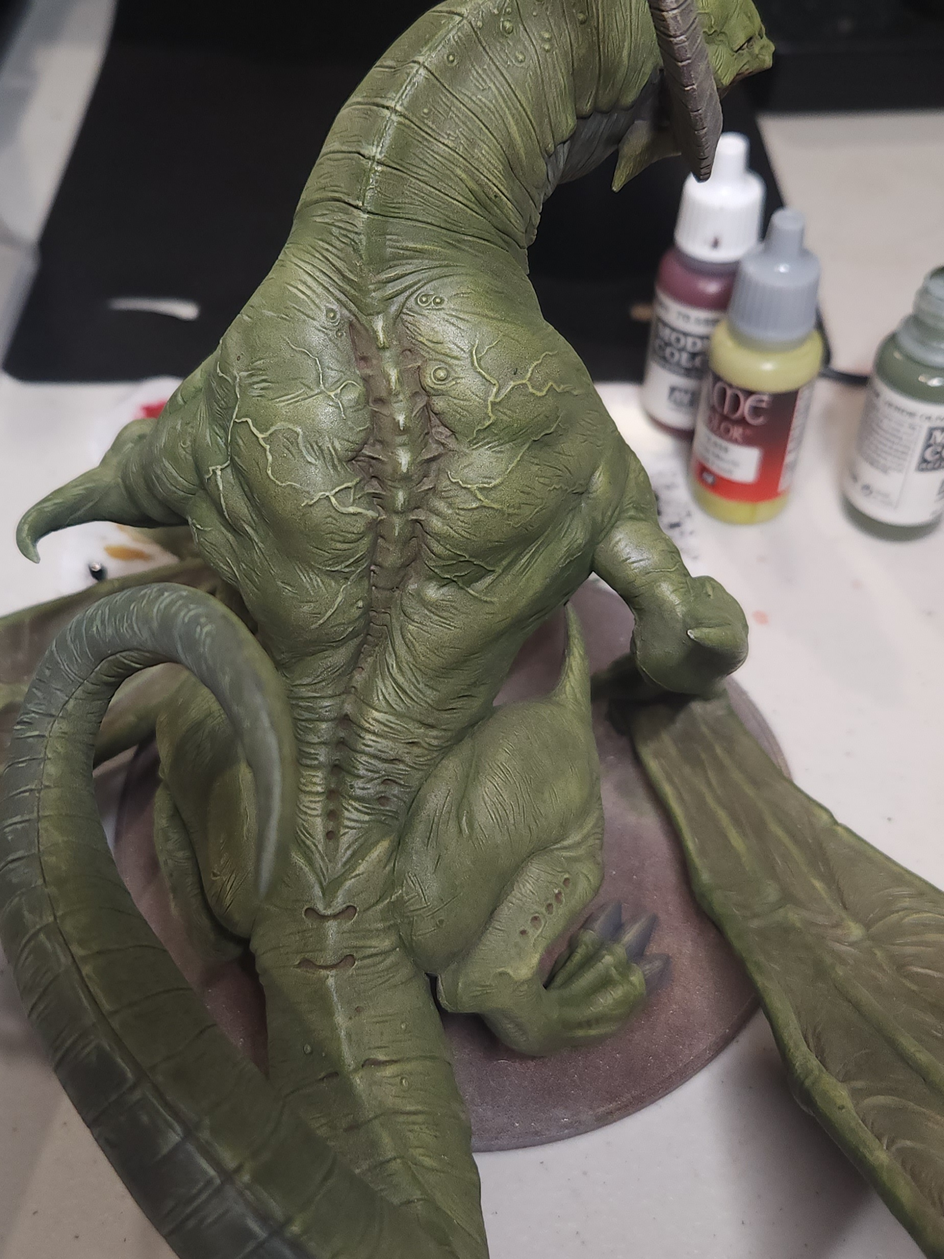 - Shots of the neck also showing highlighting on the ridges of the skin using the same colour mix. I specifically only used this mix on the skin, not the horns/claws/ribs. They’ll get done with different colours later to differentiate them.