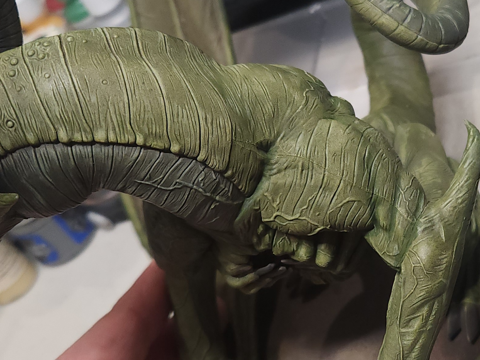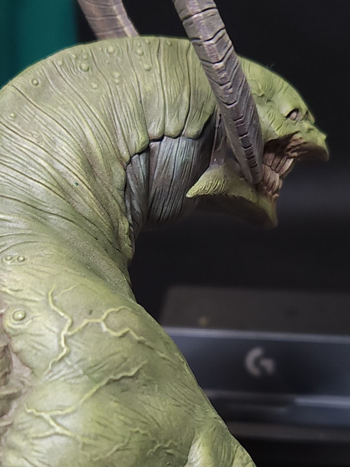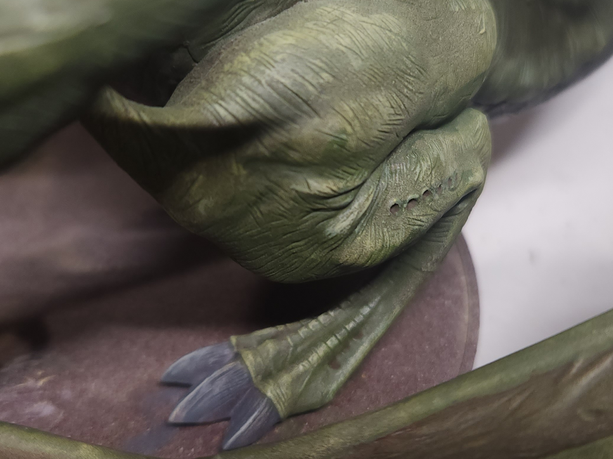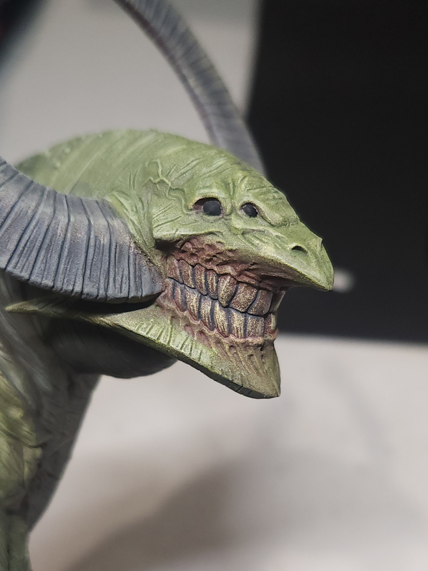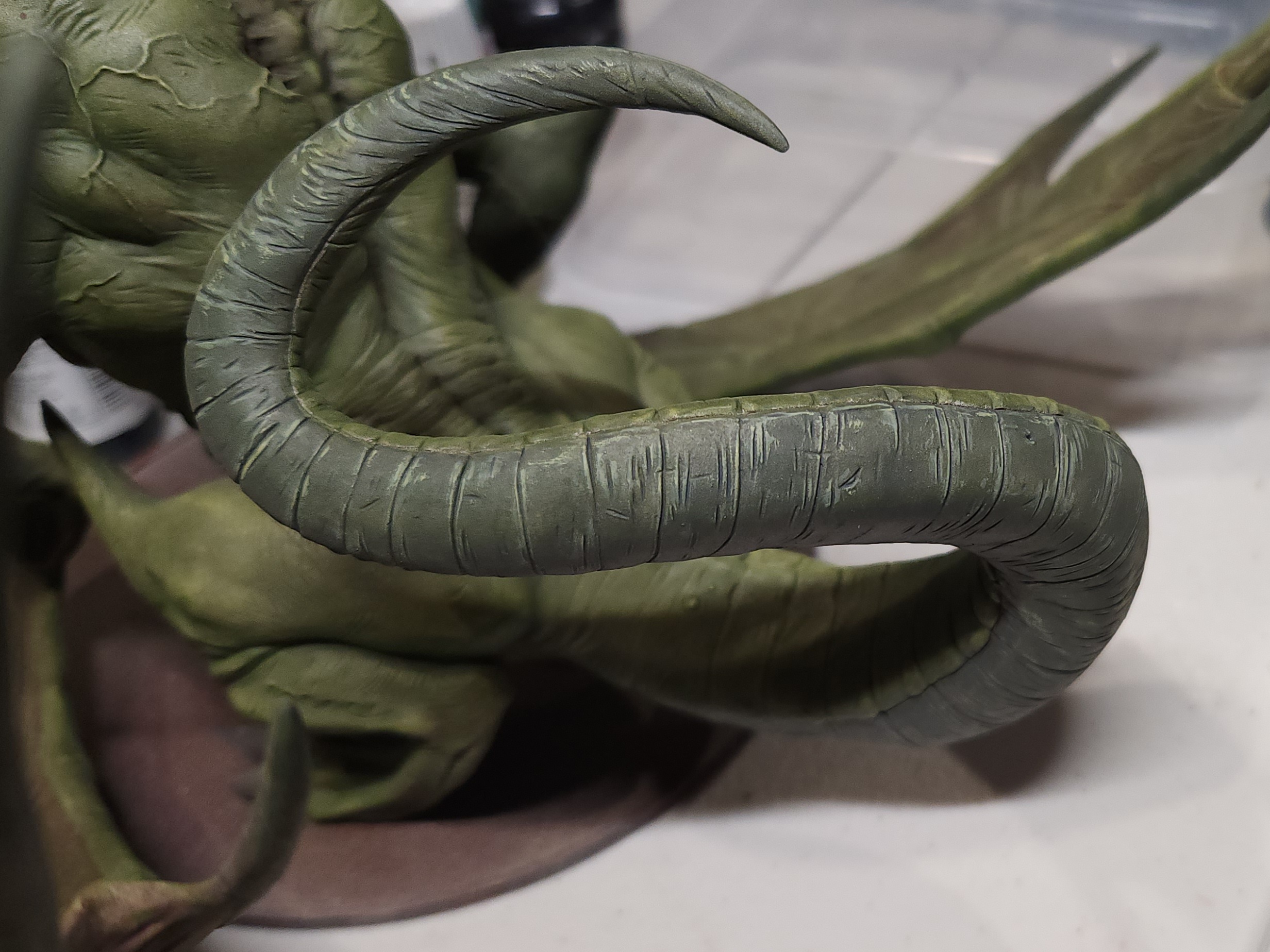 - Shots of the neck also showing highlighting on the ridges of the skin using the same colour mix. I specifically only used this mix on the skin, not the horns/claws/ribs. They’ll get done with different colours later to differentiate them.