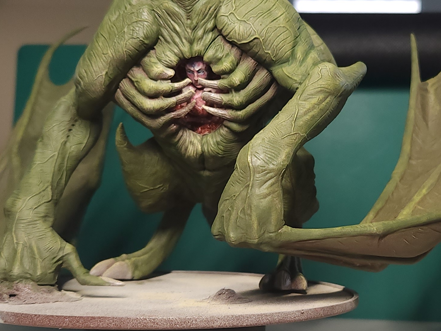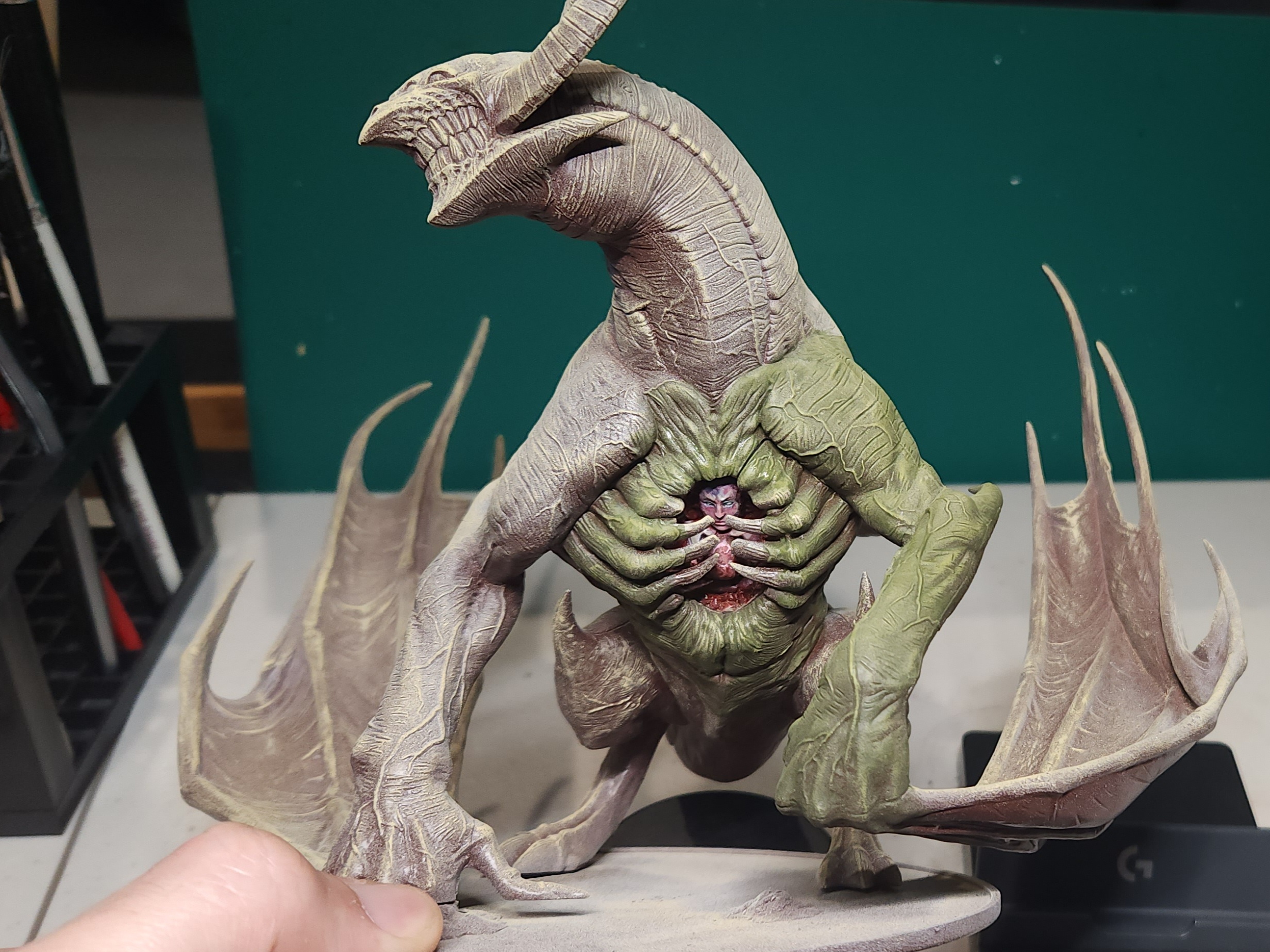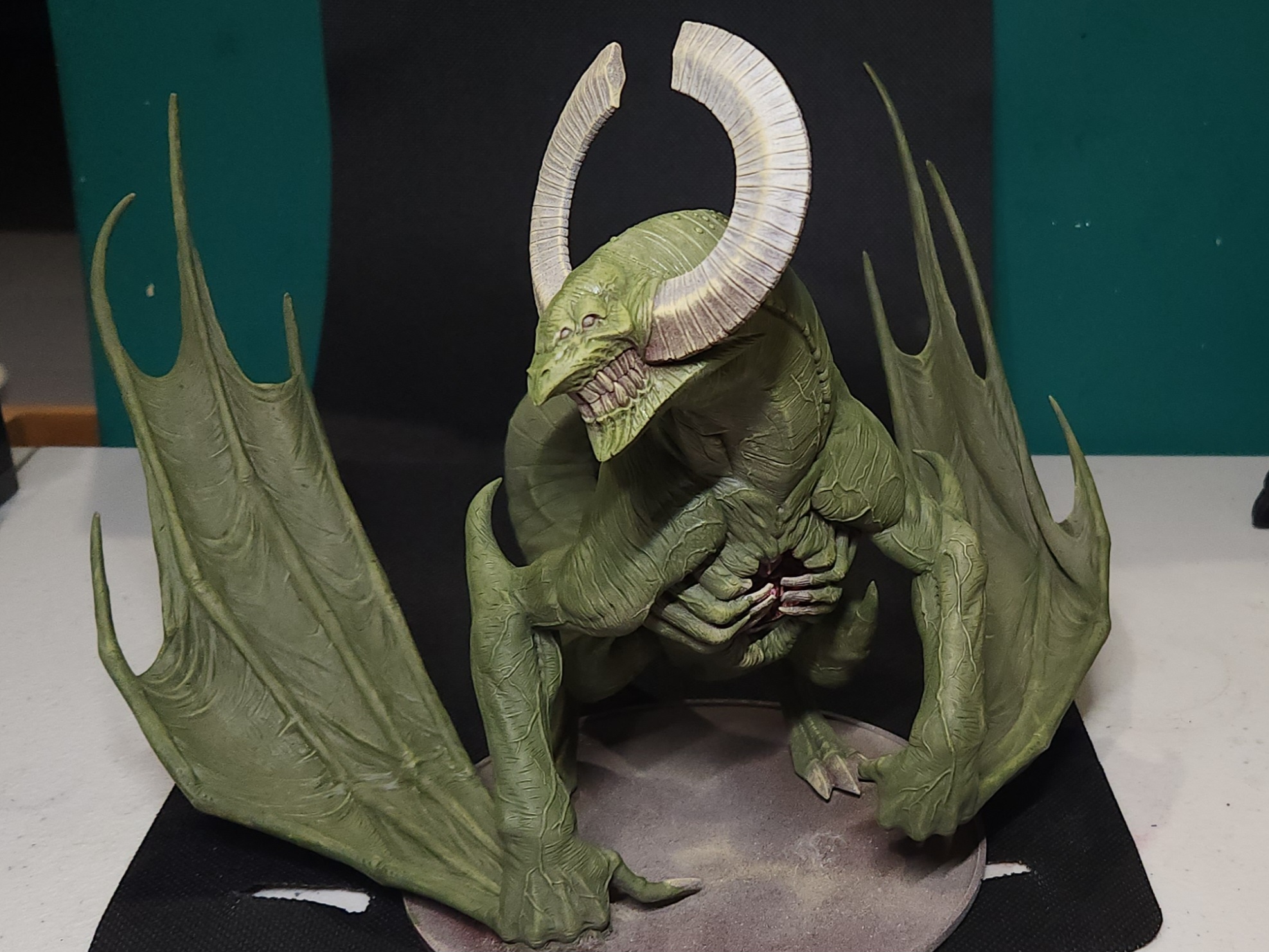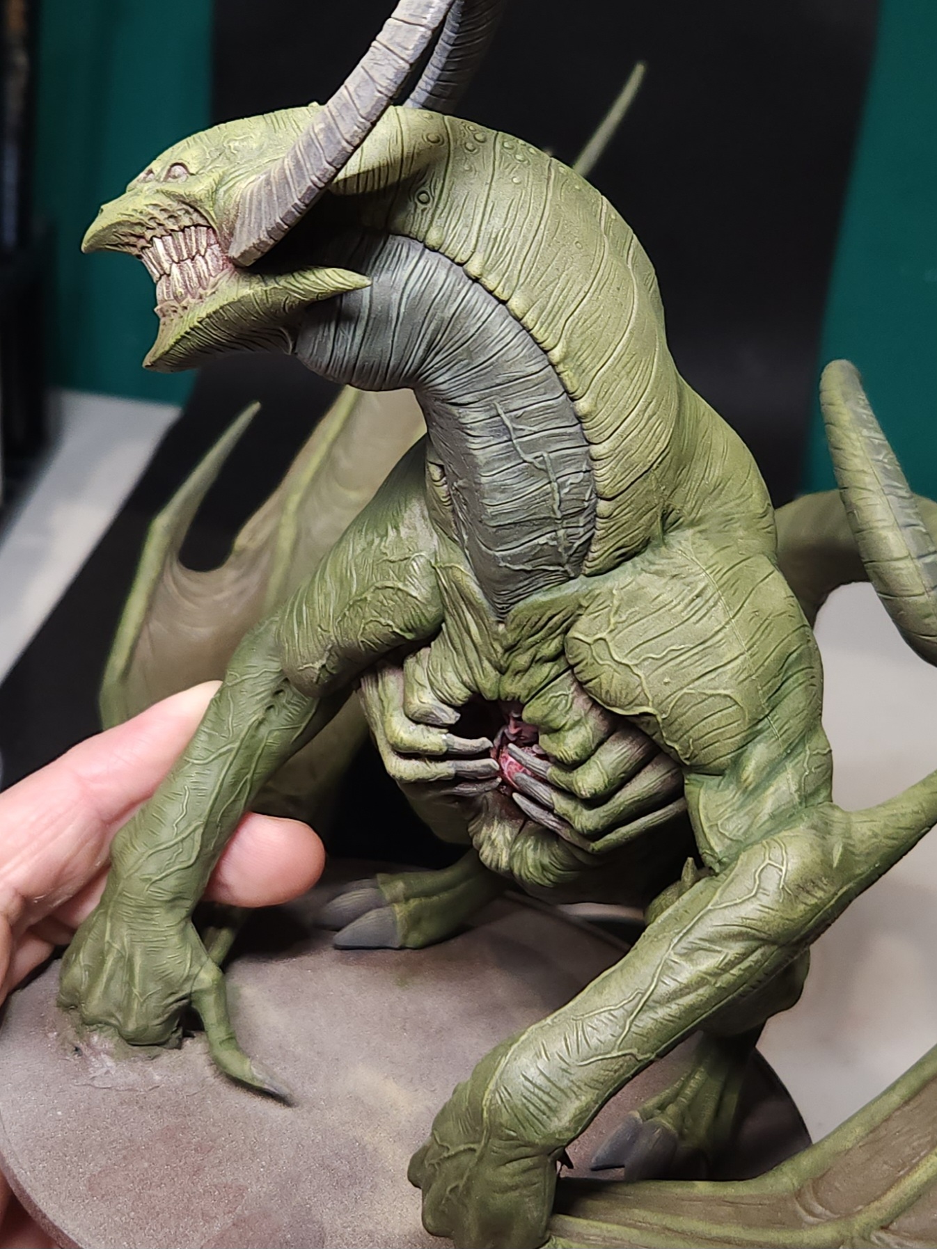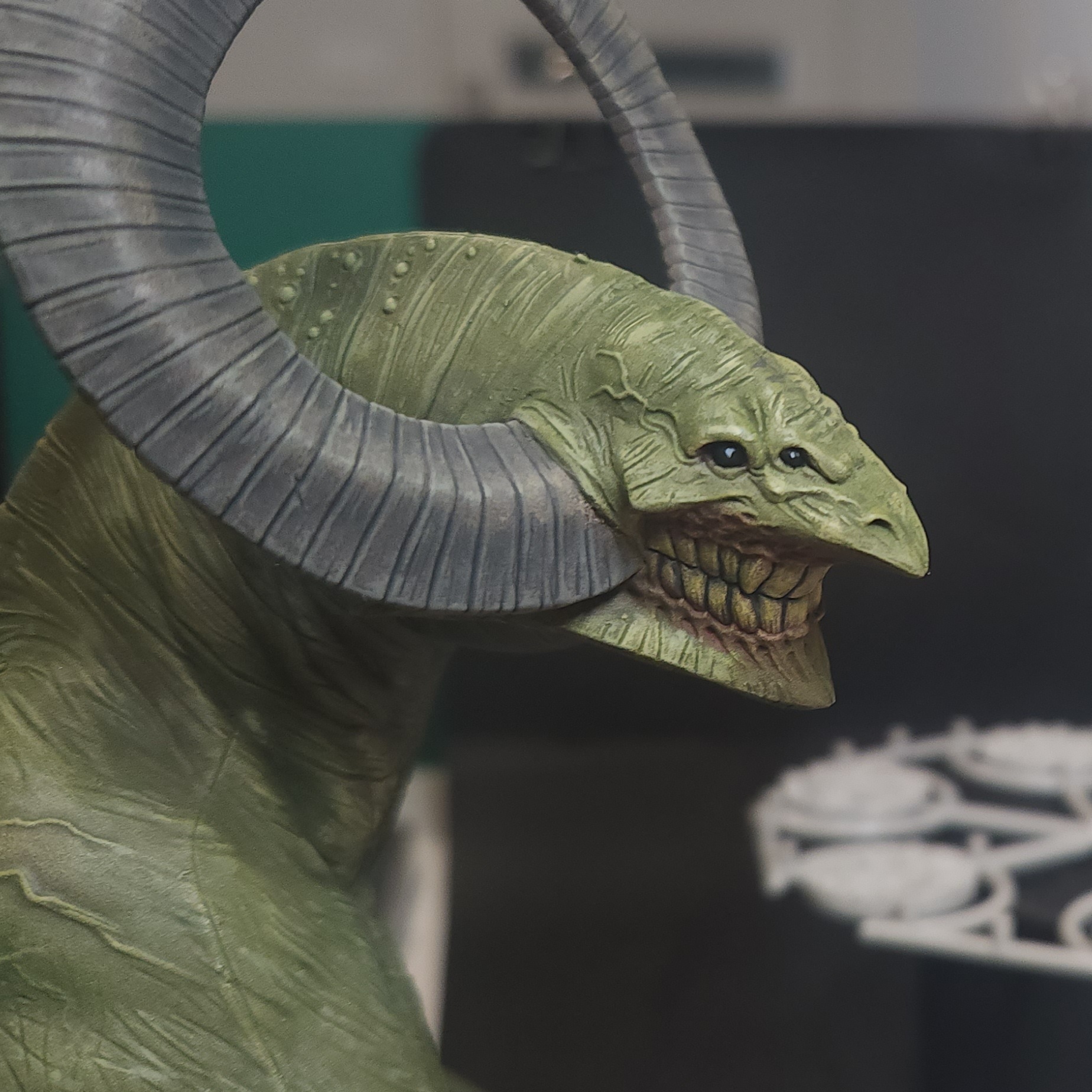 - Shots of the neck also showing highlighting on the ridges of the skin using the same colour mix. I specifically only used this mix on the skin, not the horns/claws/ribs. They’ll get done with different colours later to differentiate them.