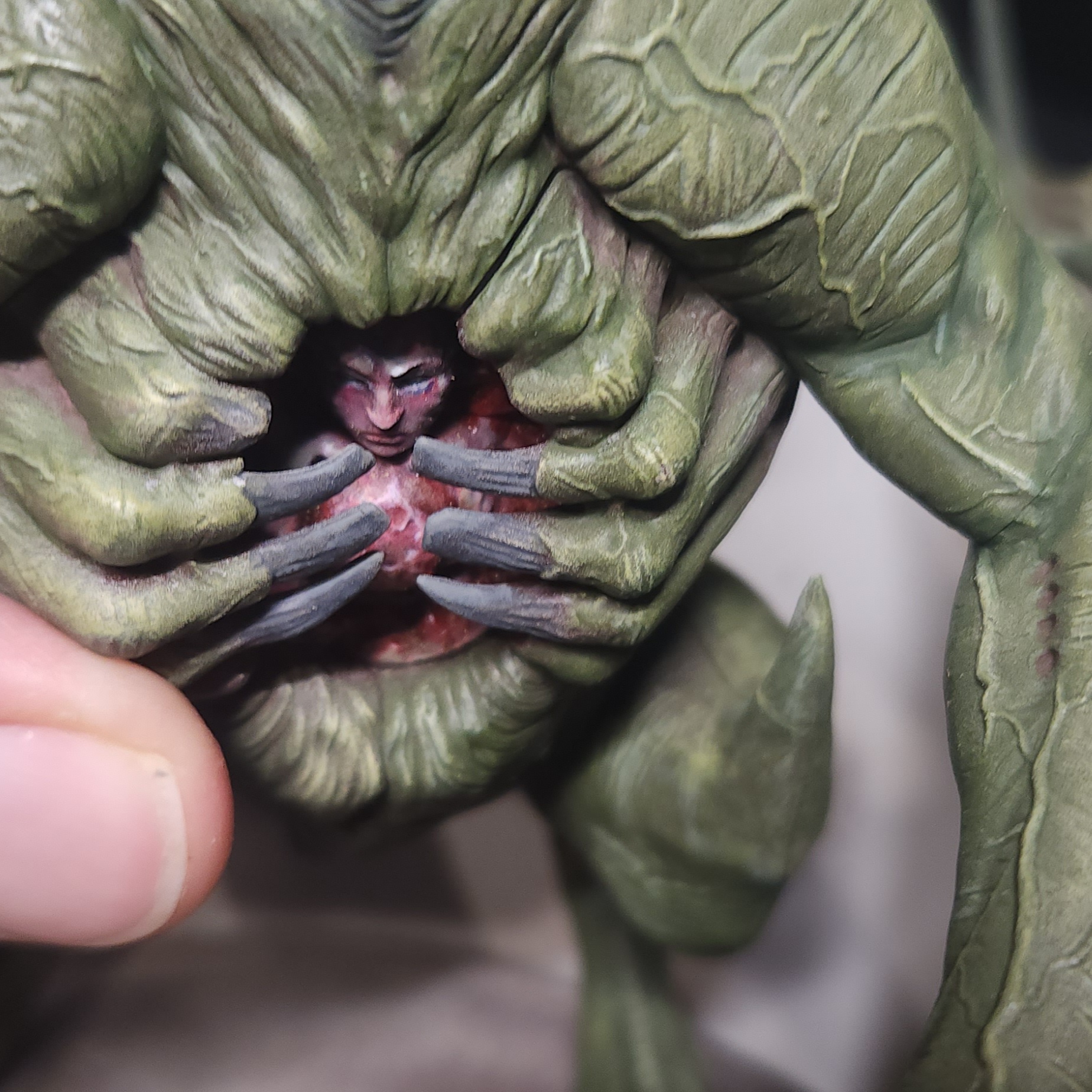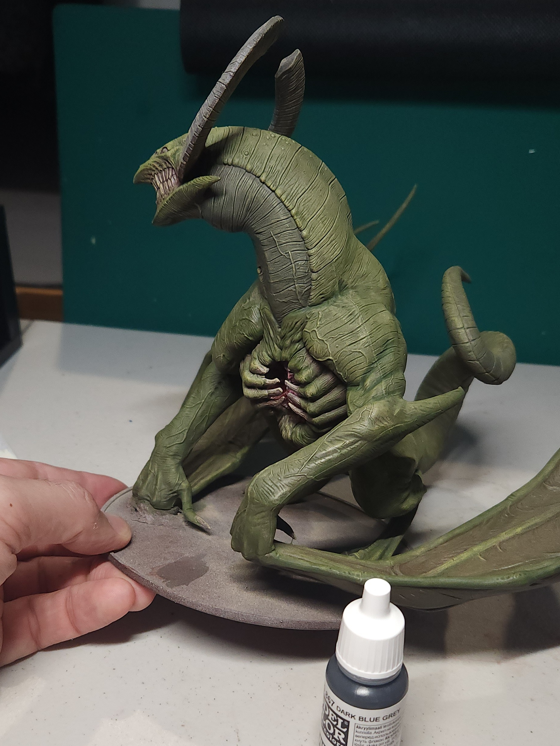 The grey is Vallejo Dark Blue Grey, again applied in two thin coats. This allows some of the green and the red to show through from under and give interesting variations to the skin. (Or, at least, that’s the idea… lol.)