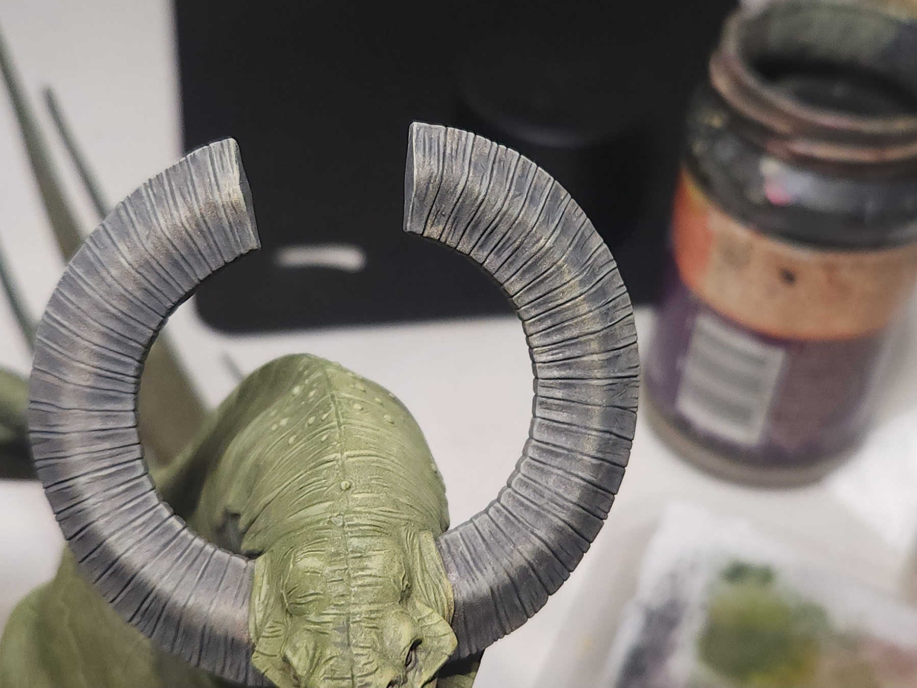 I thinned it a little further to glaze over the horns as well. When doing this, I hit the edges of the horns and avoided the ridge running up the centre on the front of the horns.