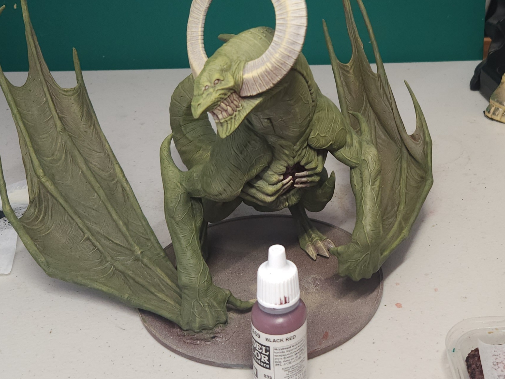 The wings got a second coat of the Vallejo Black Red. I also glazed this in around the spine and around the teeth.