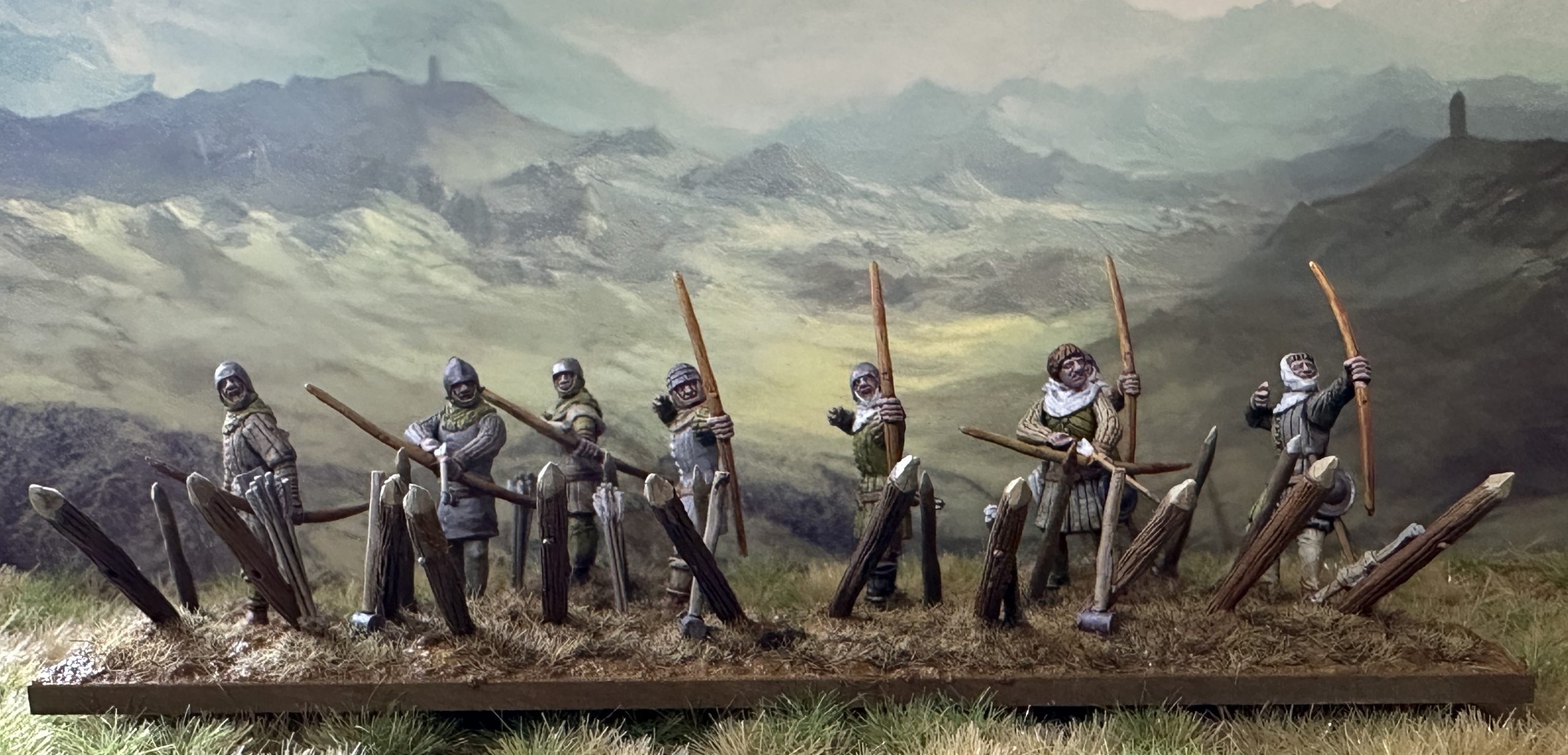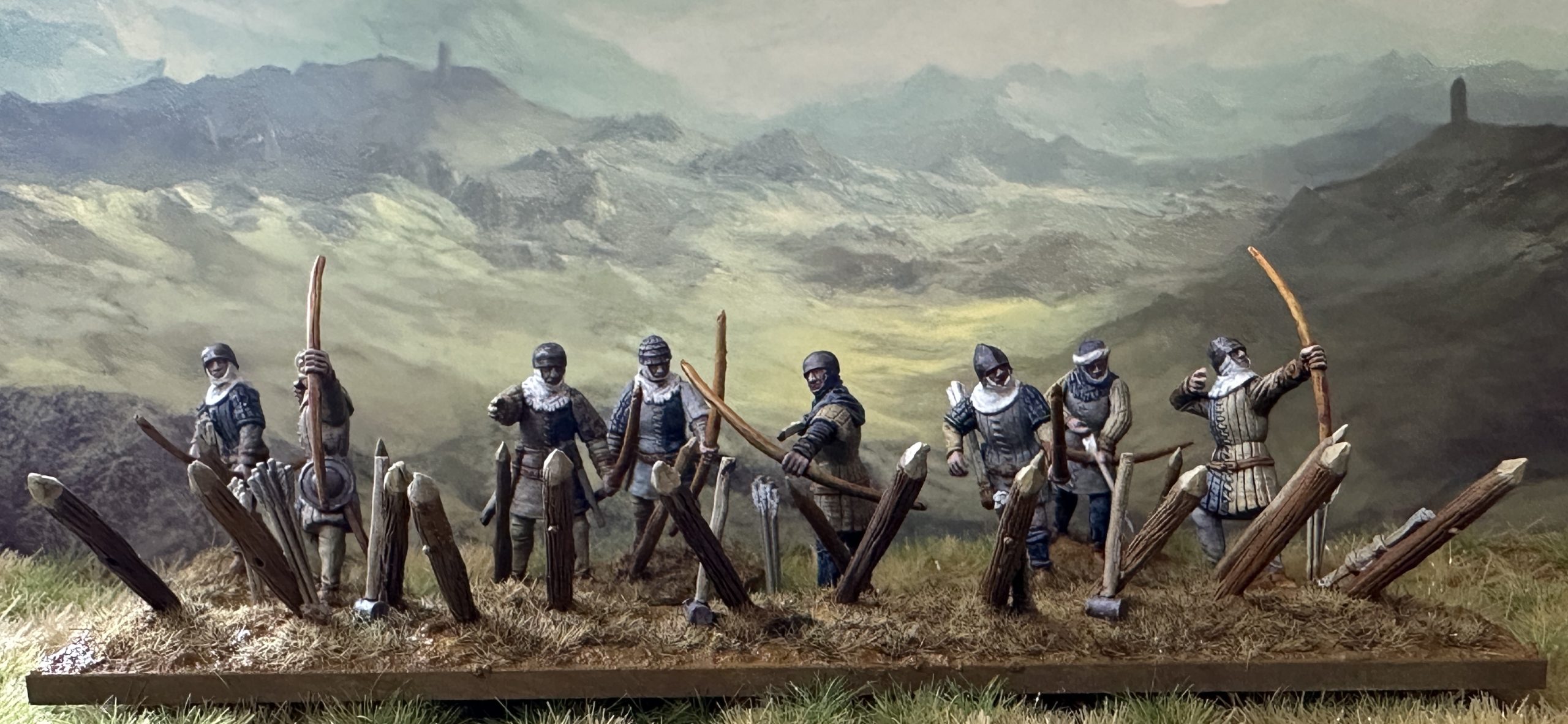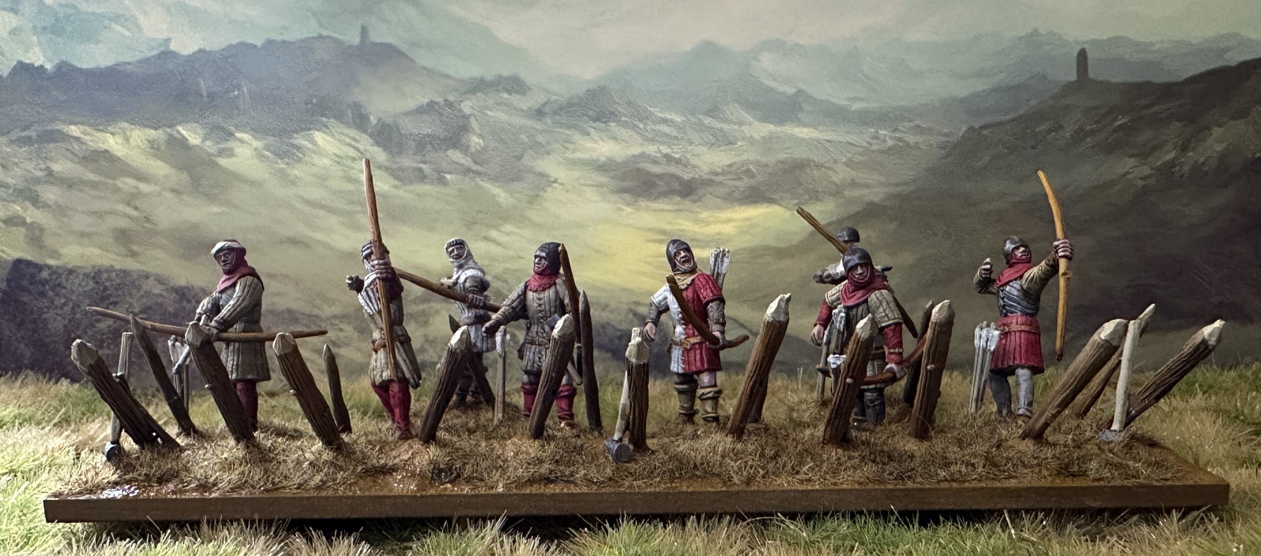 I finally got these done. In the game the English have an ability which allows them to errect a barrier of stakes that is a medium ruler long. I therefore needed to model this and bought a couple of Perry Agincort range packs, one of stakes and one of archers preparing defences. Here are the finished archers and their stakes: