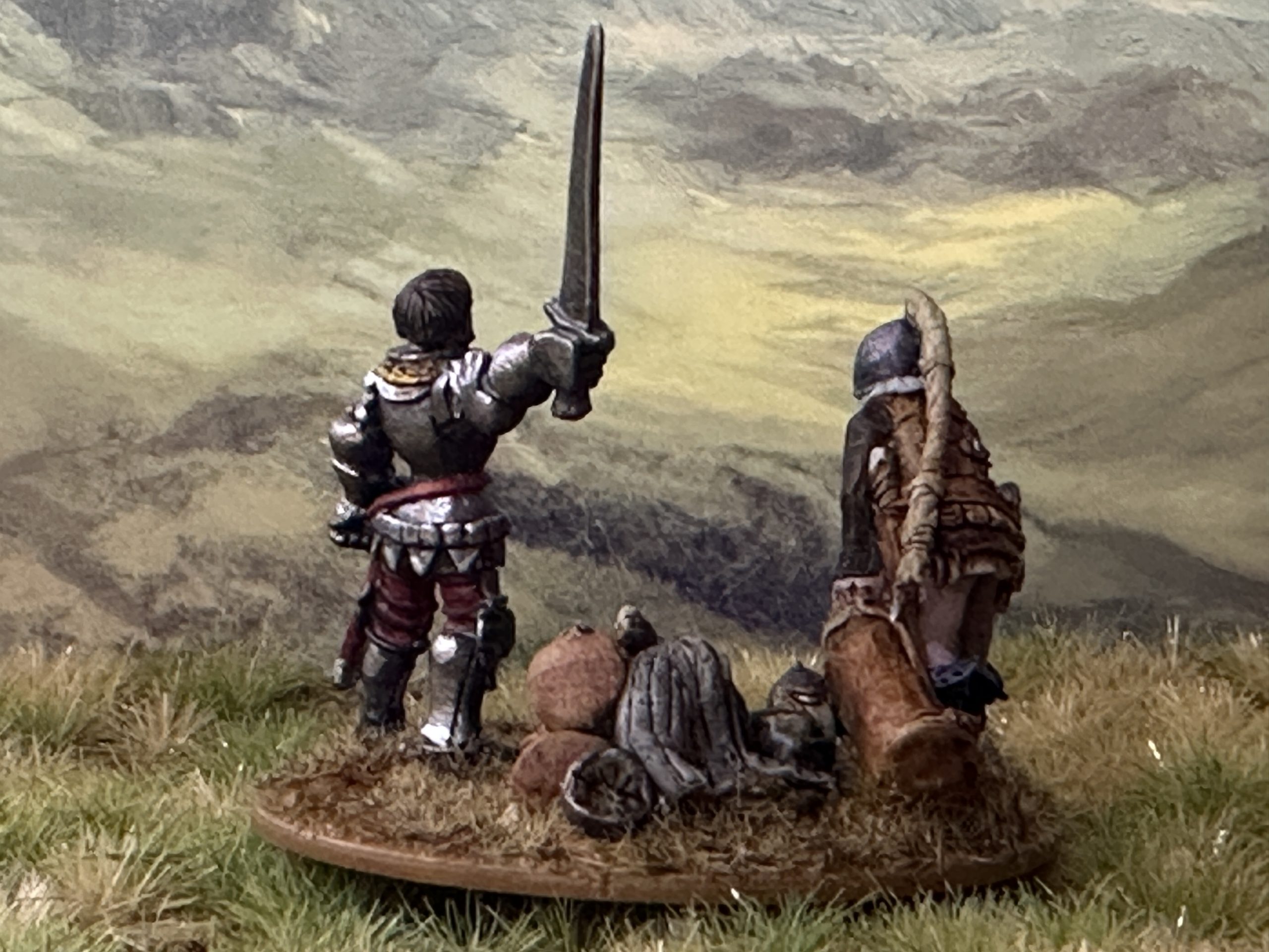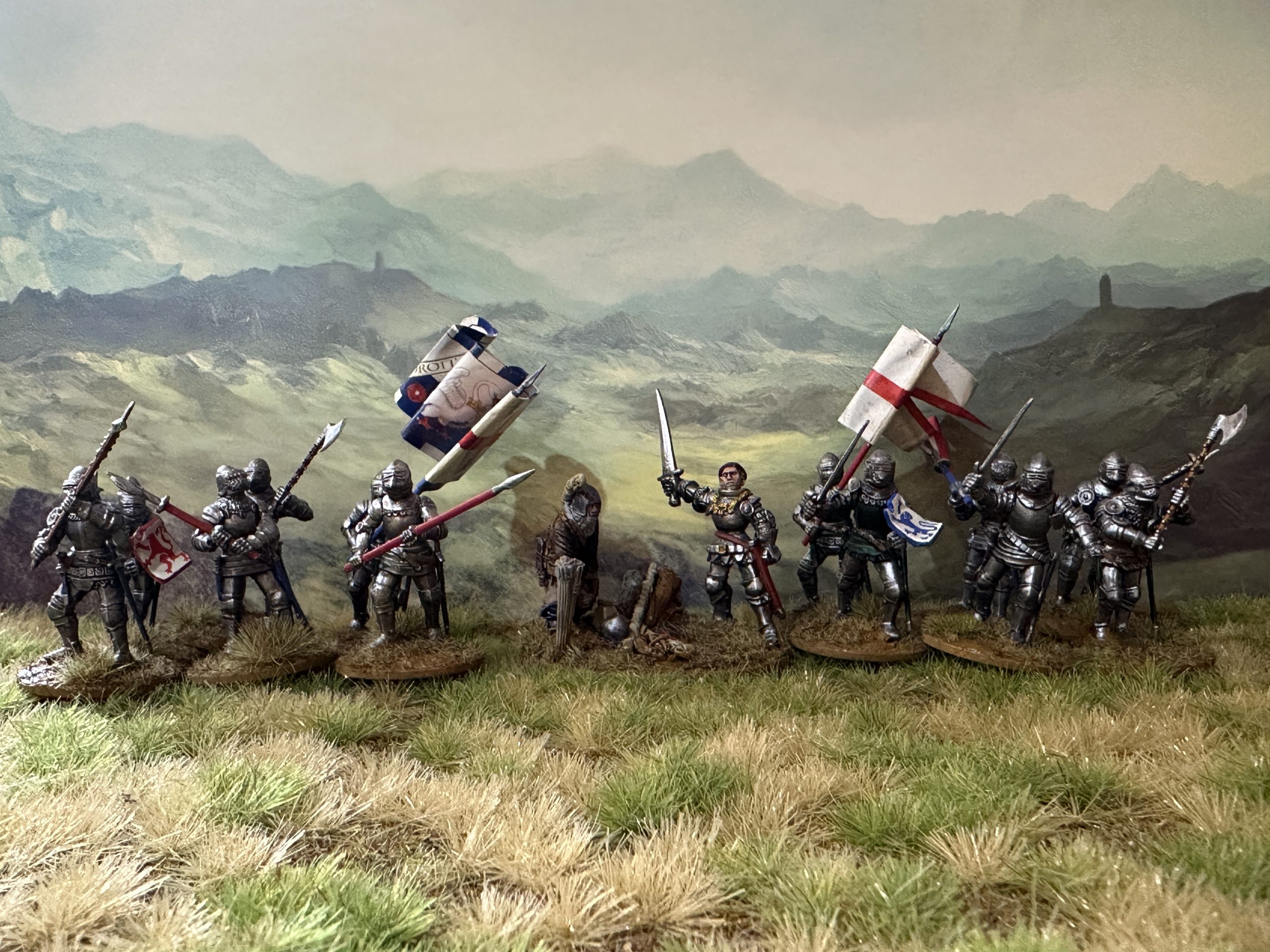Finally we have the warlord base. This is Henry V himself, by Copplestone Castings with an archer and some supplies from the Perry pack. I’m pleased with the shiny armour effect. I tried to up it a notch with some AK paint pens as a final highlight. Not sure that worked too well but overall there are a lot of shiny bits so I’m happy.