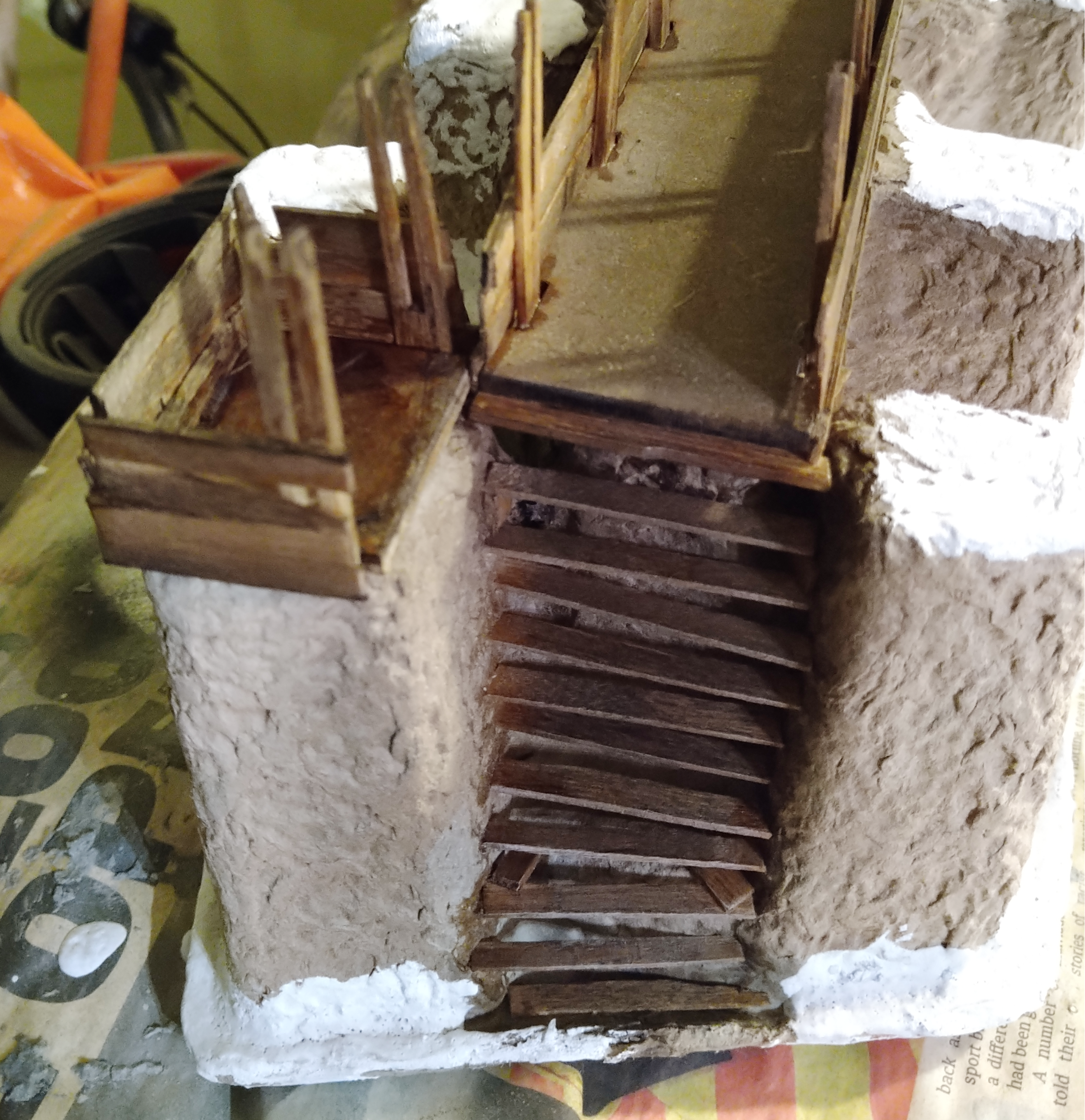 Ideas have started to flow again. Wondering whether I need a winch and ropes to get bigger items up the stairs to the crossing level. Or whether there should be the remnants of an old gate that used to close off the ladder and make ascending the stairs a death sentence if the people on the bridge wanted to protect the crossing.The build.