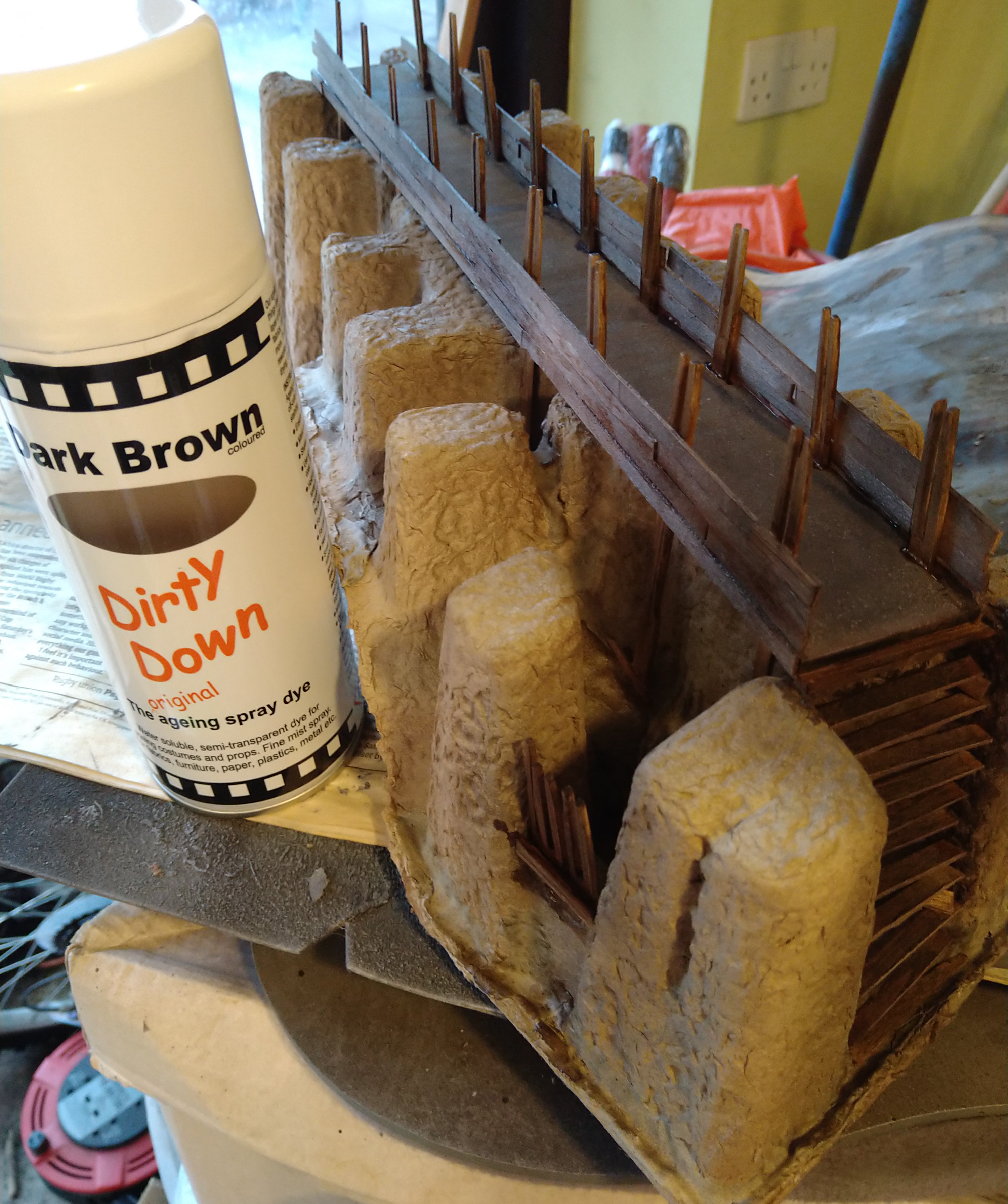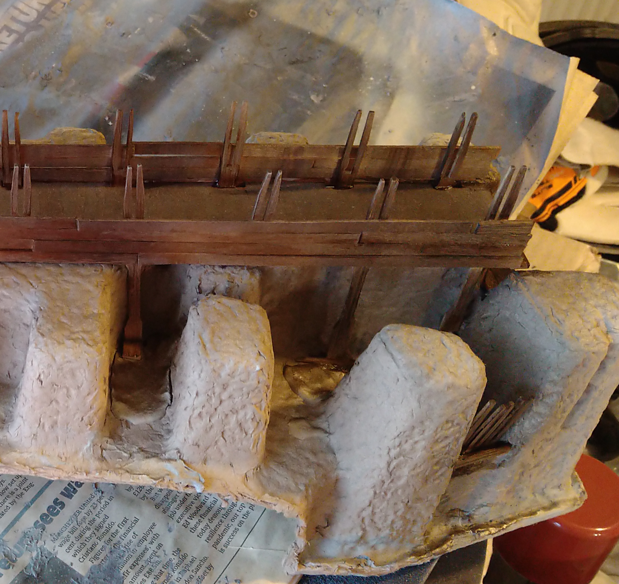 I am torn between having the whole length of he bridge having the sides raised but in a terrible state of repair, or making a suggestion that their used to be a roof on the thing. The defense that the Archer is stood in could definitely do with an addition of some kind. Also looking at some potential weathering for the stone because it's all a bit too poppy.Filler and extra defences