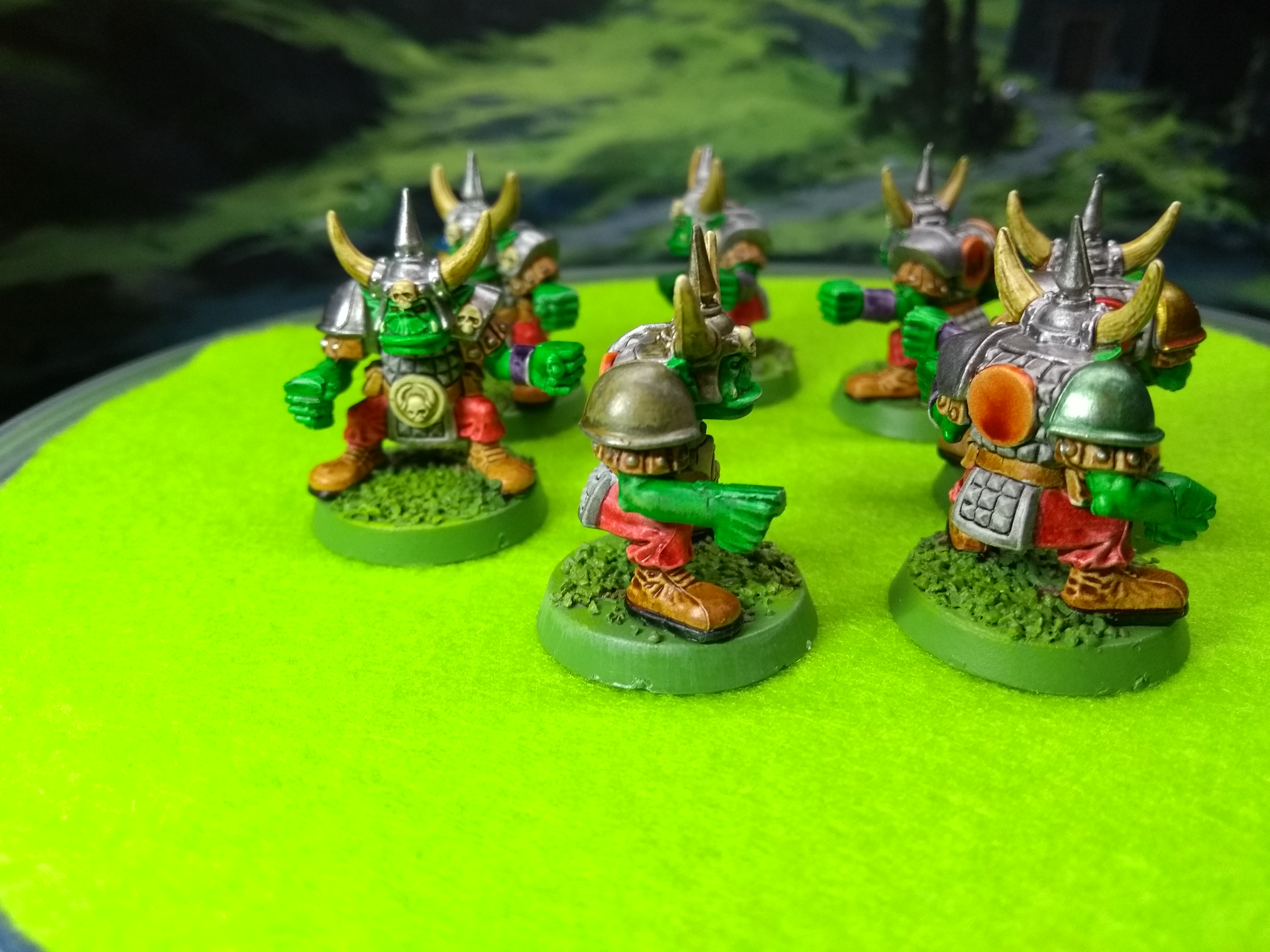 To familiarise myself with the colours, I dug out some old models. Space Goff Orcs where someone (maybe even myself) cut off the weapons to use them as linemen at Blood Bowl. All already primed white. How handy!