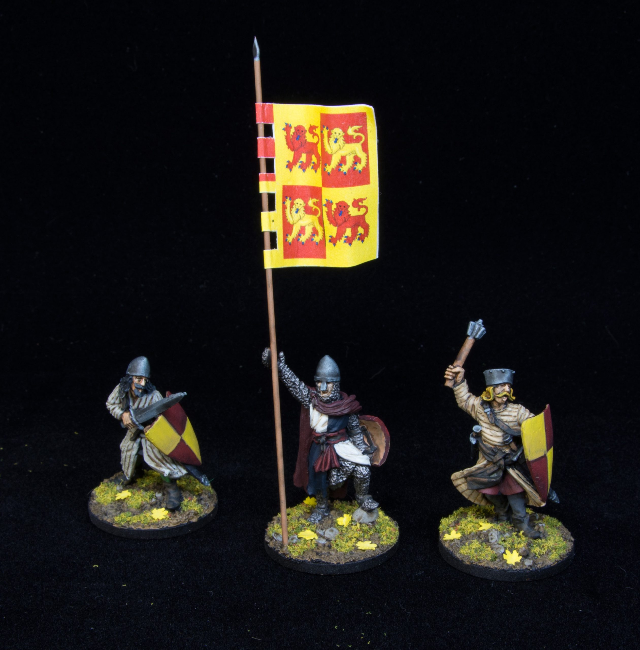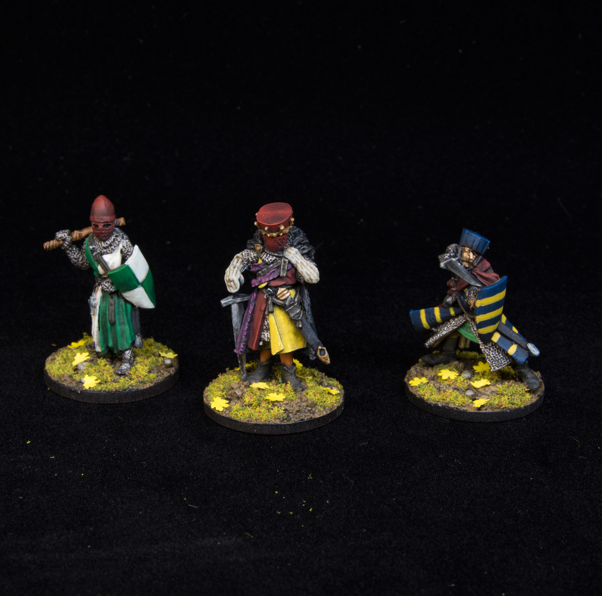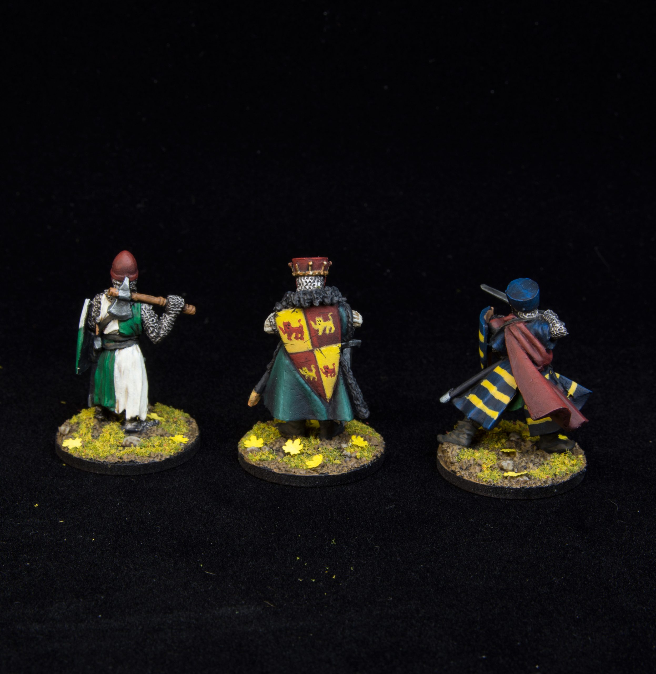 All the squires then got shields in the same red/ yellow quartered heraldry but without the lions, they would have been household knights historically. The knights errant then each got their own heraldry to make them stand out from the leader but not too fancy.