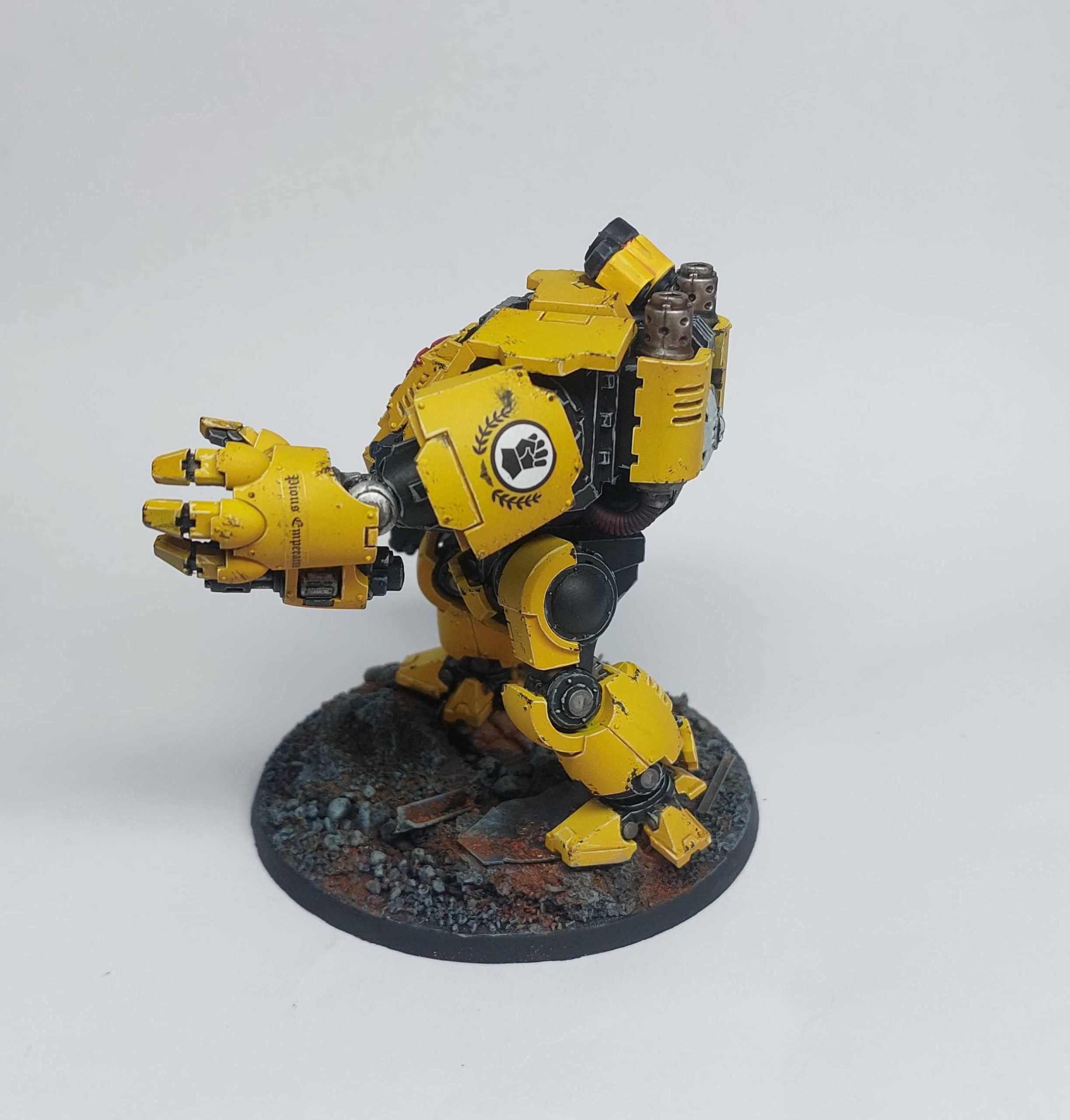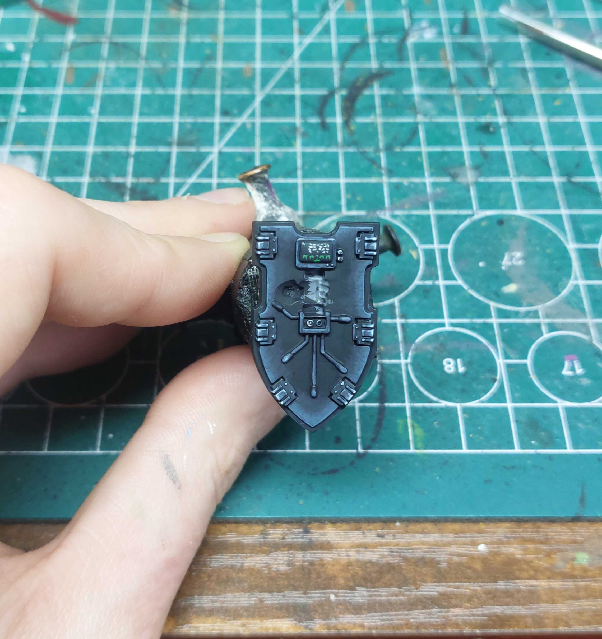 Painting this guy was pretty straightforward yellow was done via airbrush (brown-white-yellow) and the rest with brush. The silly little screen on his shield got a space invaders theme, sadly this is nigh invisible now.