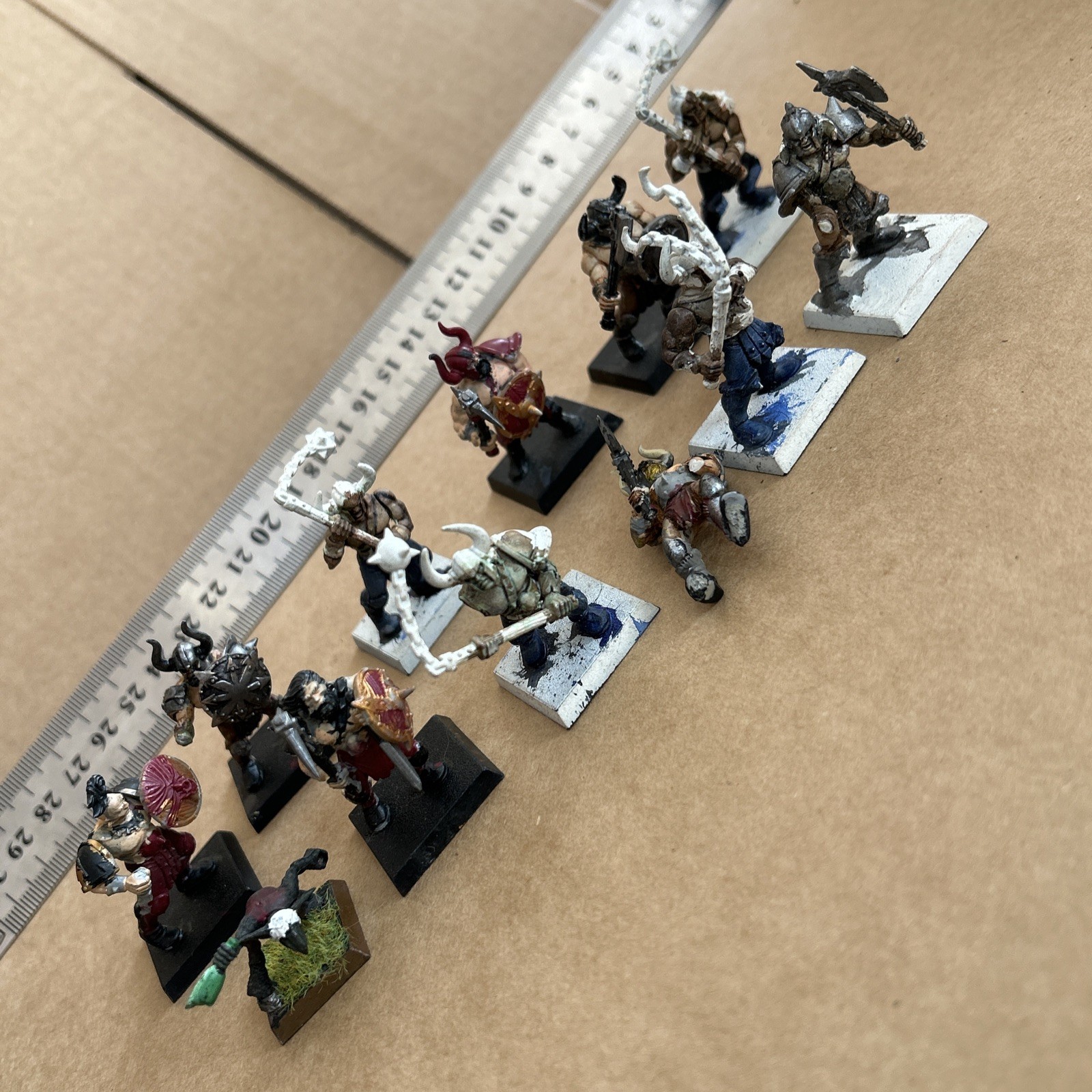 Next the berserkers who are metal Ral Partha Europe miniatures from the Chaos Imperium line. More traditional 28mm proportions here so not as tall as the nearer 32mm of the Warlord miniatures so I stuck them onto GW plastic bases rather than the flat Warlord rimmed ones I’m using in this project. Instantly taller and no longer looking too short next to their brethren.