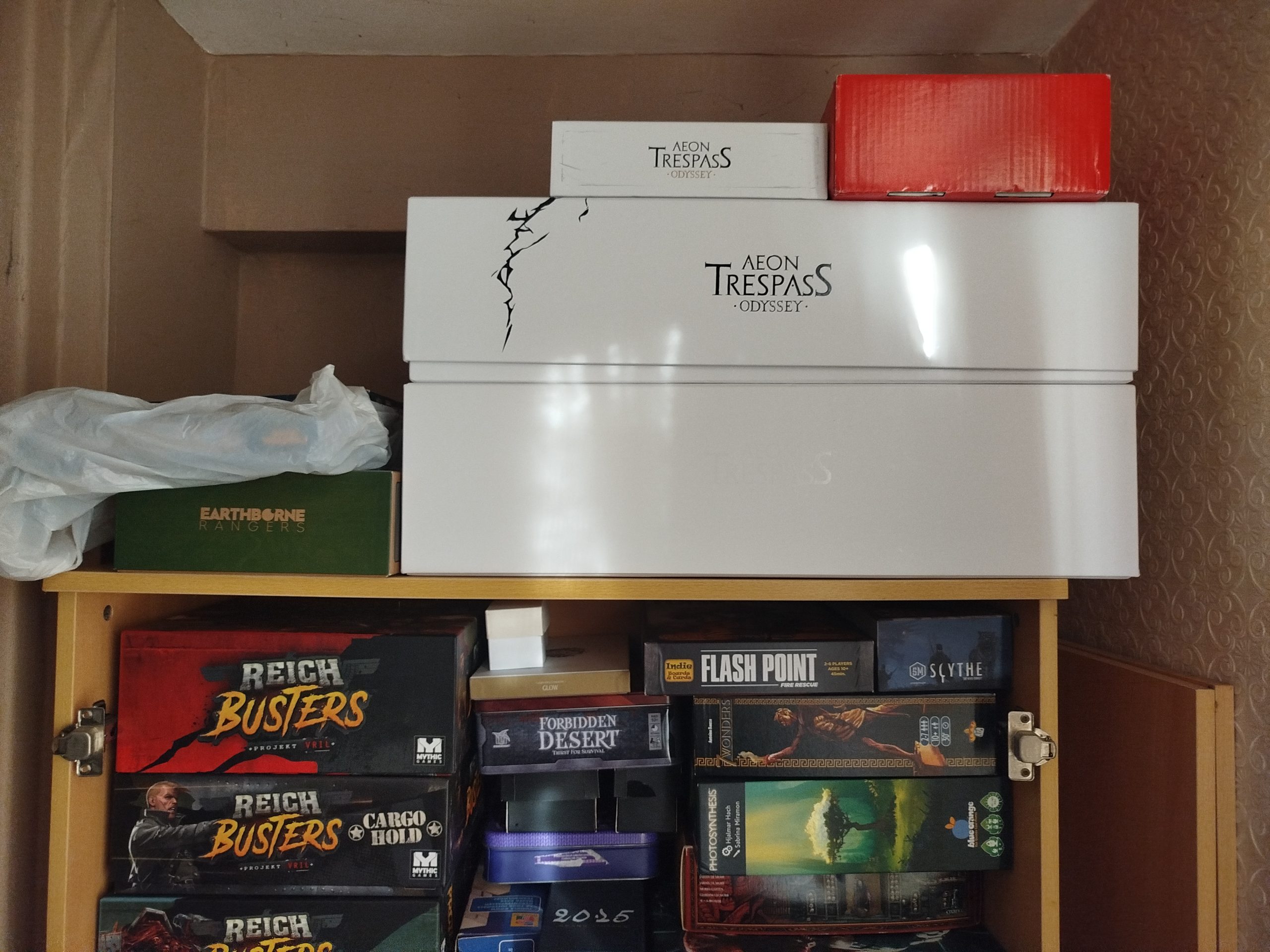 For those who are curious, here’s how big it is on a shelf. The 3 white boxes are the game and the Godforms box. The red box is my “saved game”. All the cards, character sheets, technologies, gears etc I’ve unlocked or bought or built, all organised in a way that will hopefully let me restore my game once Skyward Odyssey arrives. This worked between C3 and C4.