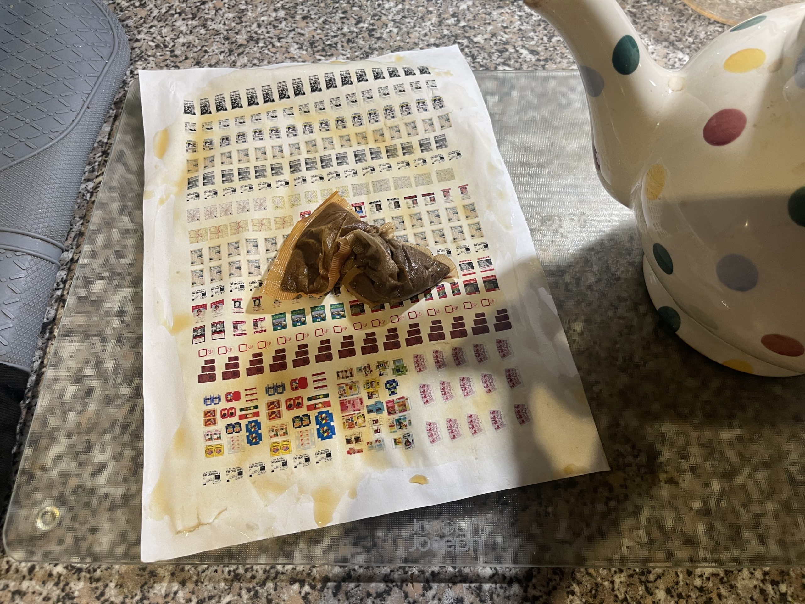 printed it off and tea stained it to get rid of the harsh white paper colour, this is a necessary step i feel to stop the jarring that would occur with fresh white paper. make sure the tea bag you use hasn’t been made in a mug with milk added, it will go horribly mouldy. Be civilised and use one from a full pot of tea.