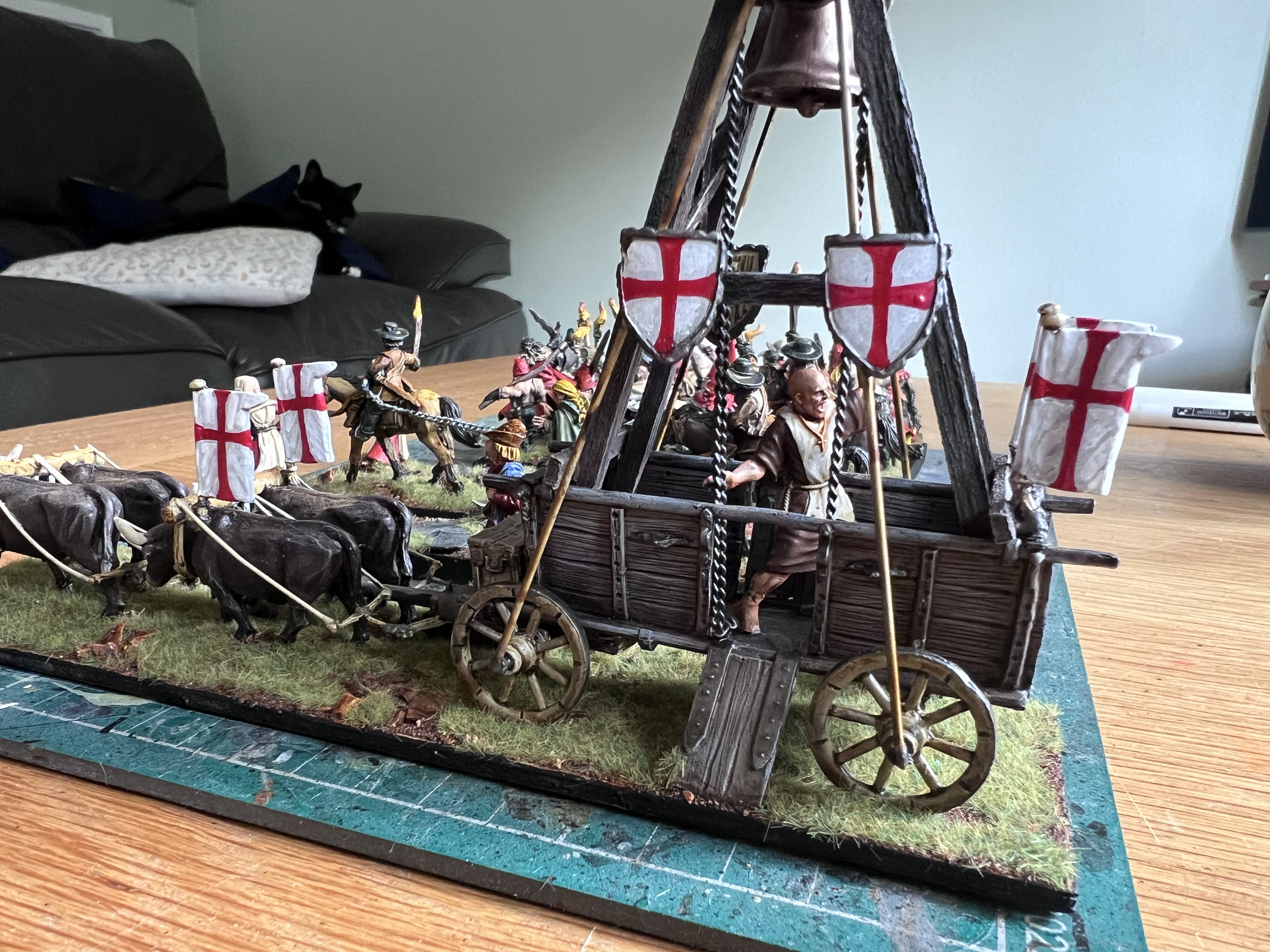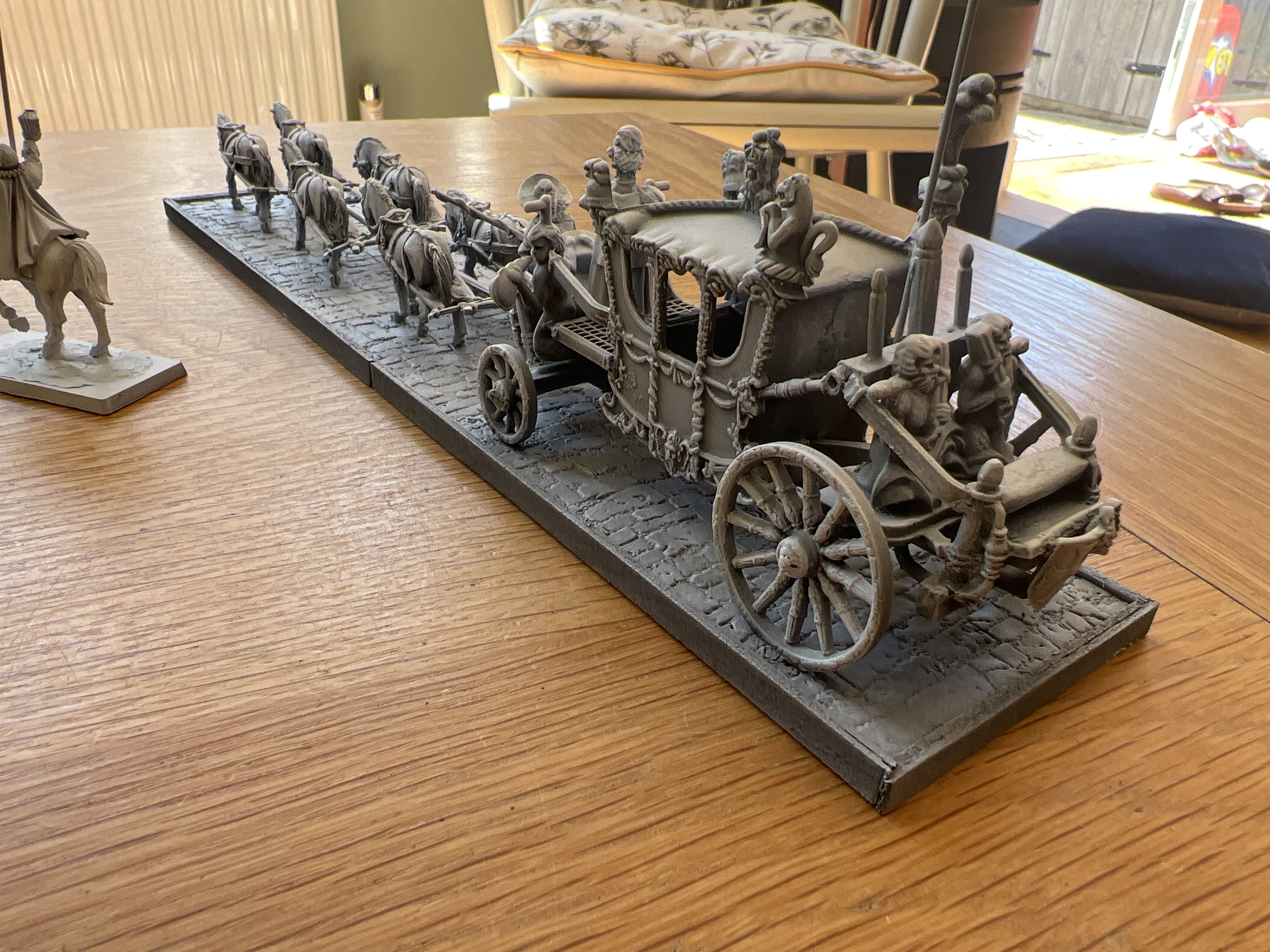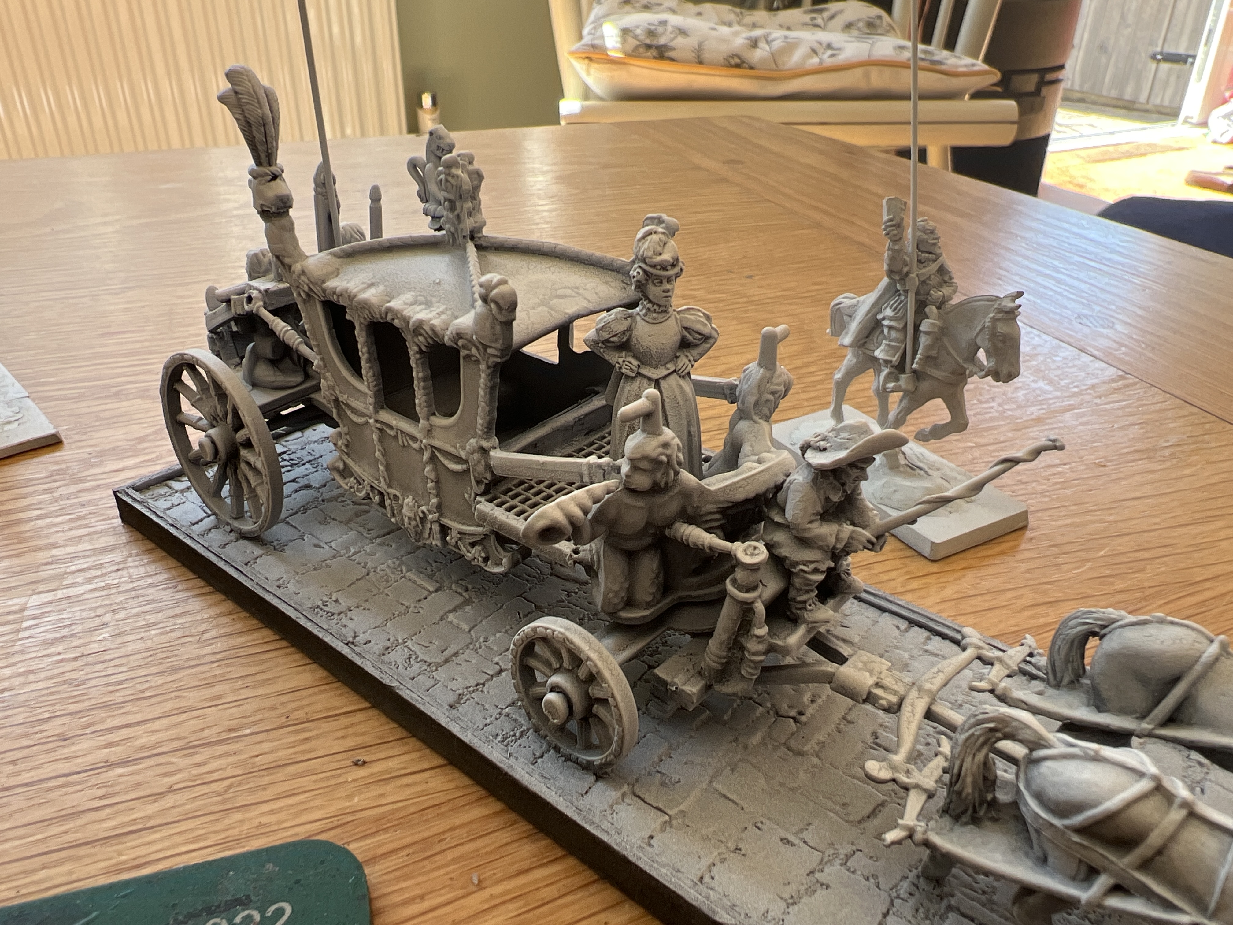 I’ve used wall paper on the base that was stuck down with carpet spray adhesive, the instant stick stuff. I’ve cannibalised heavily from the warlord games generals coach kit, warlord kindly cast up just the horses and limber bits. The gap filling went well enough as I can’t see the join in the die cast. Trim me bushes!