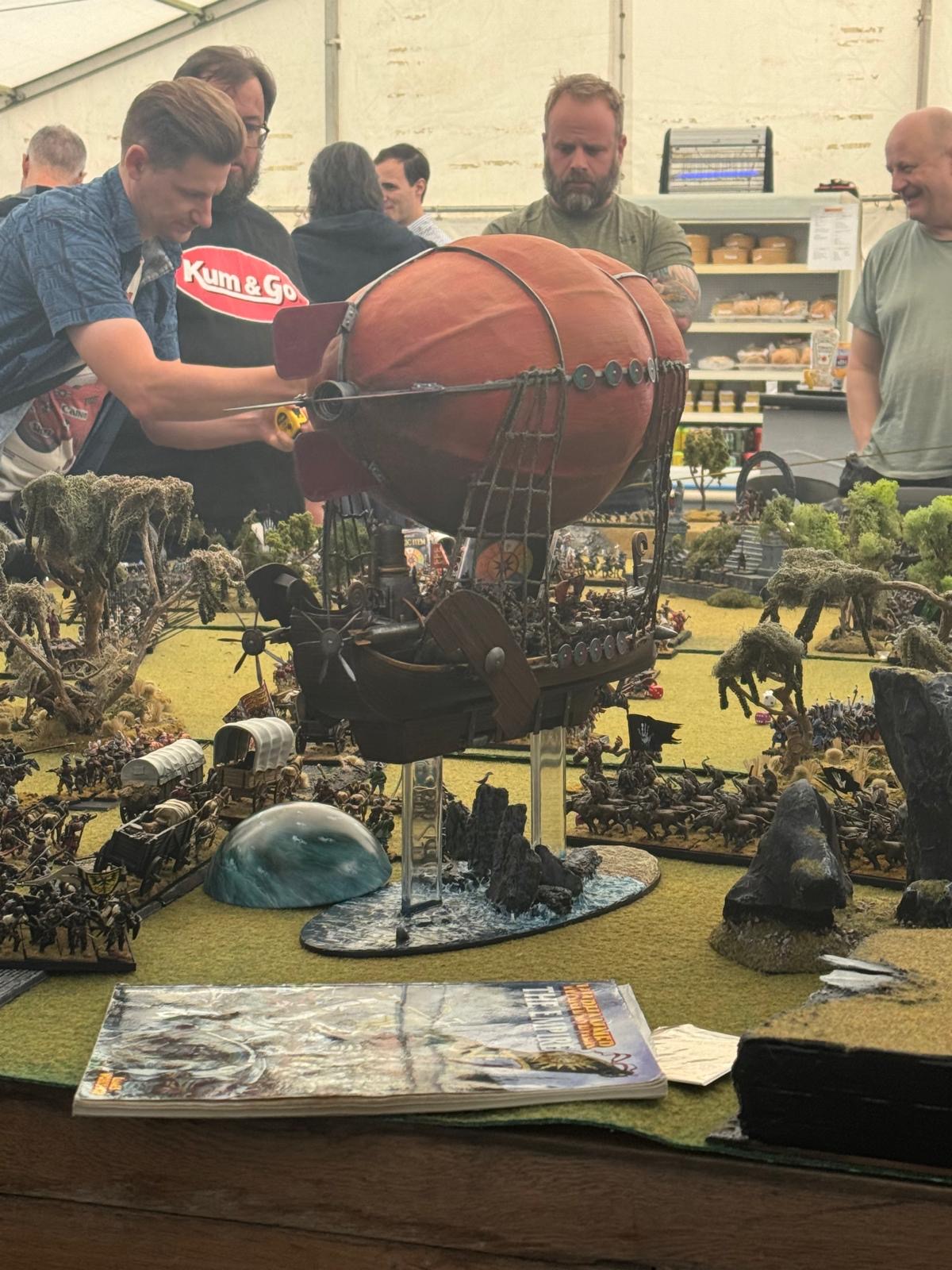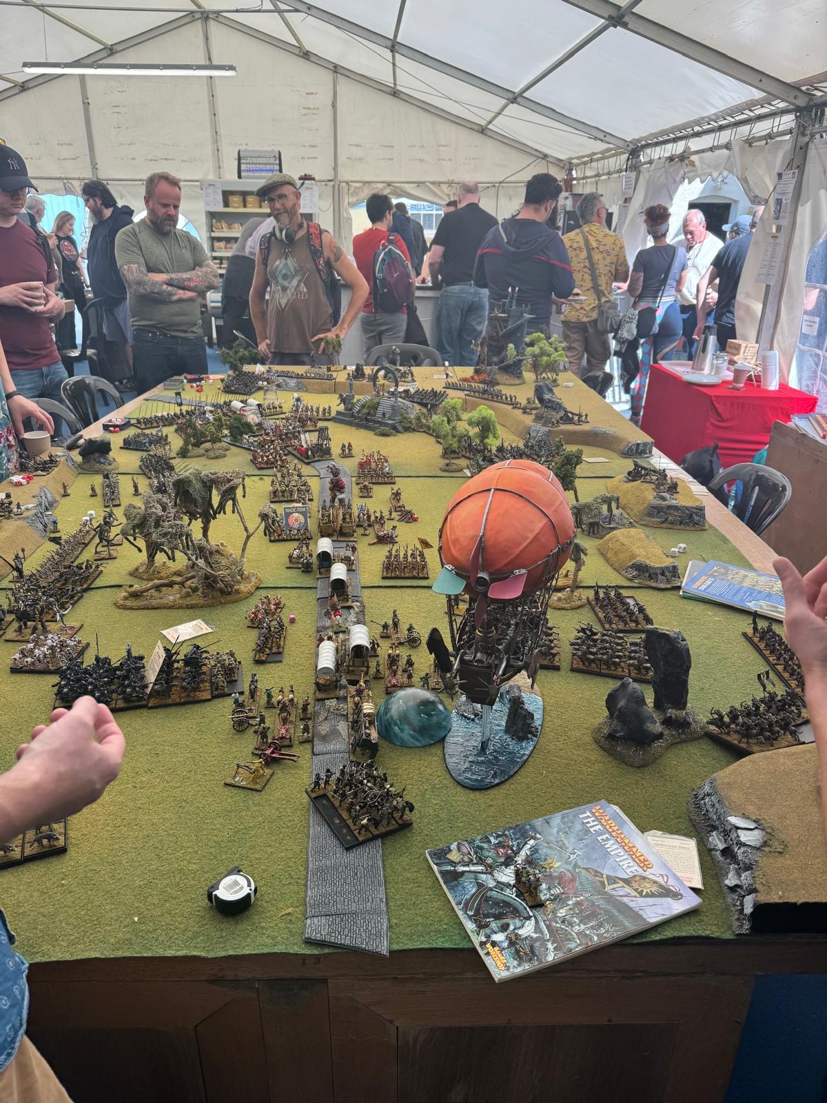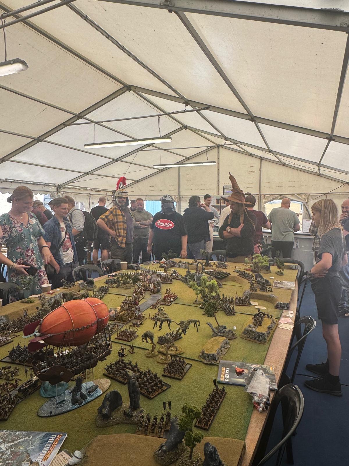 Lastly, the Cromwell steam tank was held aloft by the hand of Gork for two turns until that spell was destroyed. Then the orks chose brain bursta on the steam tanks engineers, rendering them immobile and without driver but intact as a tank, until that spell was destroyed too. The Dwarf airship valiantly offers to let the remaining engineer on foot, right at the back of the column, rappel up to the airship and get dropped off at the head of the column and get the steam tank rolling again. The brave engineer failed his rappel test twice, two ones in a row, and killed himself trying to climb up the rope.