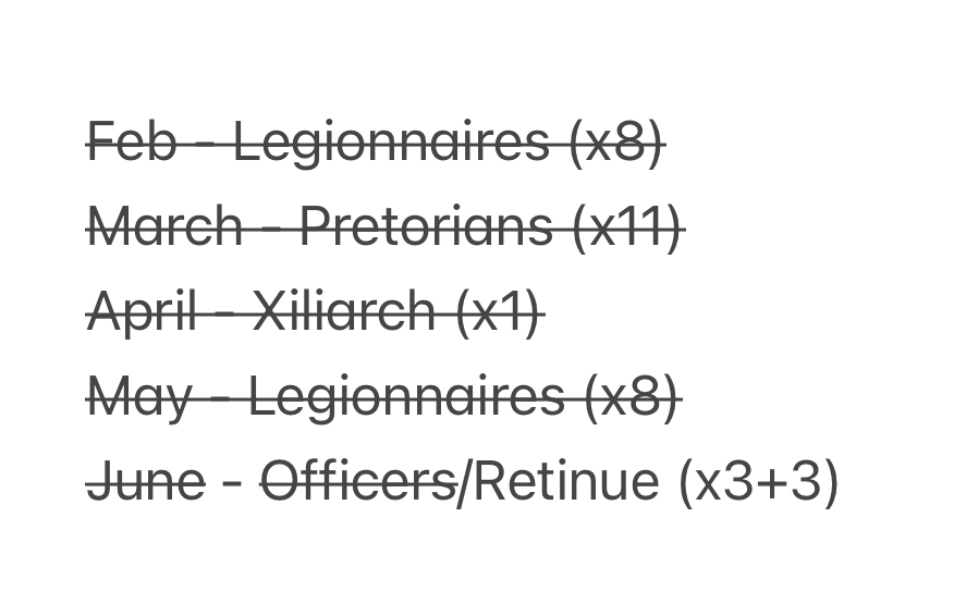 For the rest of May I couldn’t find the motivation to pick up a brush. Maybe I took on too much at once with the larger Praetorian regiment. Or maybe it was the prospect of painting a unit that was all but identical to one I had previously worked on. Either way it was all I could manage to get the shields painted. Meanwhile the legionaries sat on my painting tray untouched.
