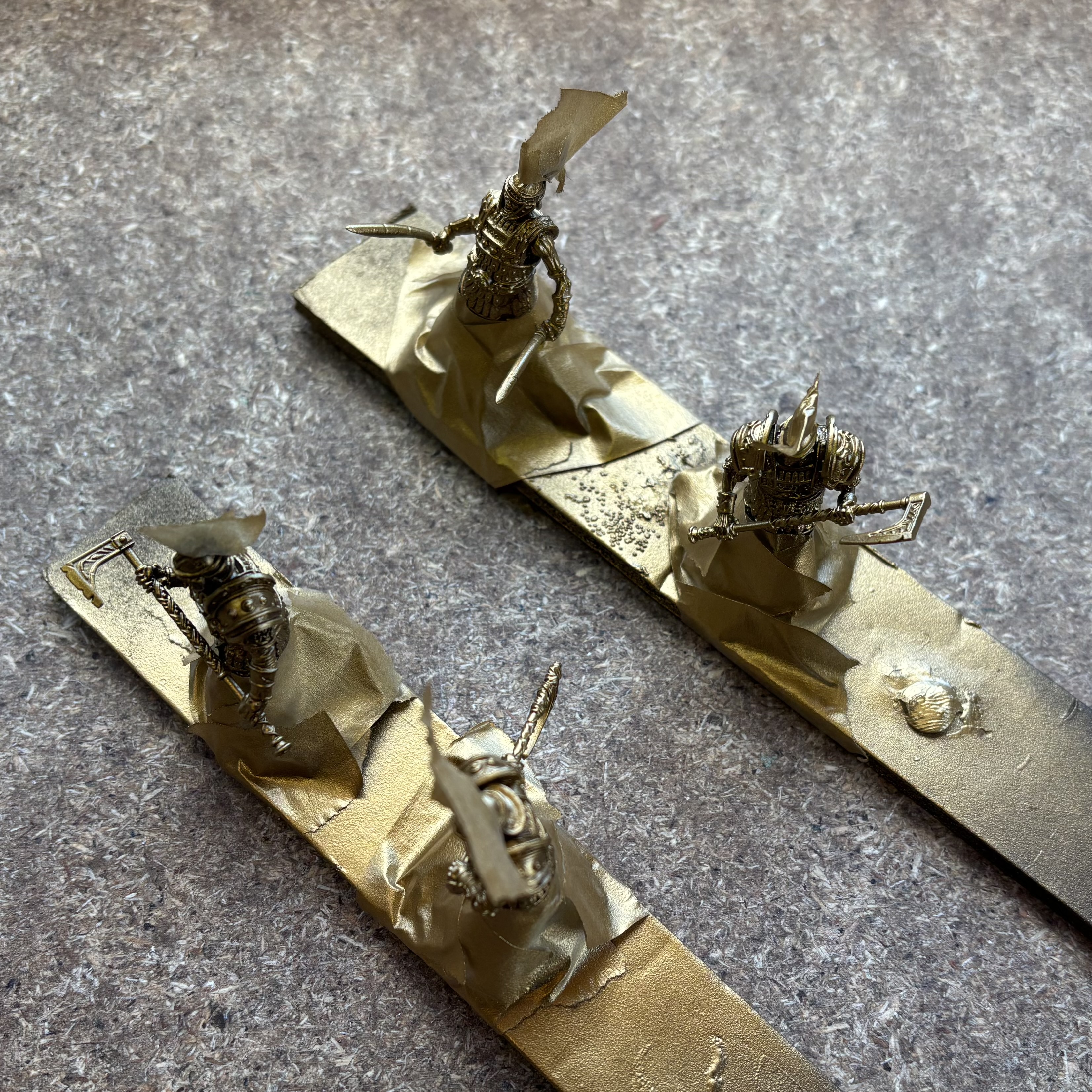 I resolved to get the Xiliarch’s Retinue painted before I tackled anything else. I started with a two stage prime of Retributor Gold over Halfords mat brown primer, as I had with all of the models to date.