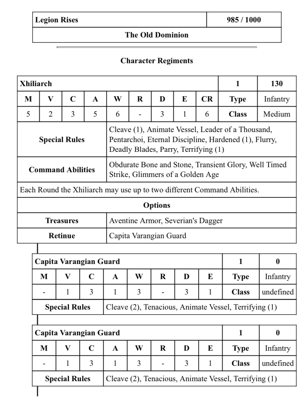 In the previous edition, a retinue was made up of any combination of Bodyguard, Duelist and Warrior. Cool though this was, the three categories were basically the same across all factions. Under the new system, retinues would be comprised of existing troop types from the host faction, varying from Character to Character. In the case of my Xiliarch, this meant a choice between Athanatoi and Varangian.