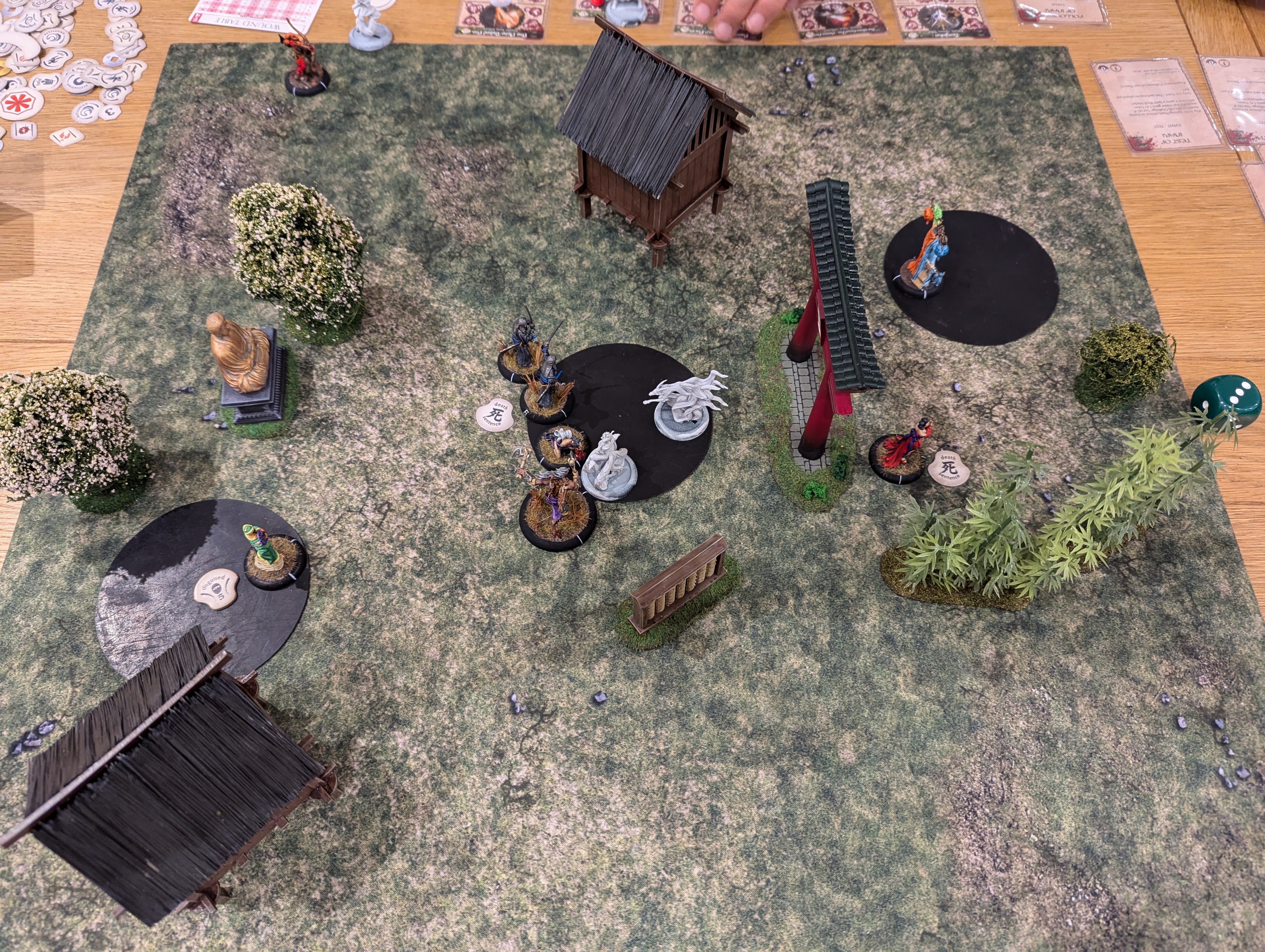 My son wins the initiative roll and gets stuck in with Batsu’s Ki feat Forbidden Censure which places 3 death sentences on Tenbatsu. A death Sentence marker gives any attacker a +1 Melee pool dice which is very powerful however Tenbatsu is pretty formidable anyway, so I’m not too concerned.