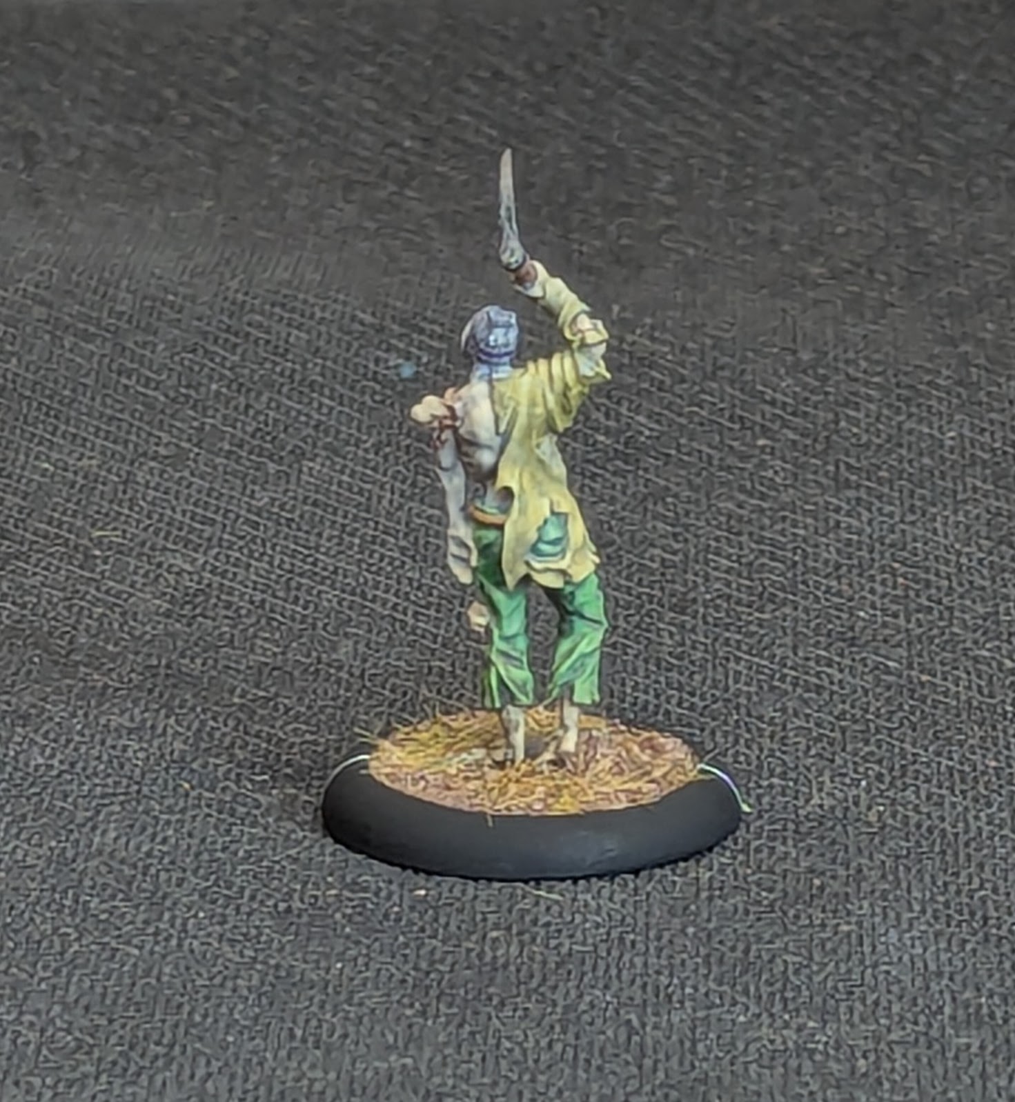 Being a zombie, I wanted to give the model a dirty look – something I will apply to future zombies that I will add to my cult. I also wanted the skin to have a greyish look so I painted this with a light skin tone and then highlighted this with the light skin tone mixed with a light grey. To get the grey look, I glazed this a couple of times with a mid grey.