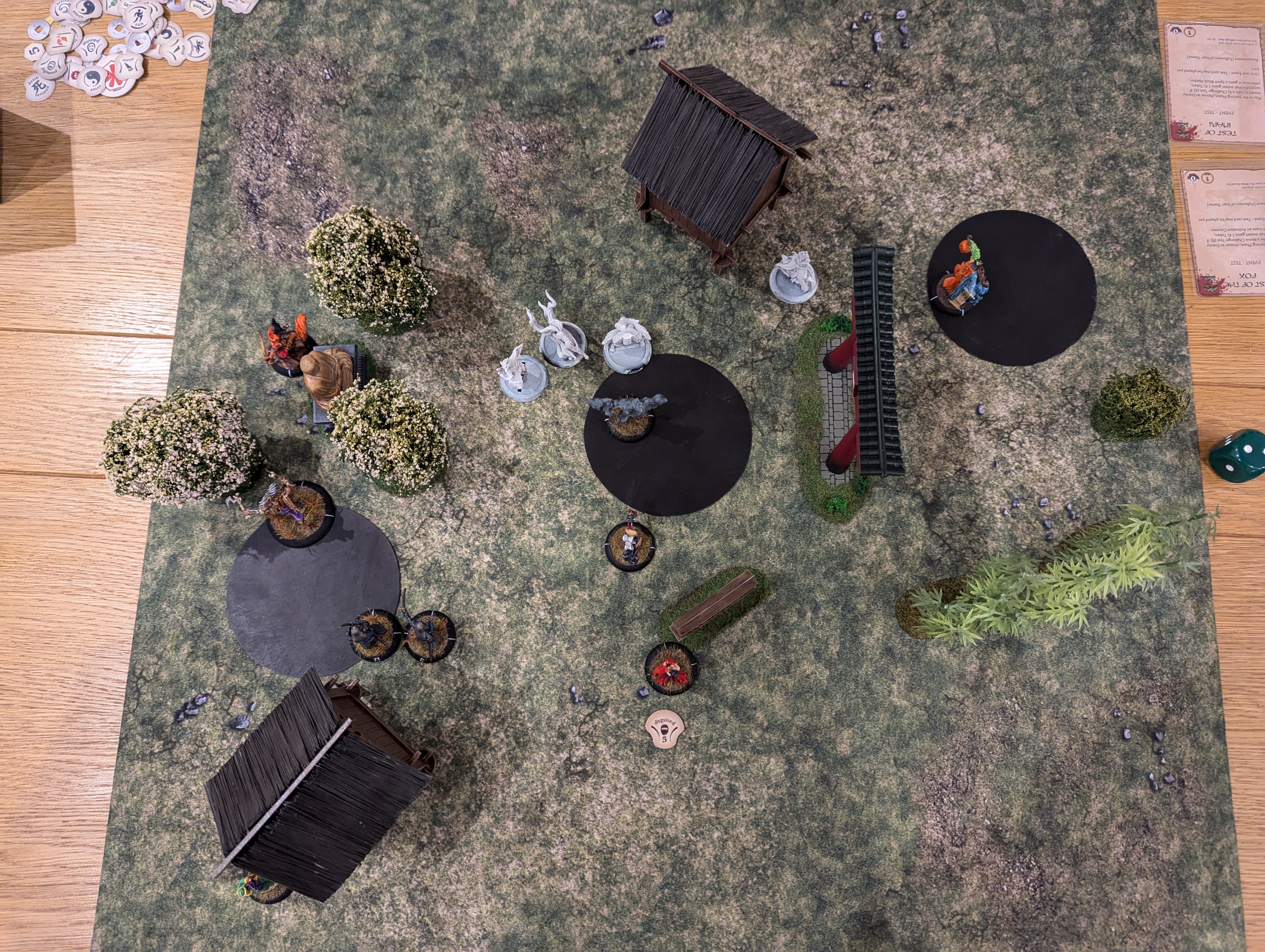 For this game, we have three shrines deployed along the centre line of the board at 6” internals. They all start neutral but models can expend an activation when in BtB with the shrine to influence it from unfriendly to neutral or from neutral to friendly. At the end of Turns 2, 4 and 6, whoever has the most friendly shrines will gain a Victory Point.