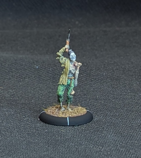 The mask (all zombies in Bushido have a cult death mask attached) I wanted to look more pristine, so this was painted off white and given a sky grey shading. I’ve then highlighted with white. The sickle was a mid brown with a wash and then highlighted with a light brown, gunmetal for the blade with a nuln oil wash.