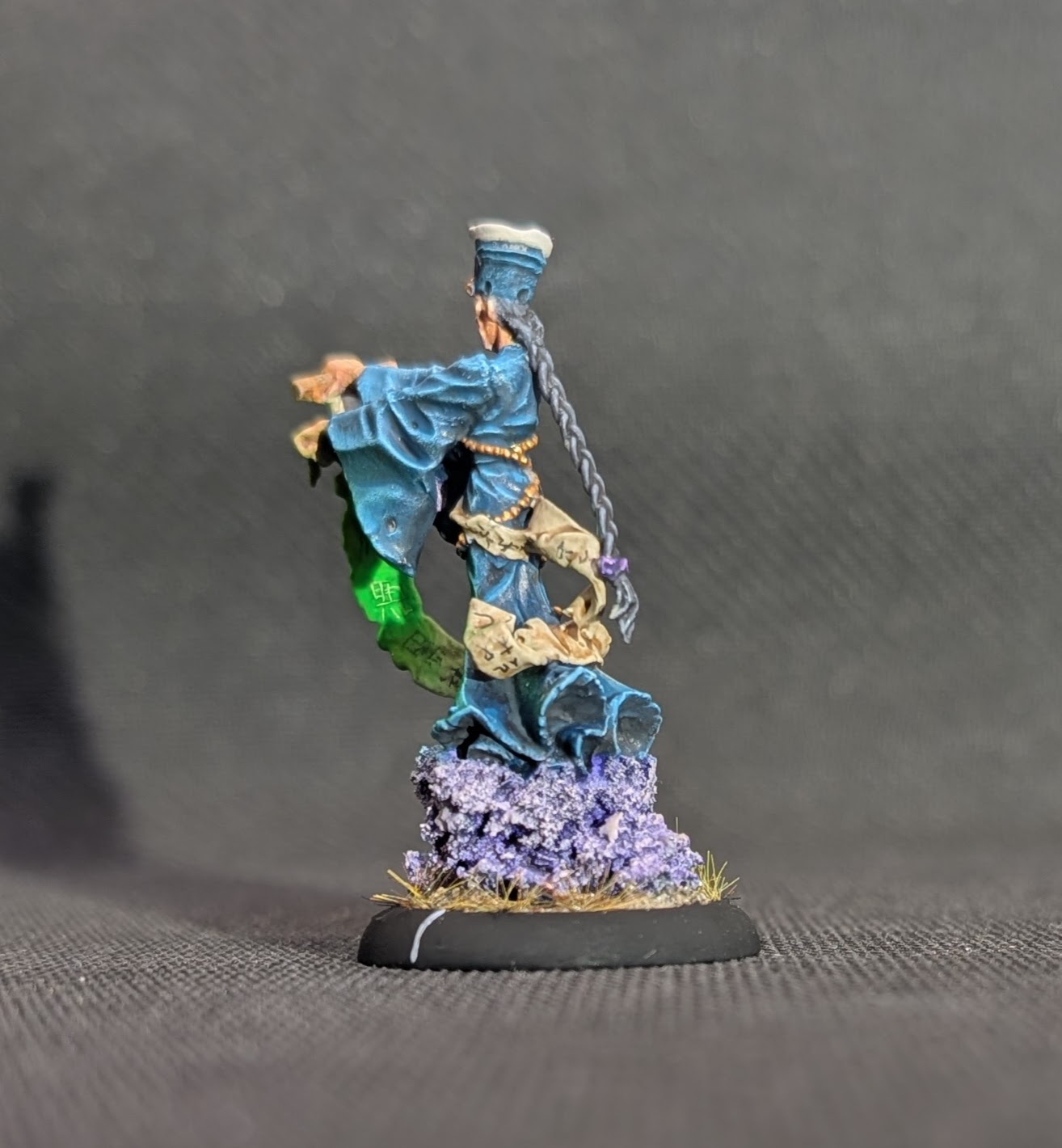 I used a Holy White for the cloth head wear with a light white dry brush. I painted the skin with a light flesh tone and then applied a wash. Once dry, I highlighted the raised areas. The blue was Royal Robes and then a light blue highlight. I think the model took a single evening to paint, so given the time investment, I’m very happy with the outcome.