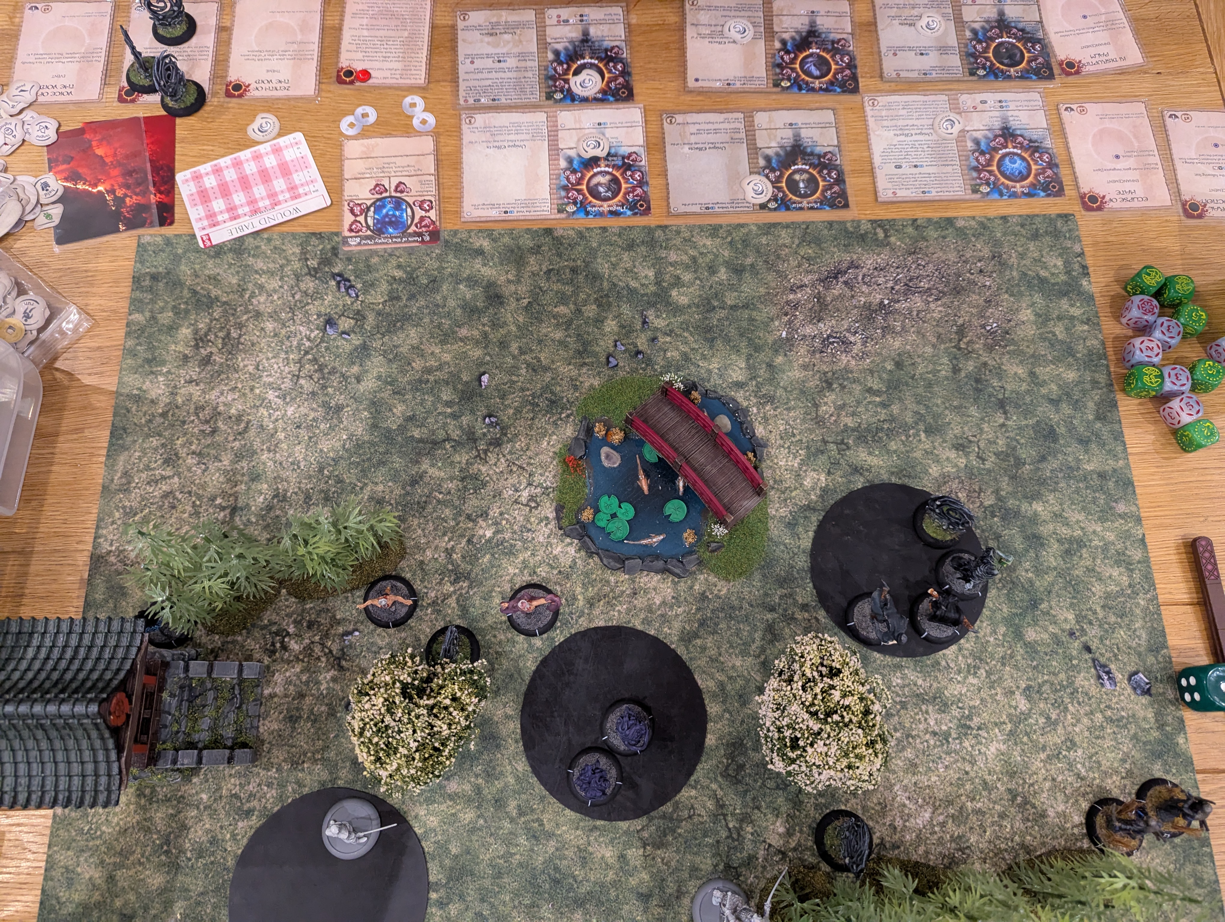 I wanted to try something different and, like a lot of games, there are always different ways you can put together your faction. In this case, I wanted to really lean into the fire aspect, so selected Wanyudo and Waku the Soul Collector as they both dish out fire tokens like confetti. I also took Ibara, a low cost model that can also dish out fire tokens. Mo Ises and Mokoti provide some useful Control shenanigans and Rokuro rounds out my faction, providing some combat abilities. I’ve also given Rokuro a couple of upgrade cards to improve his combat.
