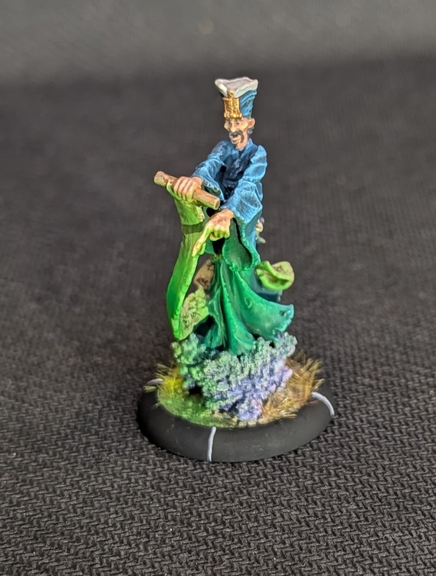 To paint him, I thought he made a good subject for me to carry on using the speed paints that I have. His robes got a Burnt Moss which I then lightly dry brushed with a light green. The armour was Hardened Leather (which I’m having mixed results with at the moment) and when it dried, I was happy enough with the outcome to leave it.