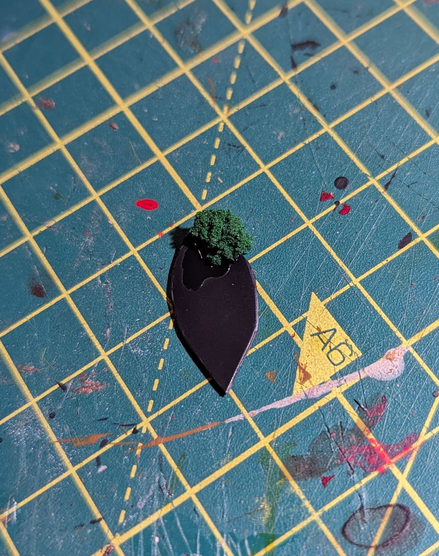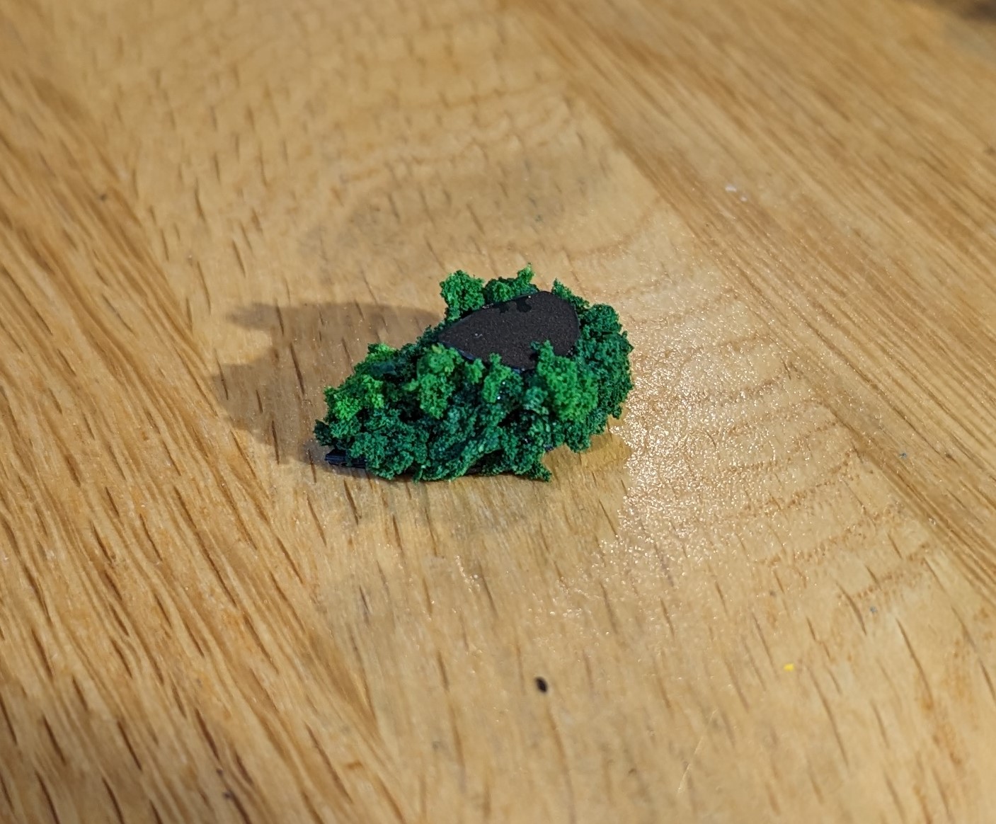 To make the cloud, I measured out two pieces of plasticard, the lower piece had to fit into/onto the standard 30mm base and the upper piece needed to align with the base of the model. This done, I took some foam clump foliage and tore this into small pieces and began glueing this to the larger base. I used small amounts of super glue initially to hold this in place. Once I had a reasonable arrangement, I glued the top piece of plasticard on. Once dry, I then soaked the whole thing in PVA glue. This has the effect of properly holding everything in place while also hardening the foam, making it easier to paint. I cleverly took photos of these steps (see below) and then forgot to take photos of the remaining steps, so cleverness in my case is severely limited.