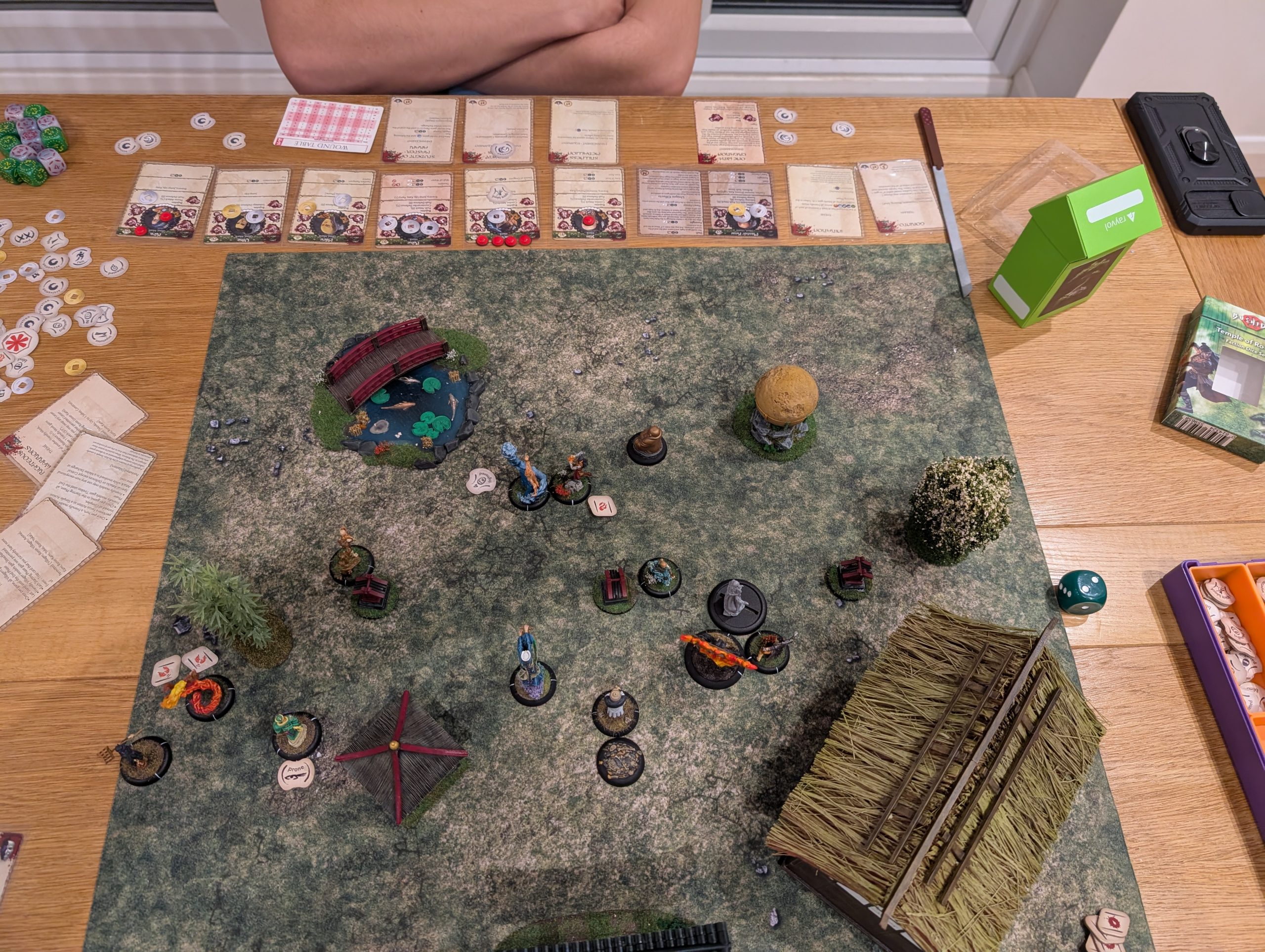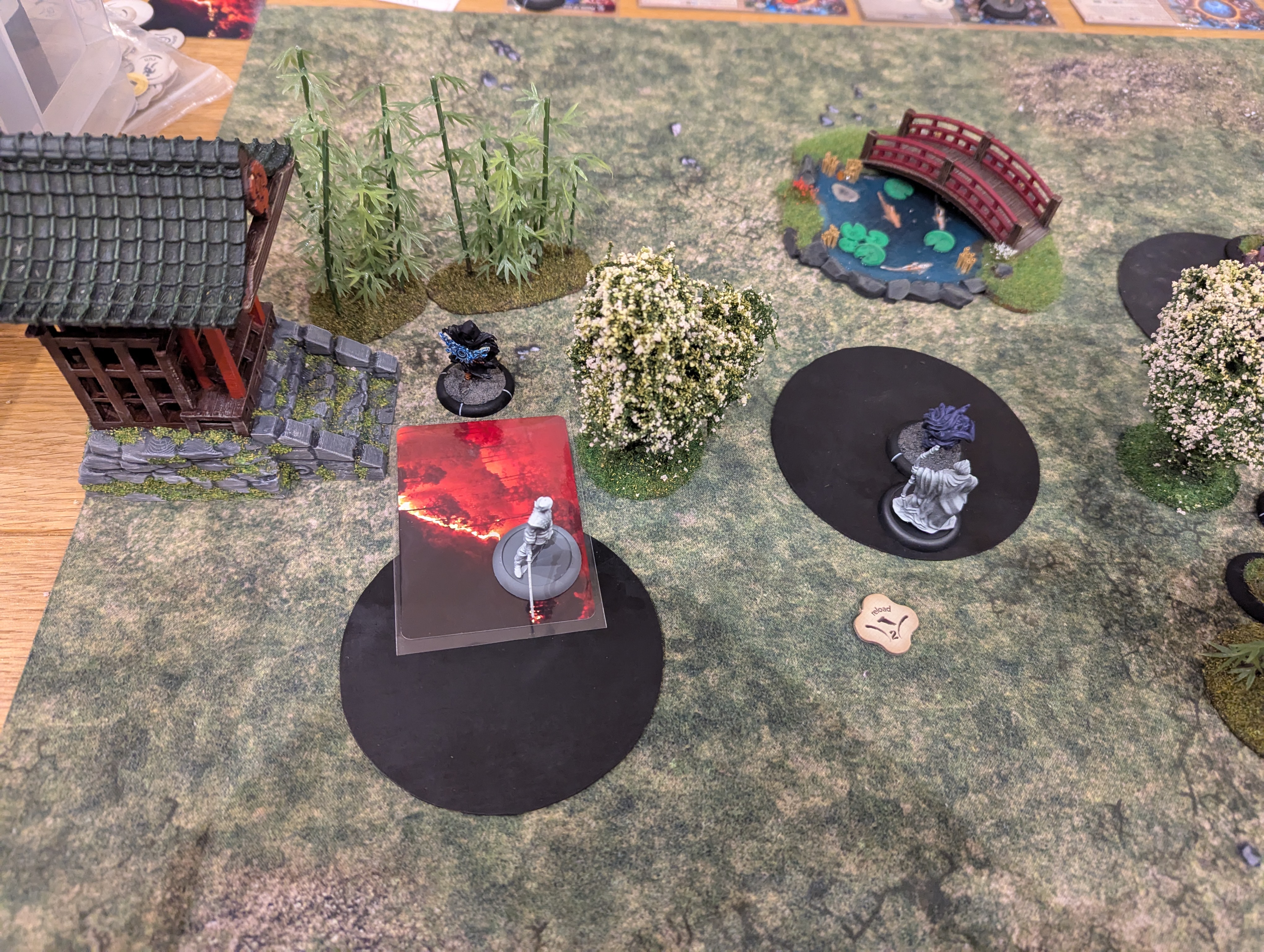 At the end of the turn, Sakura and Kira both succumb to a fiery death with their remaining fire markers. Koju and Yim both take a further wound each from their fire markers.