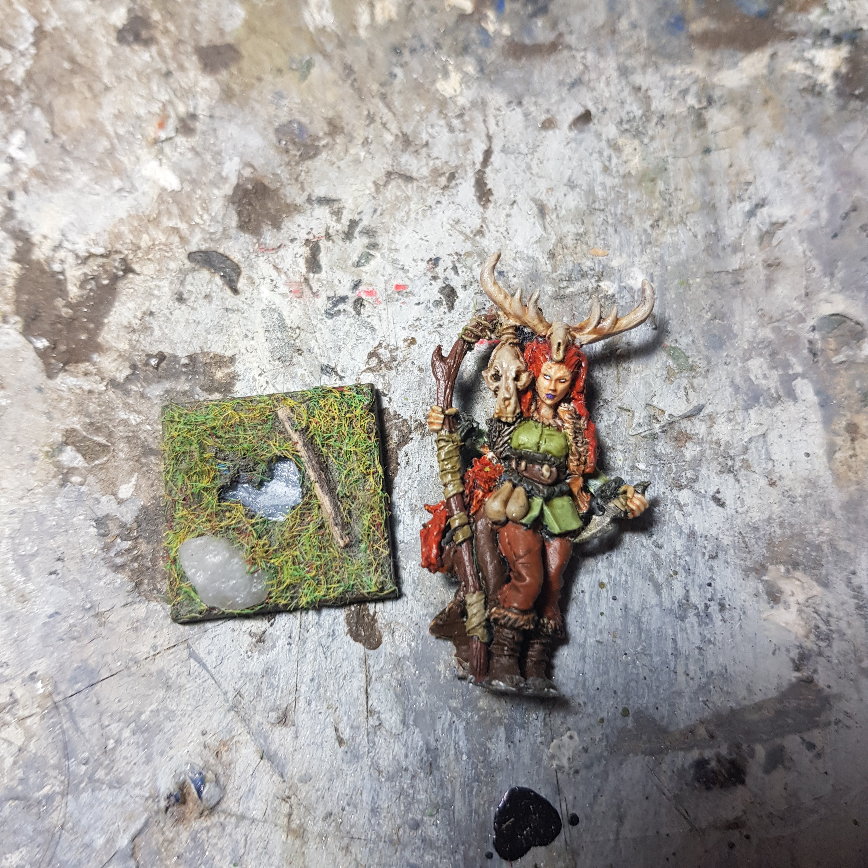 Before this I removed her from her old base, glued her onto a new one. Did the basing in my newer style, primed it by hand and you see where I am at now.