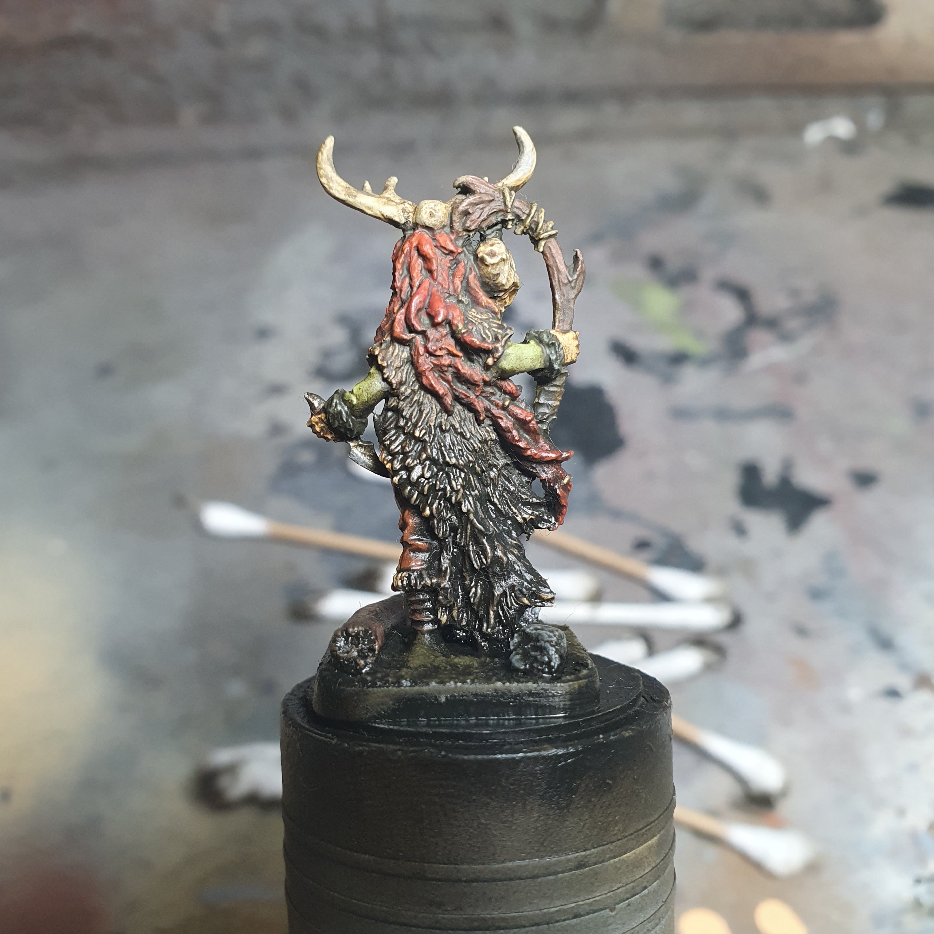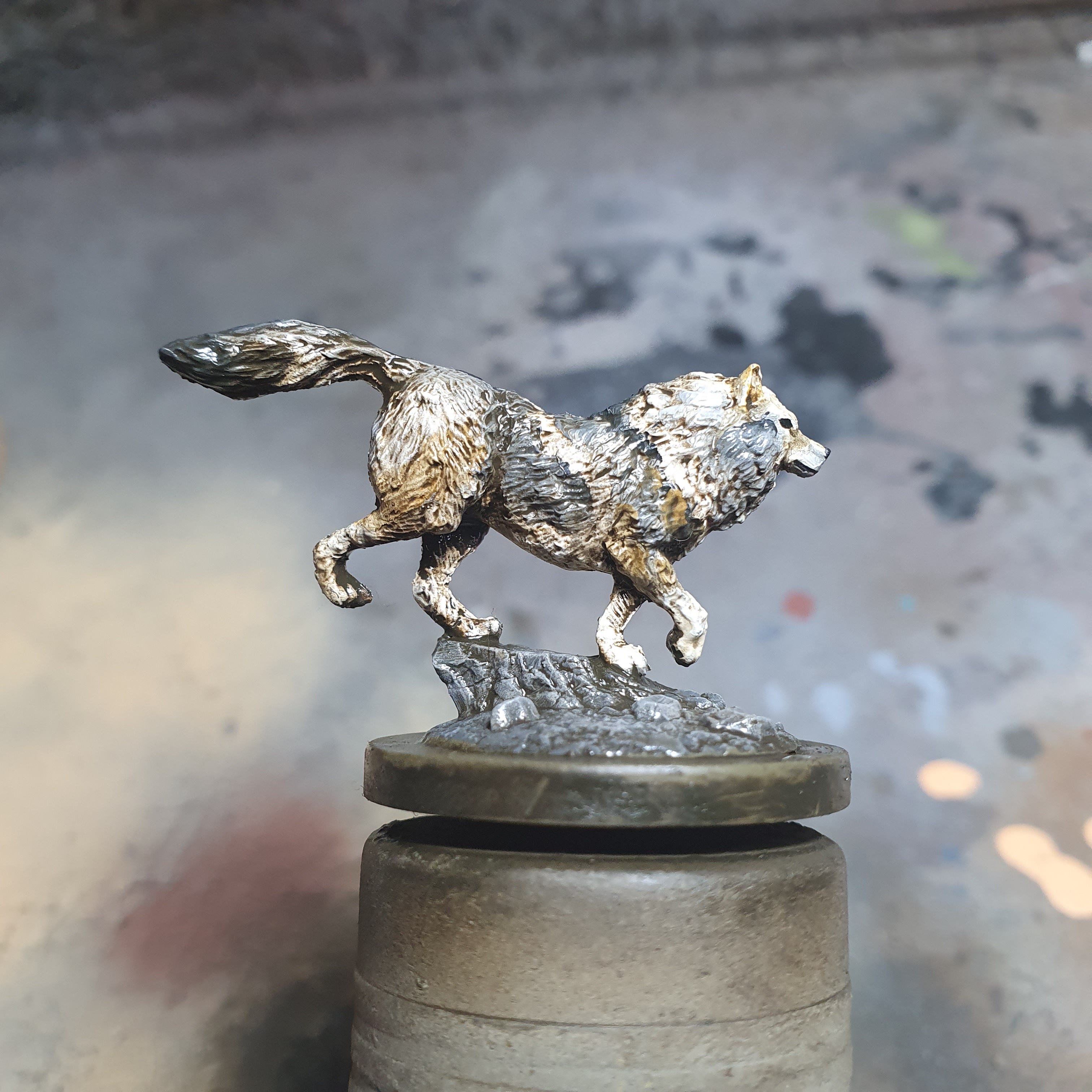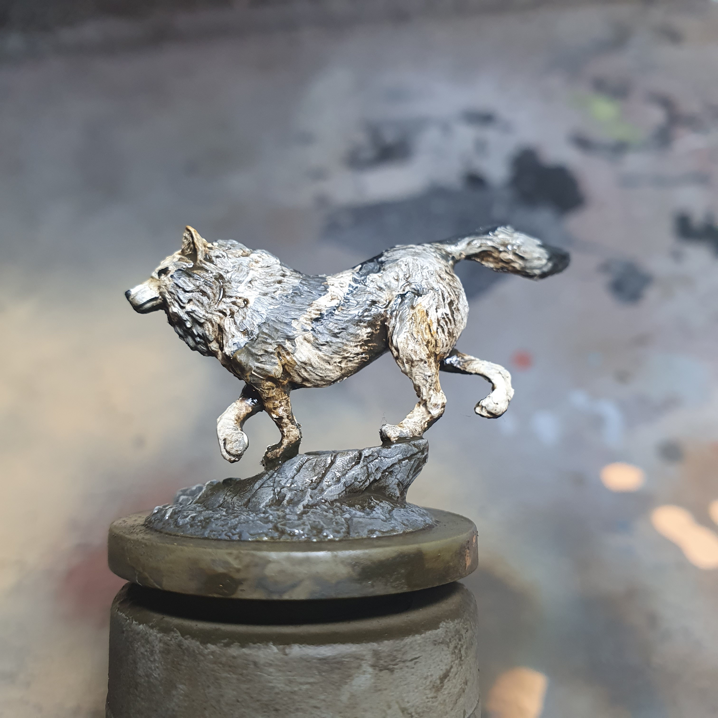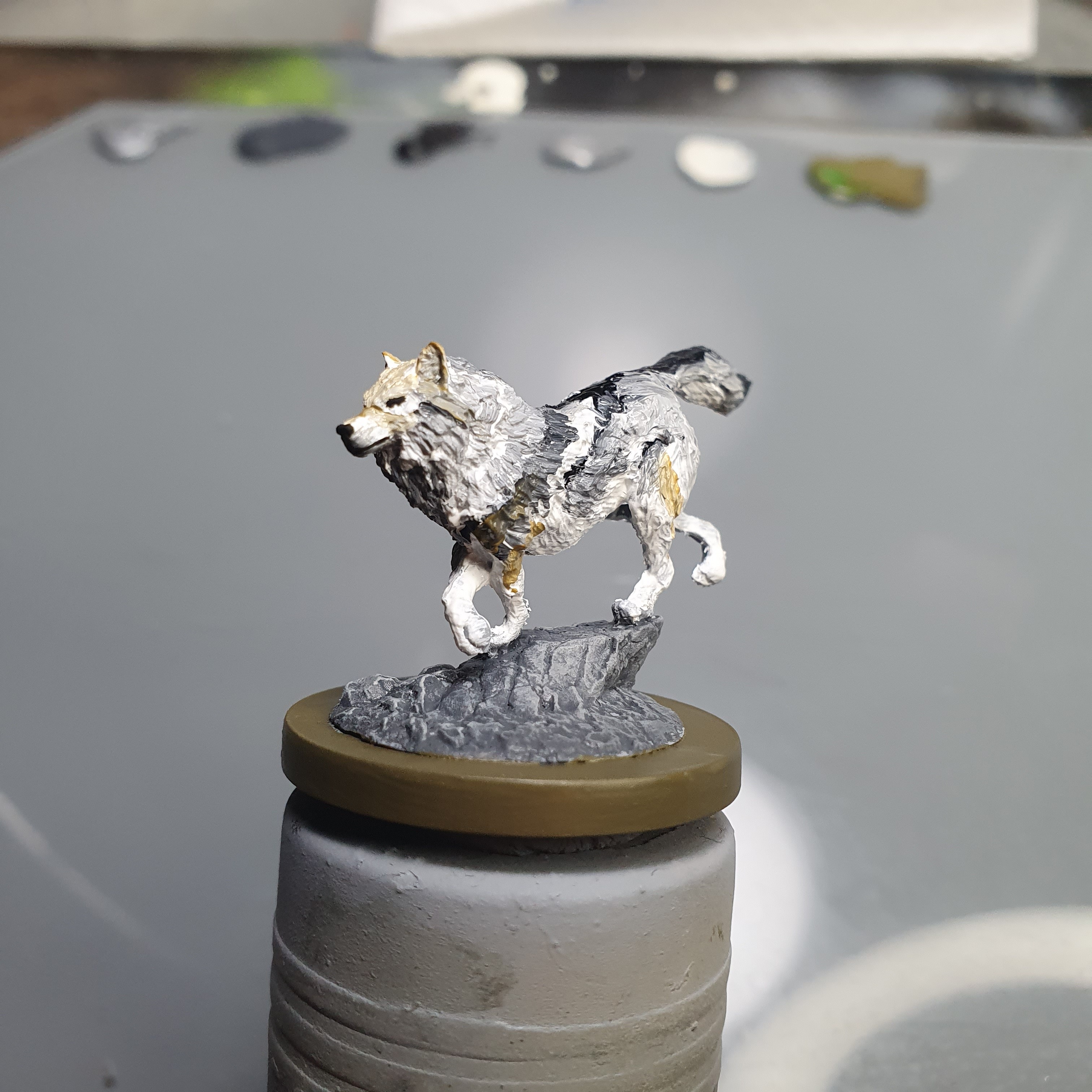 My first time doing fur with oil paints. I am quite happy with the result and will do the details with acrylics once this is cured. The model is the Wolf Companion from Atlantis Miniatures.