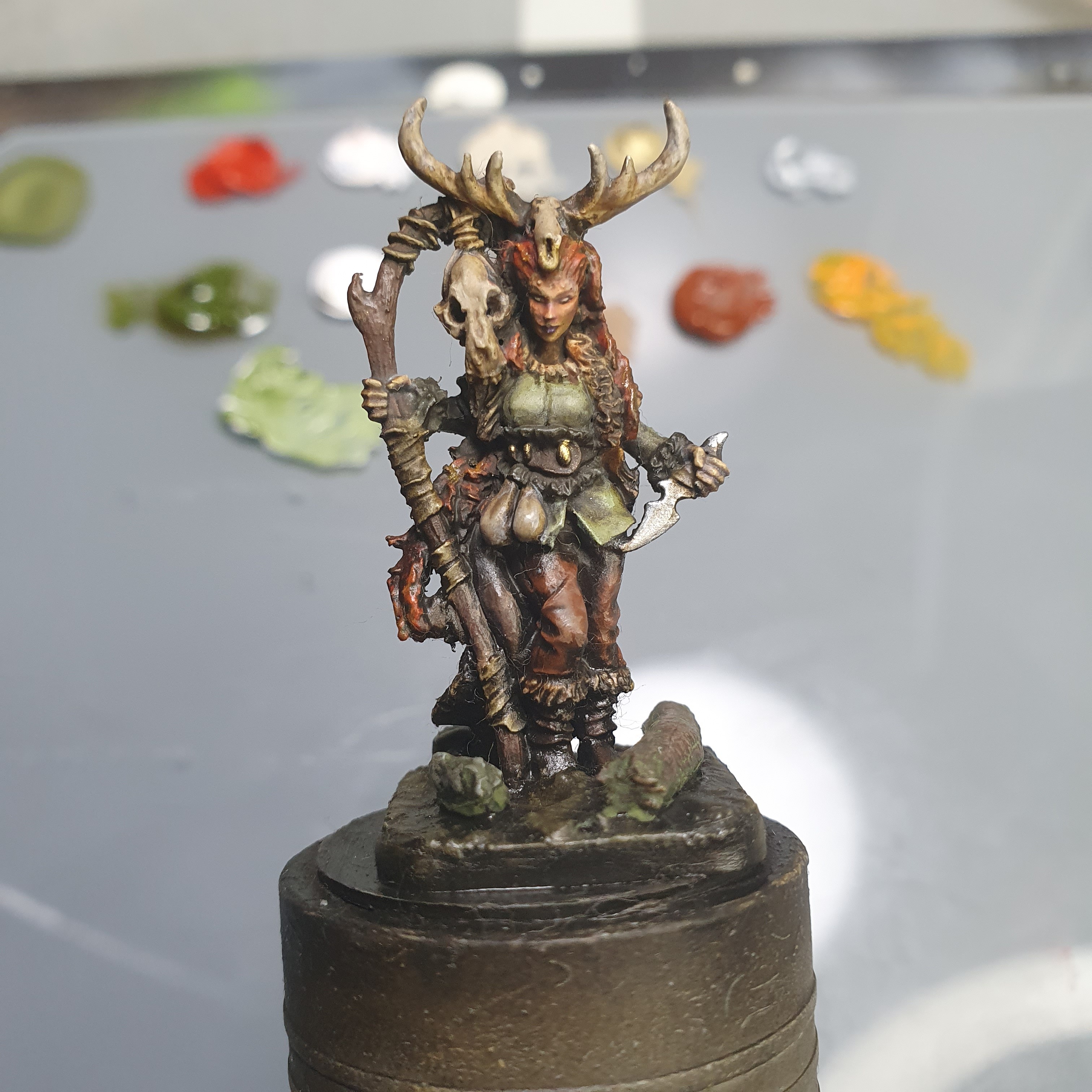 This is Frost Shaman Boudi from Hasslefree Miniatures, a model I painted before. I re-based her in my newer style and updating the paint job to my newer style without fully repainting the model. This is test piece for updating my whole fantasy army.
