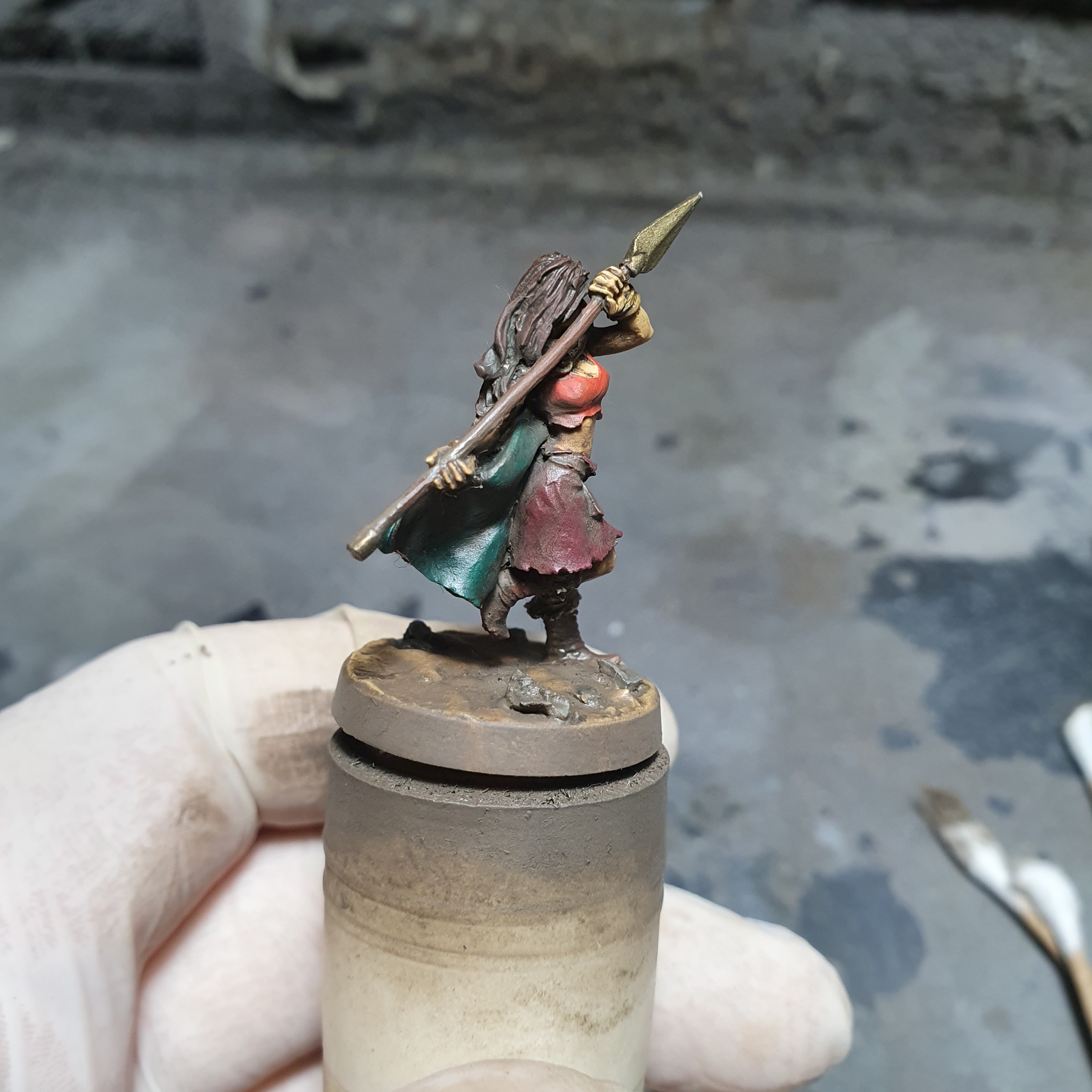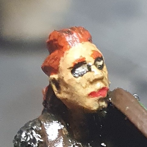 I got a layer of detailing done with oils and enamels on Haleth from Hasslefree Miniatures. While I was not expecting to fix the face, I have made some minor improvements to it.