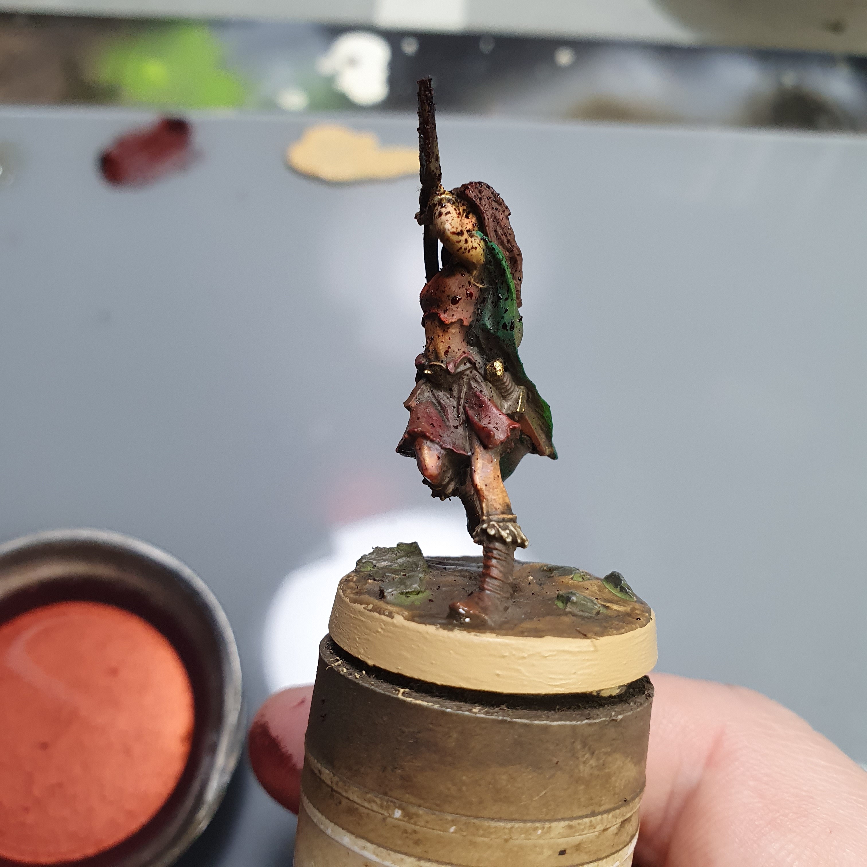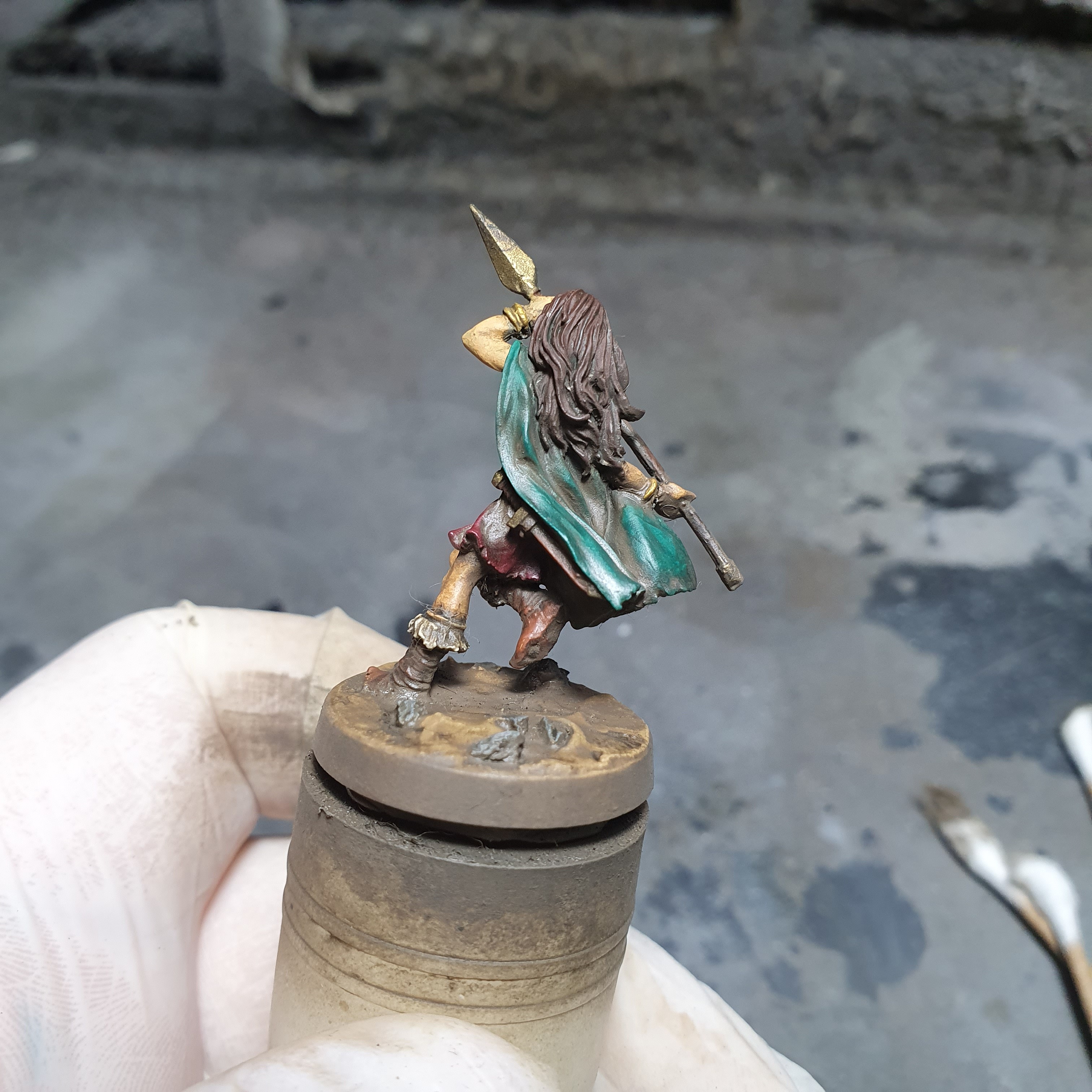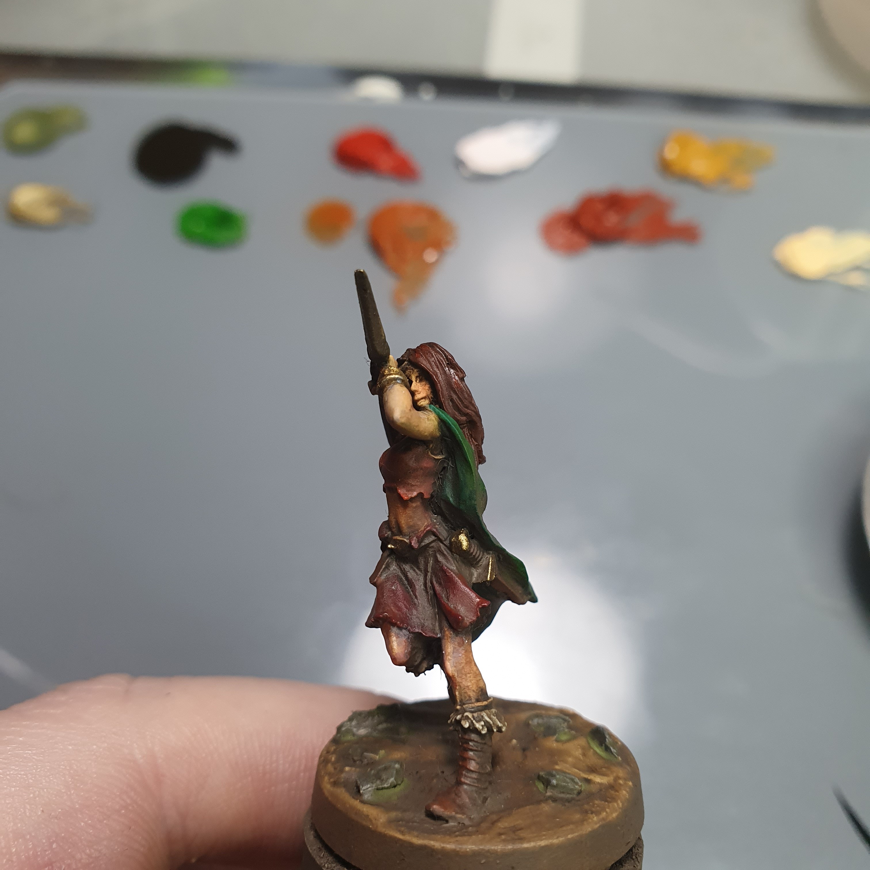 A layer of detailing got done on Boudi tonight. I added a bit of weathering to the base. And I enriched the tones on the skin, hair and cloth and highlighted the metallics. A lot of these touches don’t show well on camera sadly.