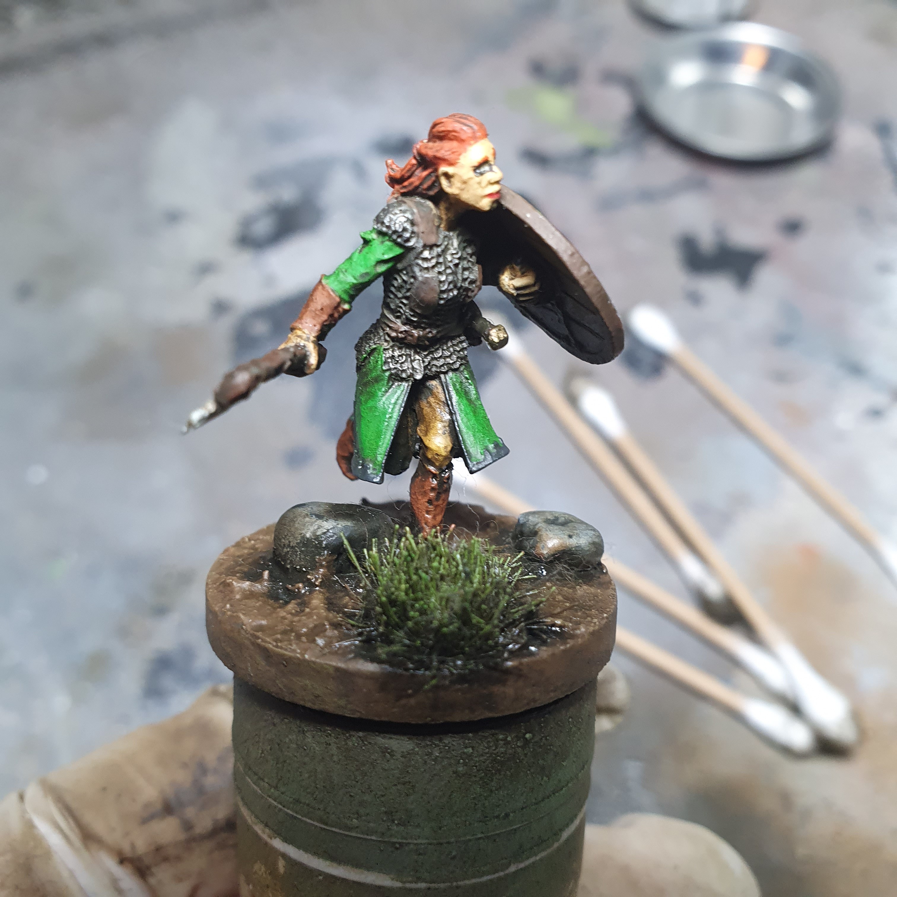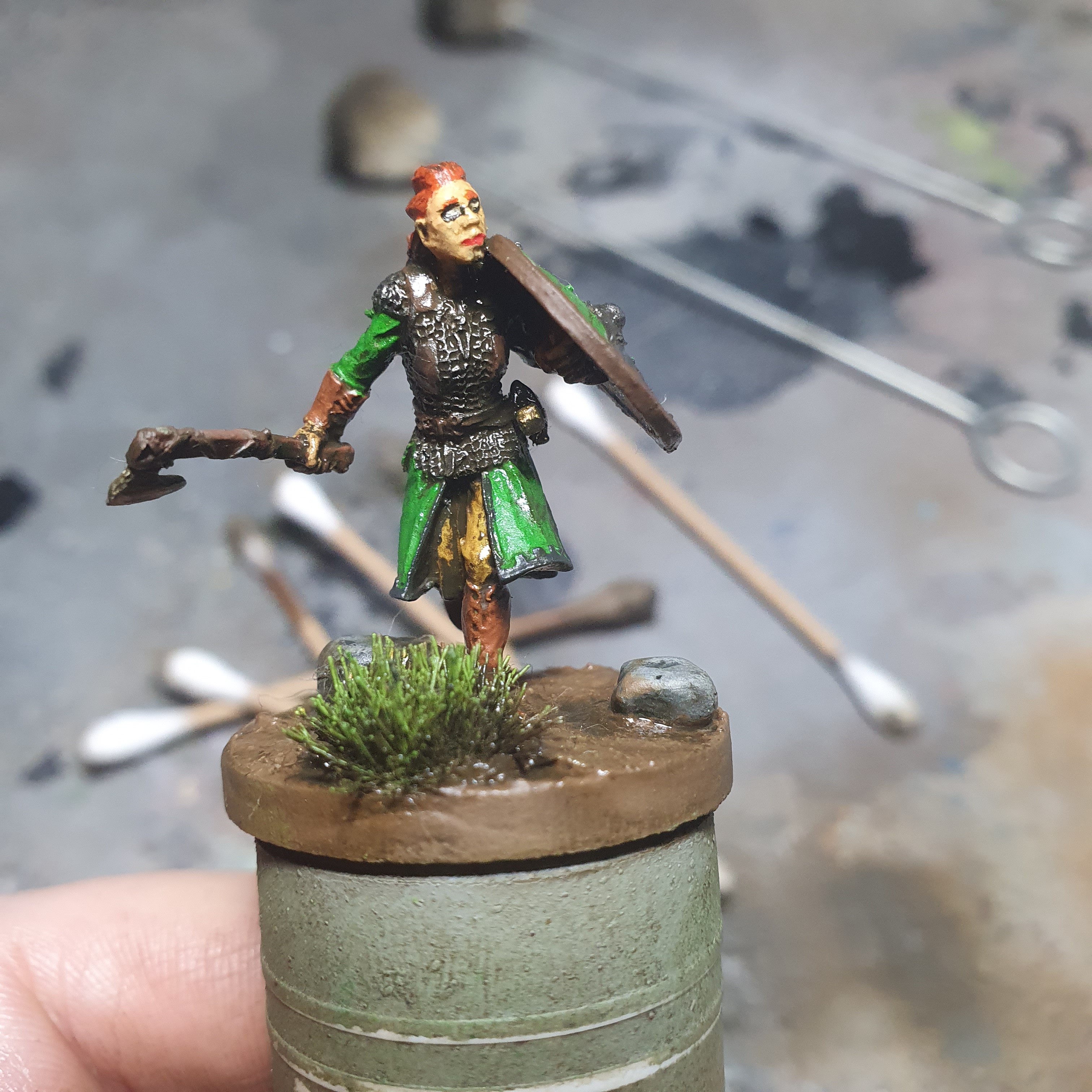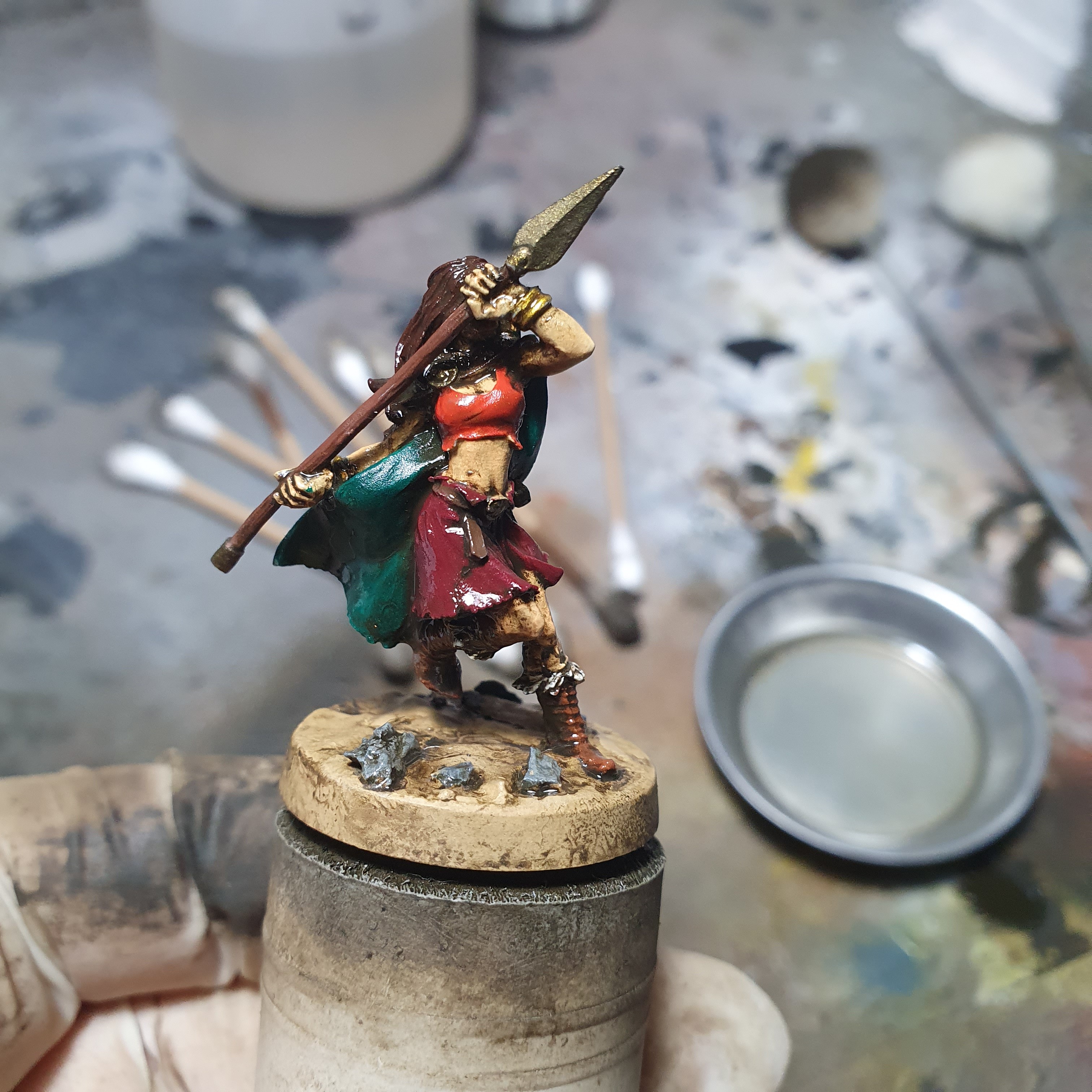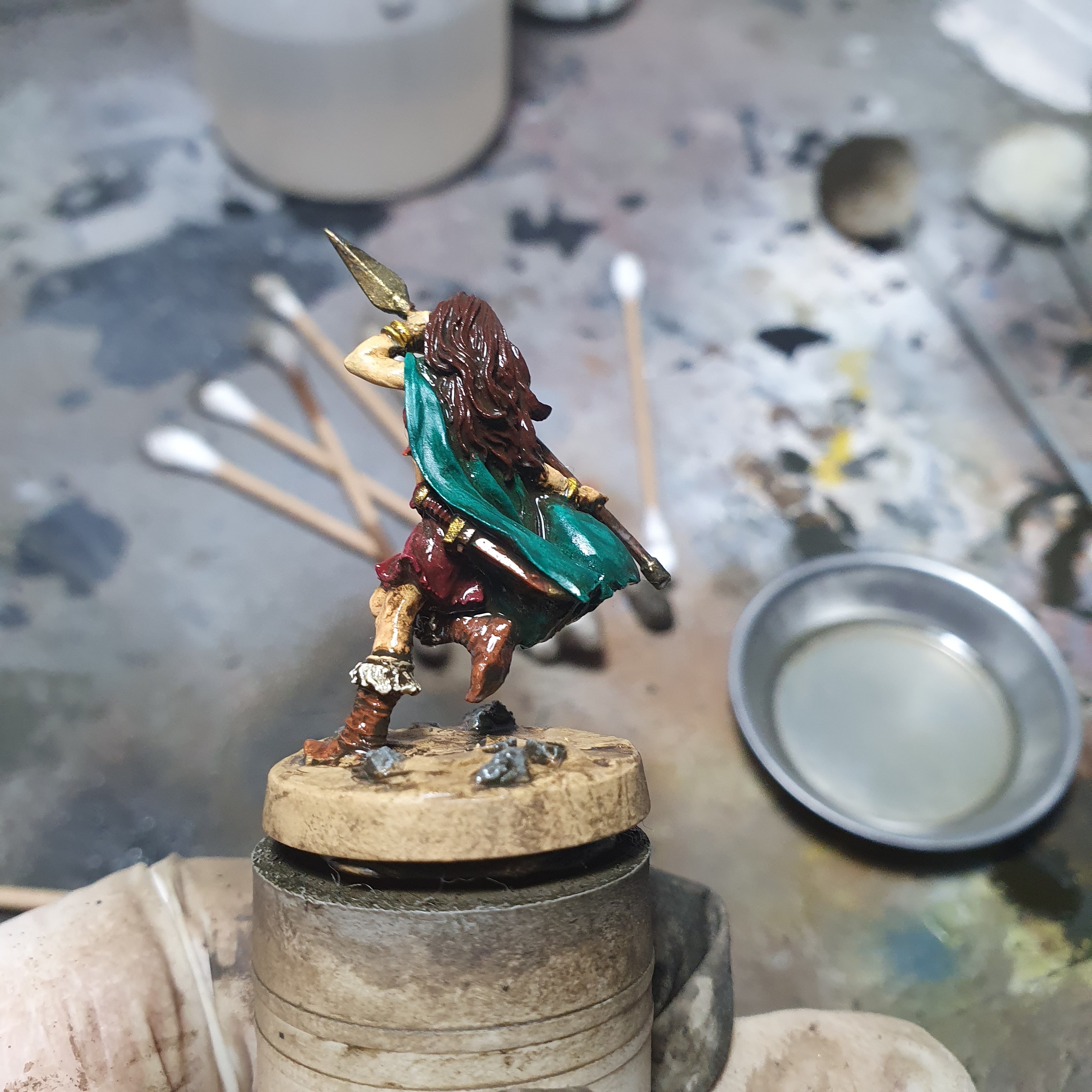 I had a really good painting session today. I got the metals upped and shiny again after the varnishes on Haleth and did the acrylic base layers on Boudi, both from Hasslefree Miniatures.