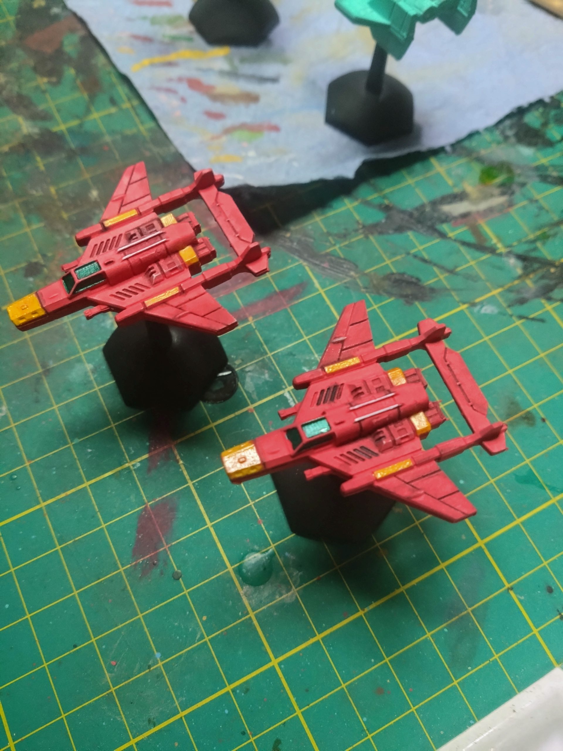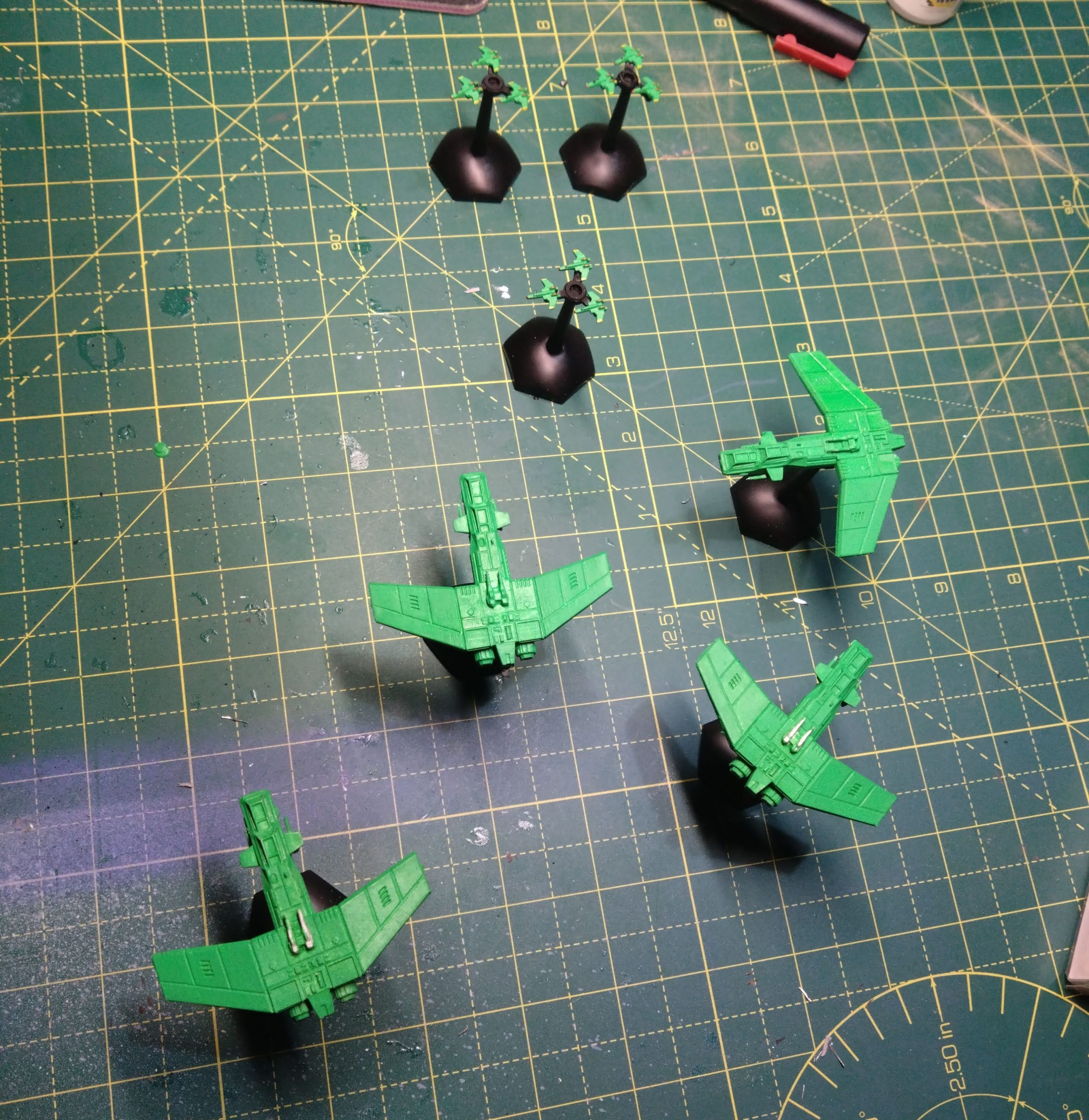 I have a bunch of fighters built and primed. It was time to start slapping some colours on.