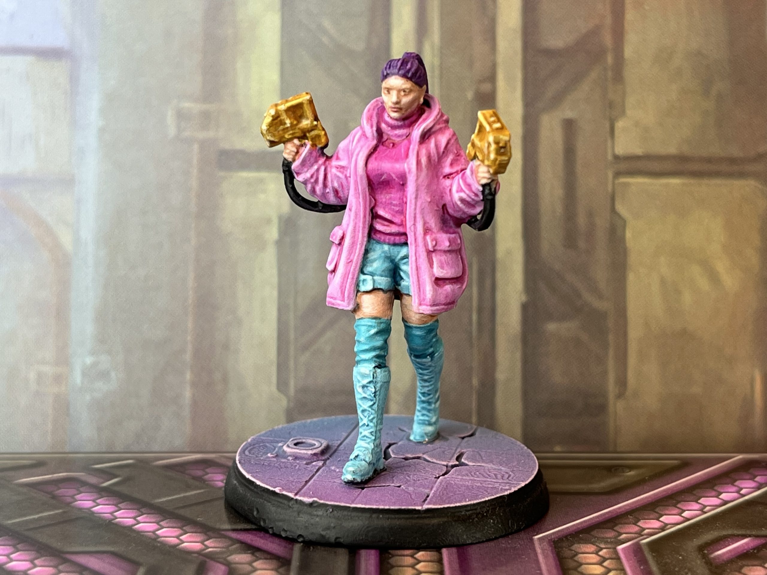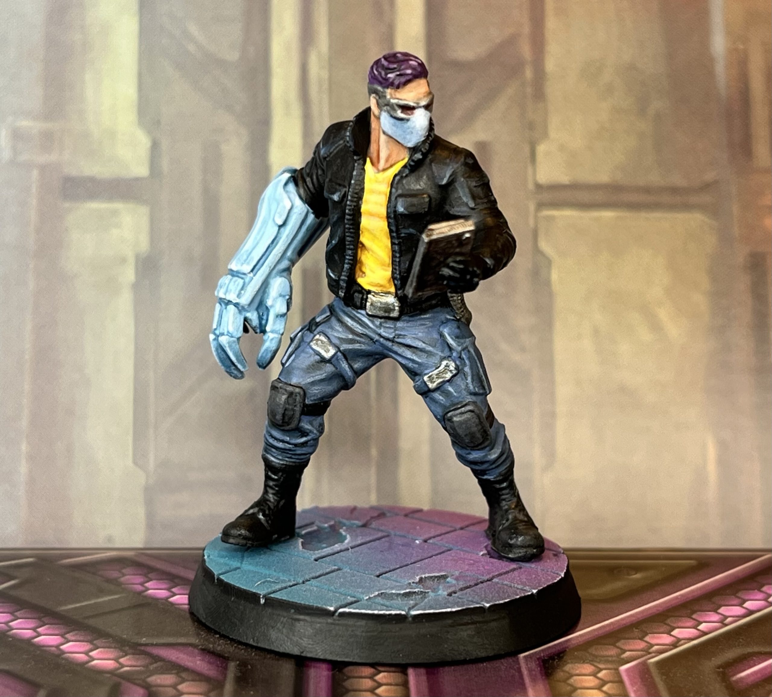 Next up I painted the Manipulator Hacker for the Neon Underground faction. Paint went on equally as quickly as the previous one. Maybe 3 hours total, perhaps less. This model has the cyberpunkiness cranked right up, so I tried to give it a paintjob to match!