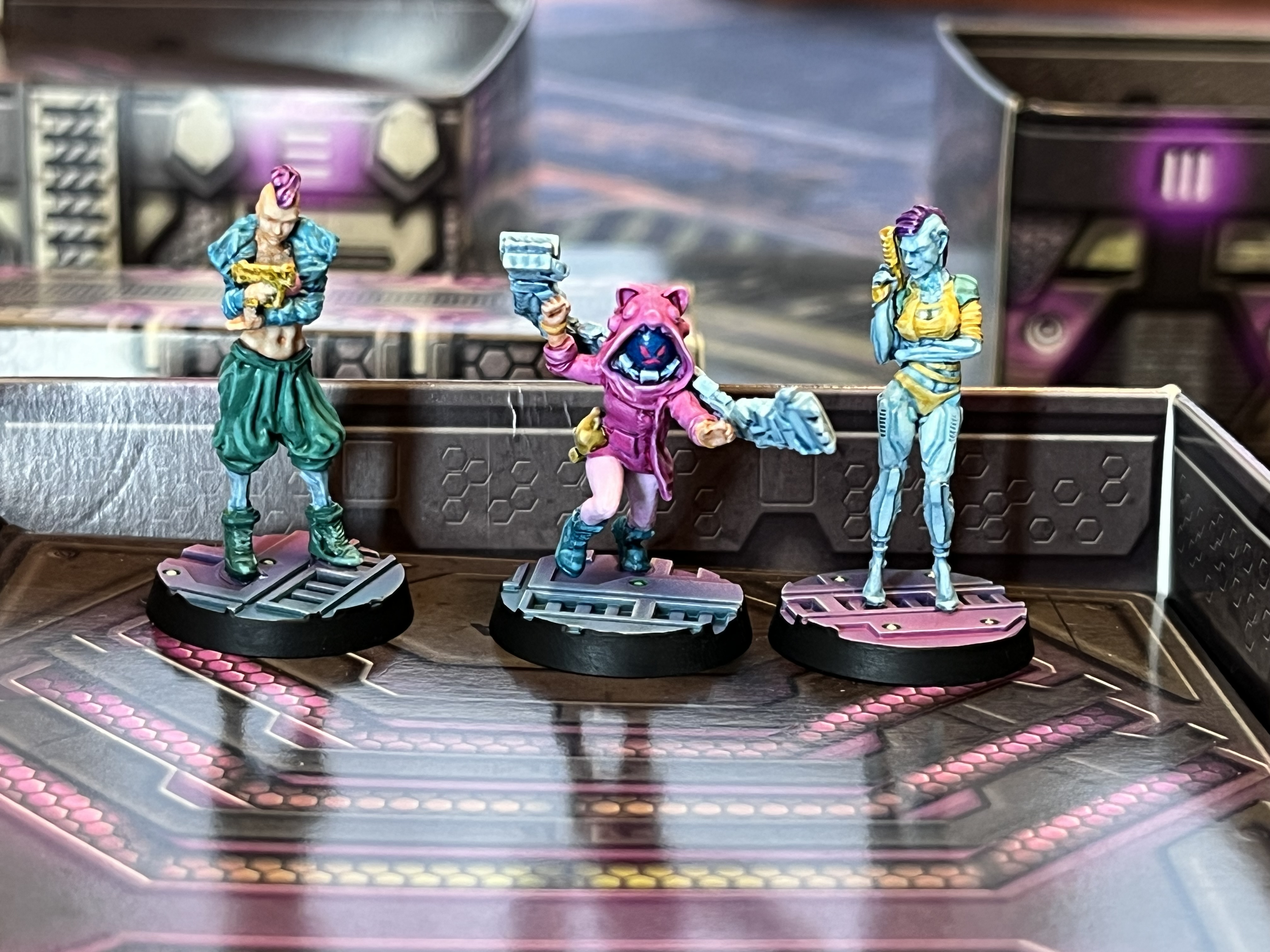 Time to get another faction into production. Neon Underground seems like a good choice as I am very keen to test their hacking mechanics and seeing how that competes with the more physical factions. Human Interface minis are perfect again, and for expediency I am going to throw paint onto the PVC board game minis to get them on the table. If all goes well, I’ll come back and do a nicer job on the metal versions in due course.