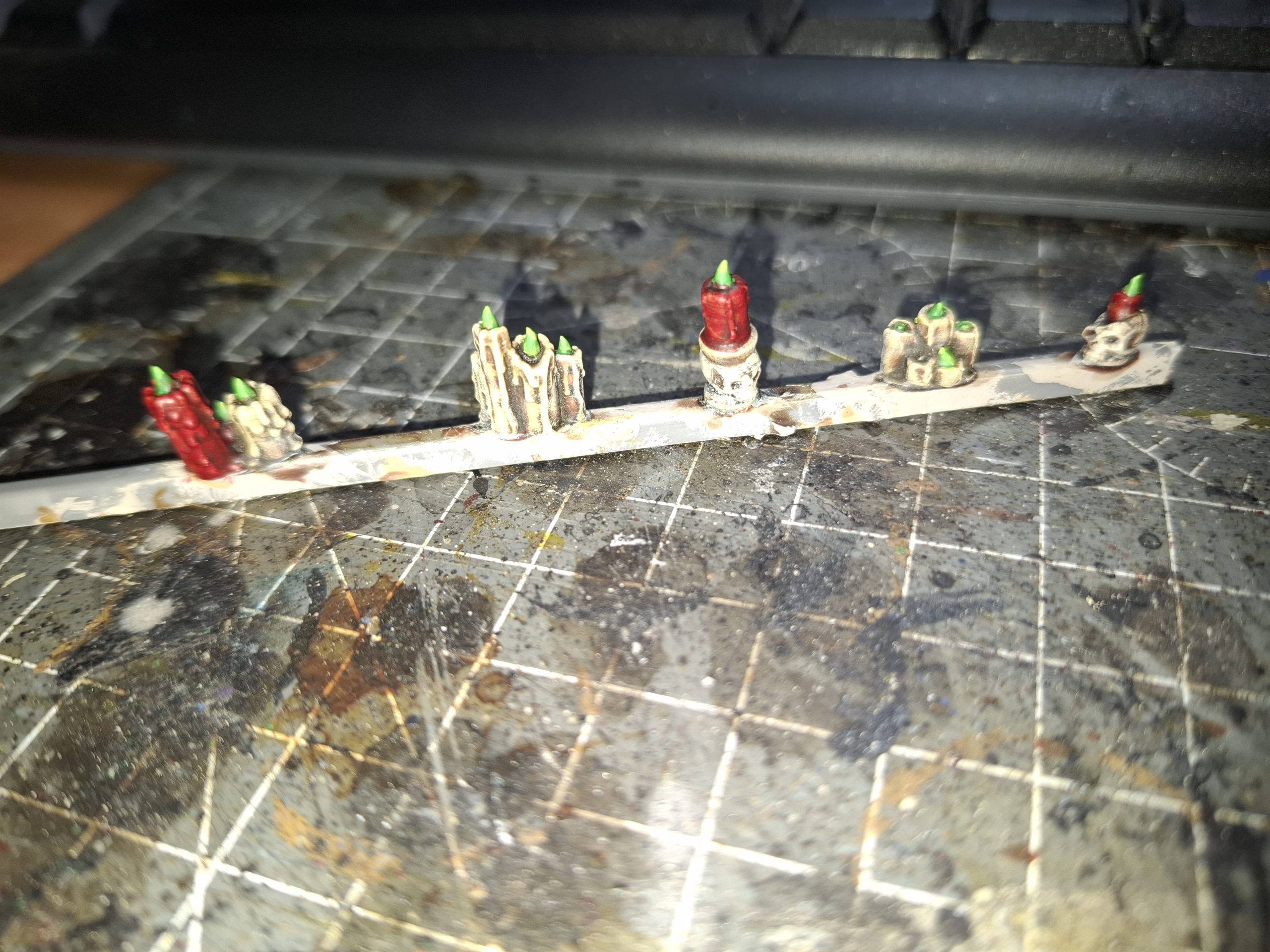 I painted more candles. This time, I added red candles (Painted in exactly the same way as previously described, just finished with a coat of Contrast Flesh Tearer Red.) and green flames. First, Contrast Warpstone Green, a highlight of wraithbone and a coat of Contrast Scorpion Green. These were then glued to the bases with super glue.