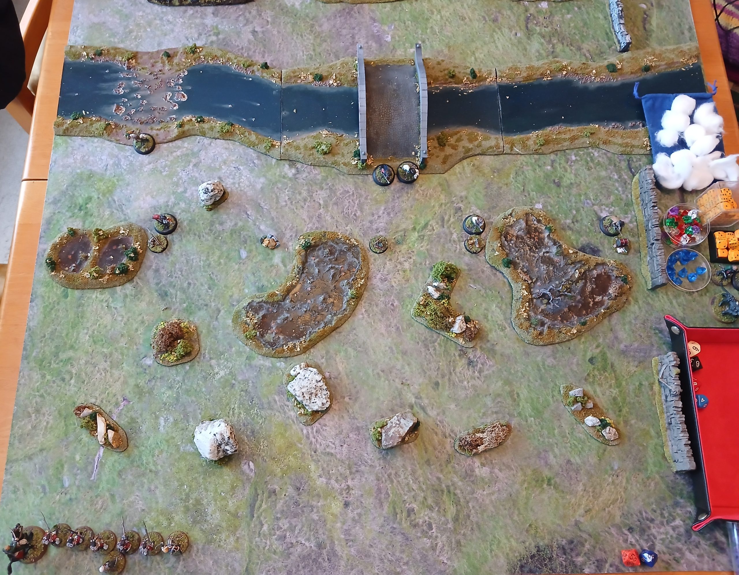 The clue tokens are arrayed across the middle of the board. Two bandits guard the bridge, one guards the ford and three others are placed randomly by clue markers.