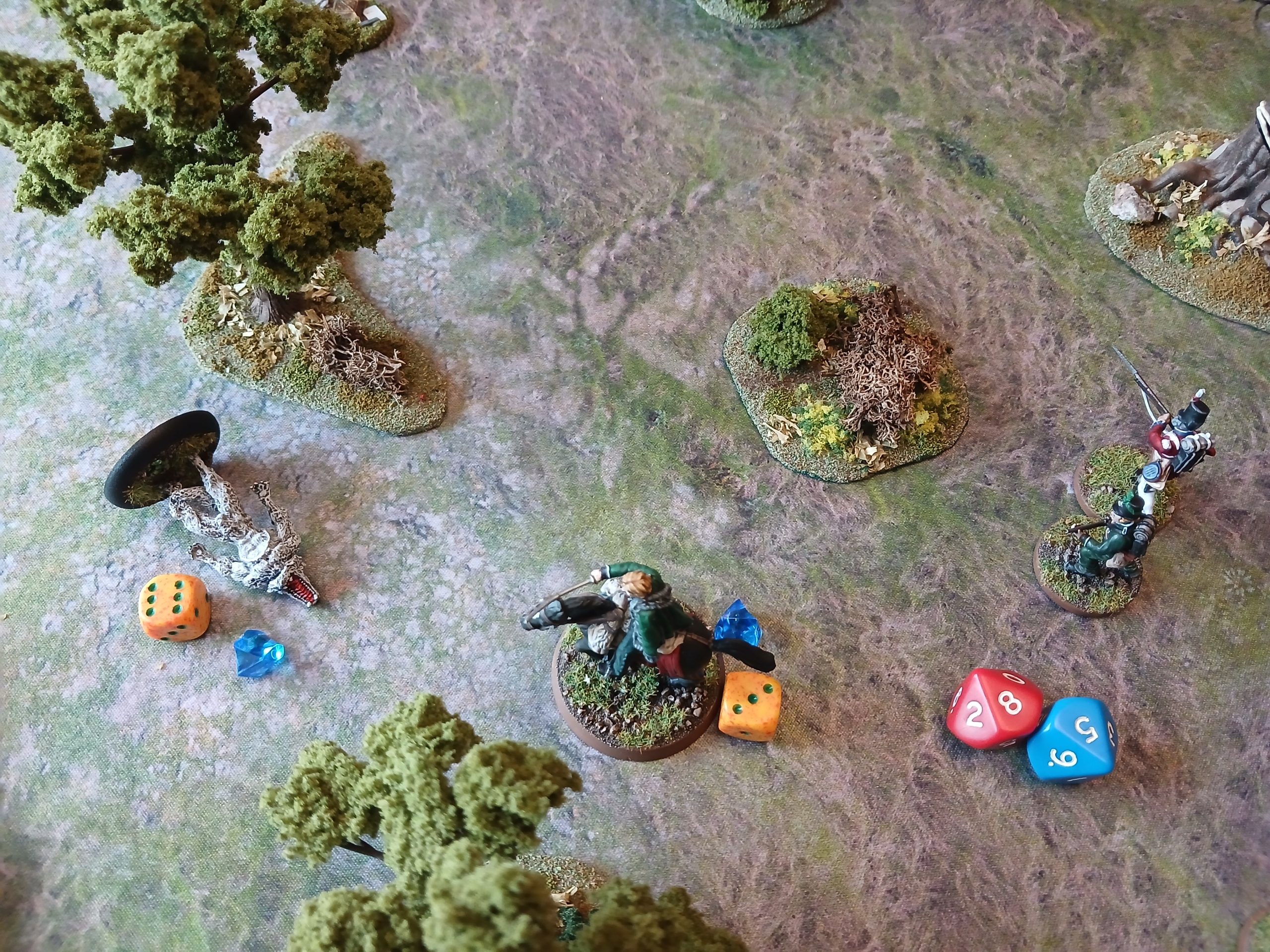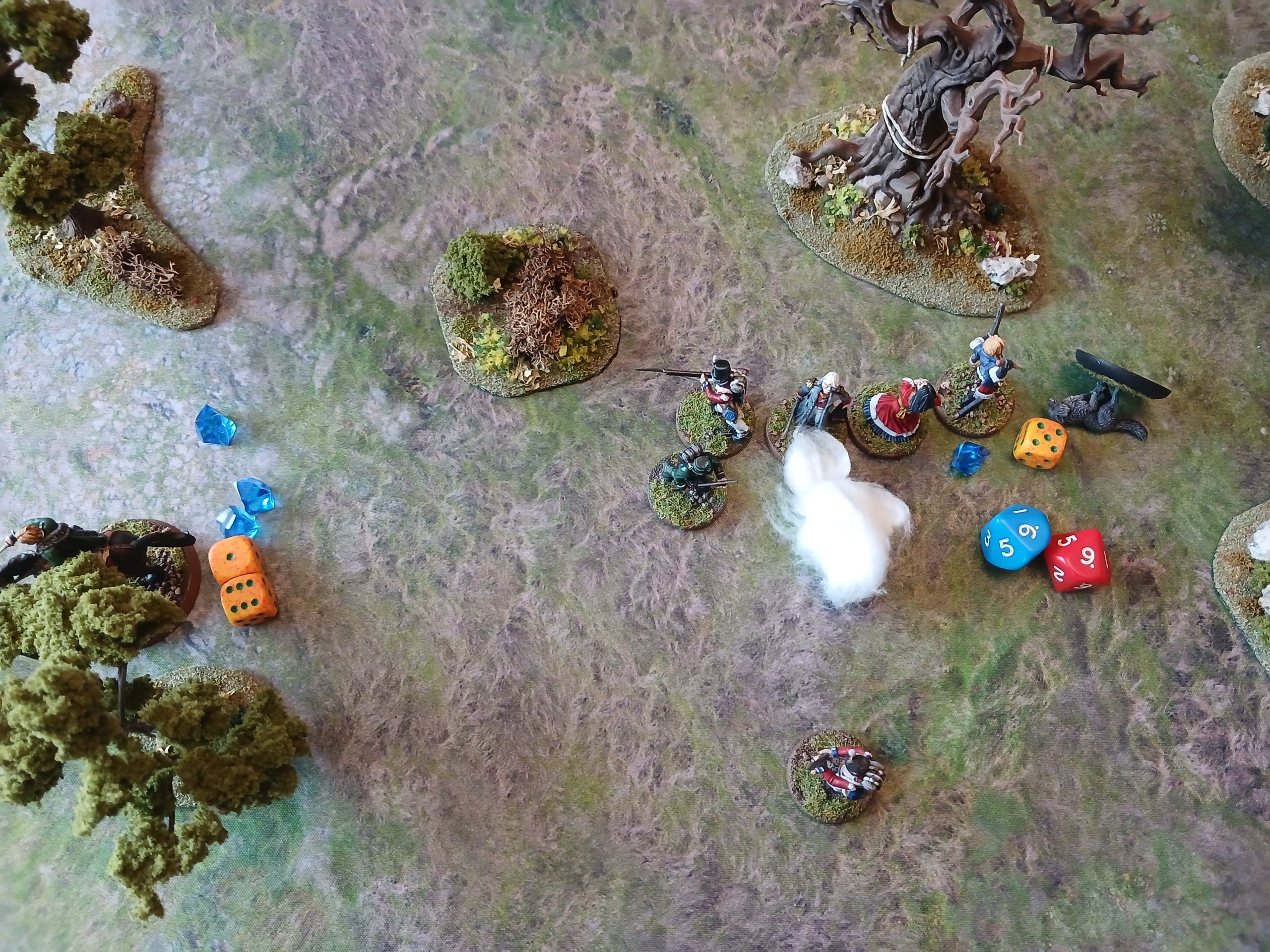 Rifleman shoots, but misses. So then reloads. Occultist moves off, others move up. Richmond shoots, but misses, Walker misses, infantry misses…. SI hits, for 7, leaving the wolf on just 1 health. Then, just as they are close to leaving with the orders, the event is a 10!