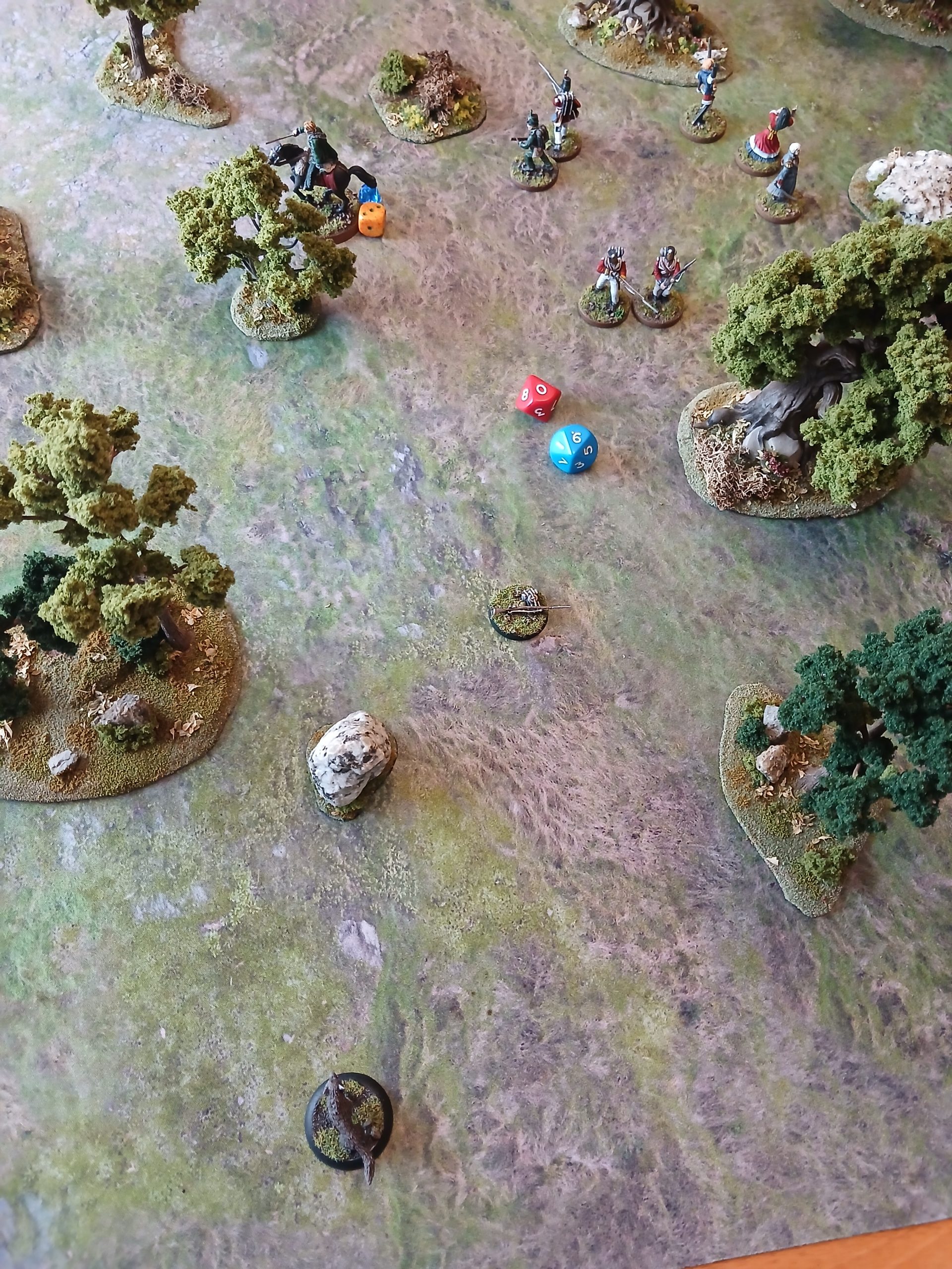 With no enemies, and all of the unit within 8” of the ‘phantom’ board edge (3” in due to it being 2.5ft sq) they all move off as the weather comes in and the cold rain begins to wash the battlefield clean of blood, both human and canine.