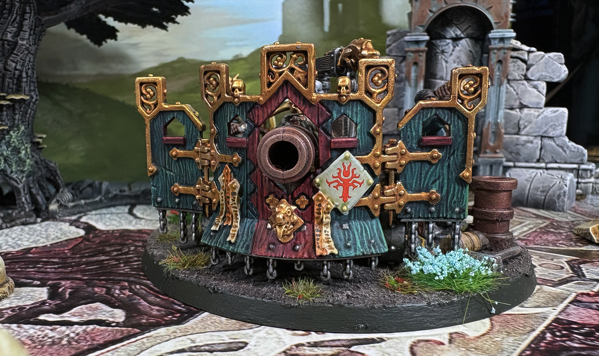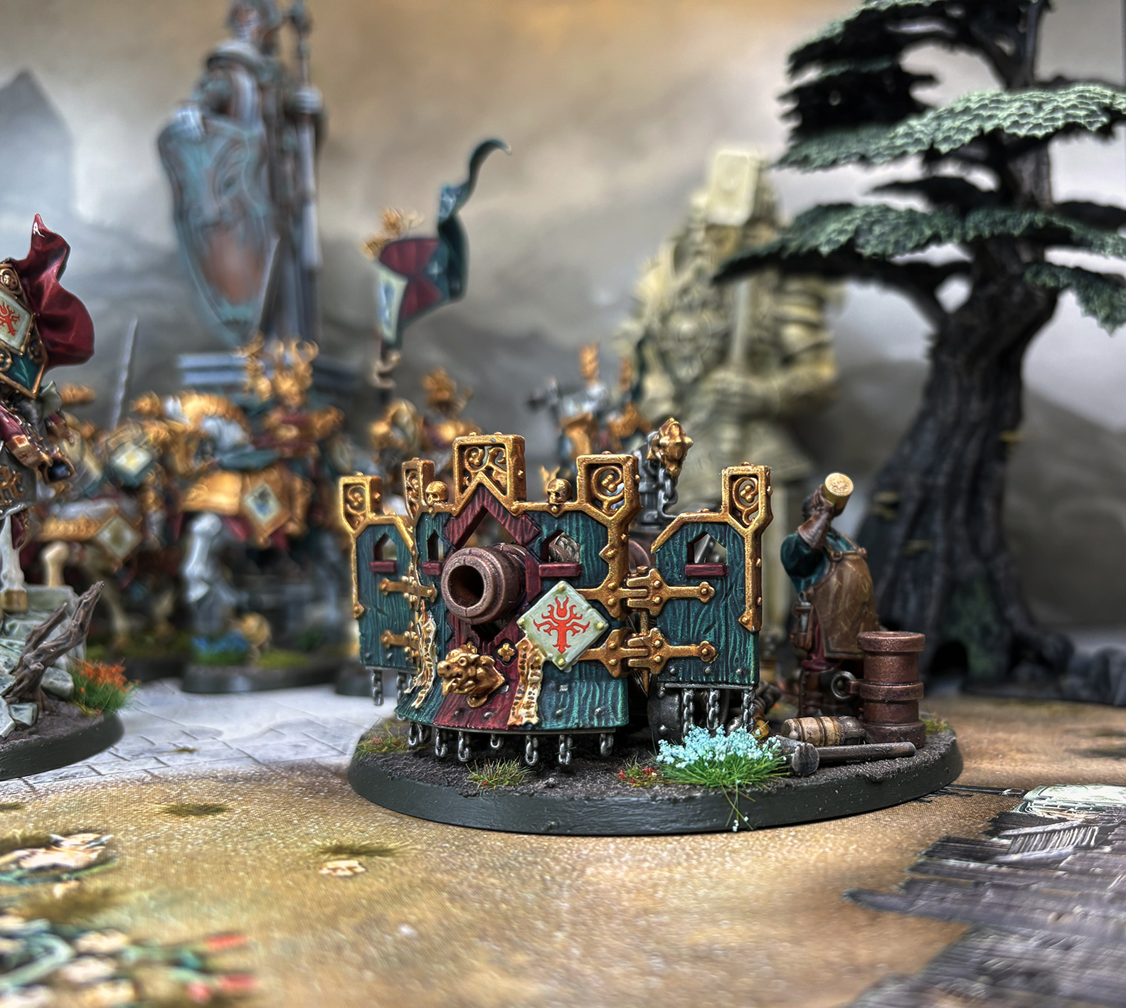 Ironweld Great Cannons are massive artillery pieces, which act as the roaring bastions of a Castelite formation. Protected by thick oaken gun-shields affixed to the cannon’s fore, the crew tirelessly load, fire, and reload their weapon to ensure a relentless barrage of firepower upon the enemy.
