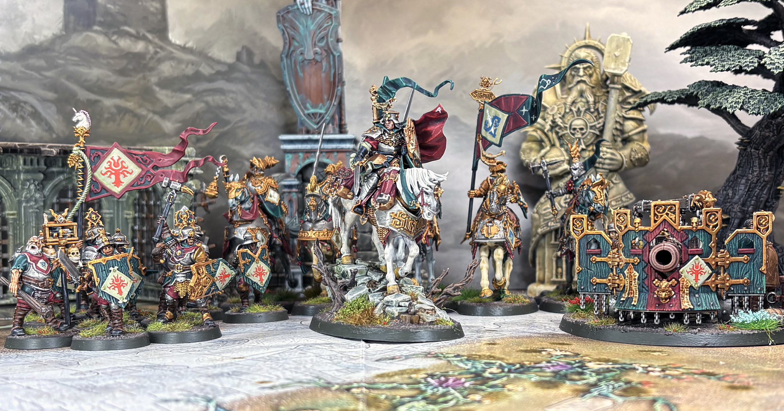 unleashing a devastating riposte in return. Freeguild Steelhelms form a sturdy core, advancing into battle with shields locked together, relying on discipline and faith to hold the line against whatever horror comes at them. With this anvil in place, the process of breaking the enemy upon it can begin. An Ironweld Great Cannon sends bone—shattering ordnance blasting through the enemy ranks, while the Cavalier-Marshal leads a thunderous counter—charge to sweep them from the field. Freeguild Cavaliers sing Sigmarite battle-hymns as they crush the opposition beneath the grinding hooves of their destriers or bash in their skulls with hammers and flails.