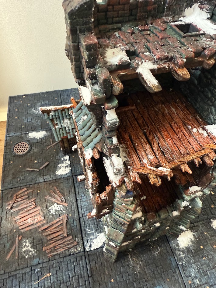 A new big building for the outdoor setup. Tried something new on the stonework by underpainting in green and stippling on orange/red to try for a chromatic grey feel. Overall I think it looks good but I have refined the process on some other small pieces of terrain ill post here shortly.