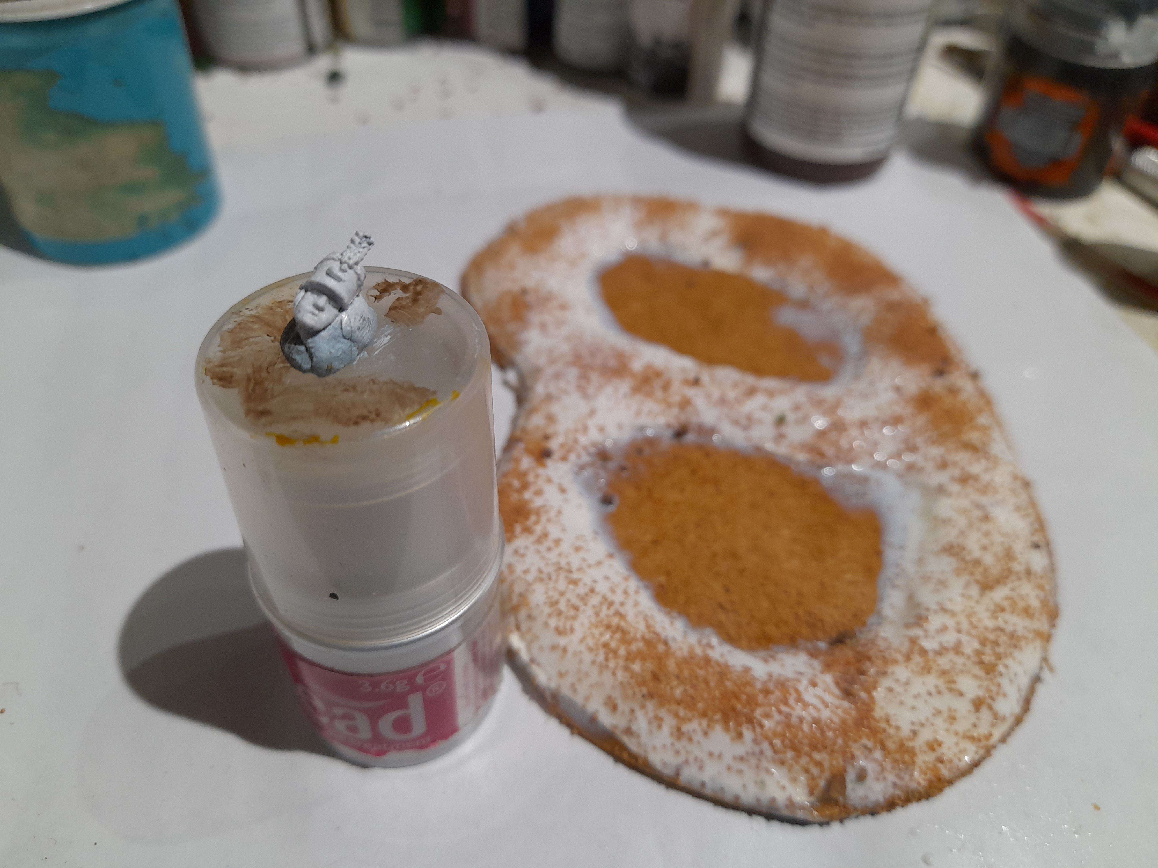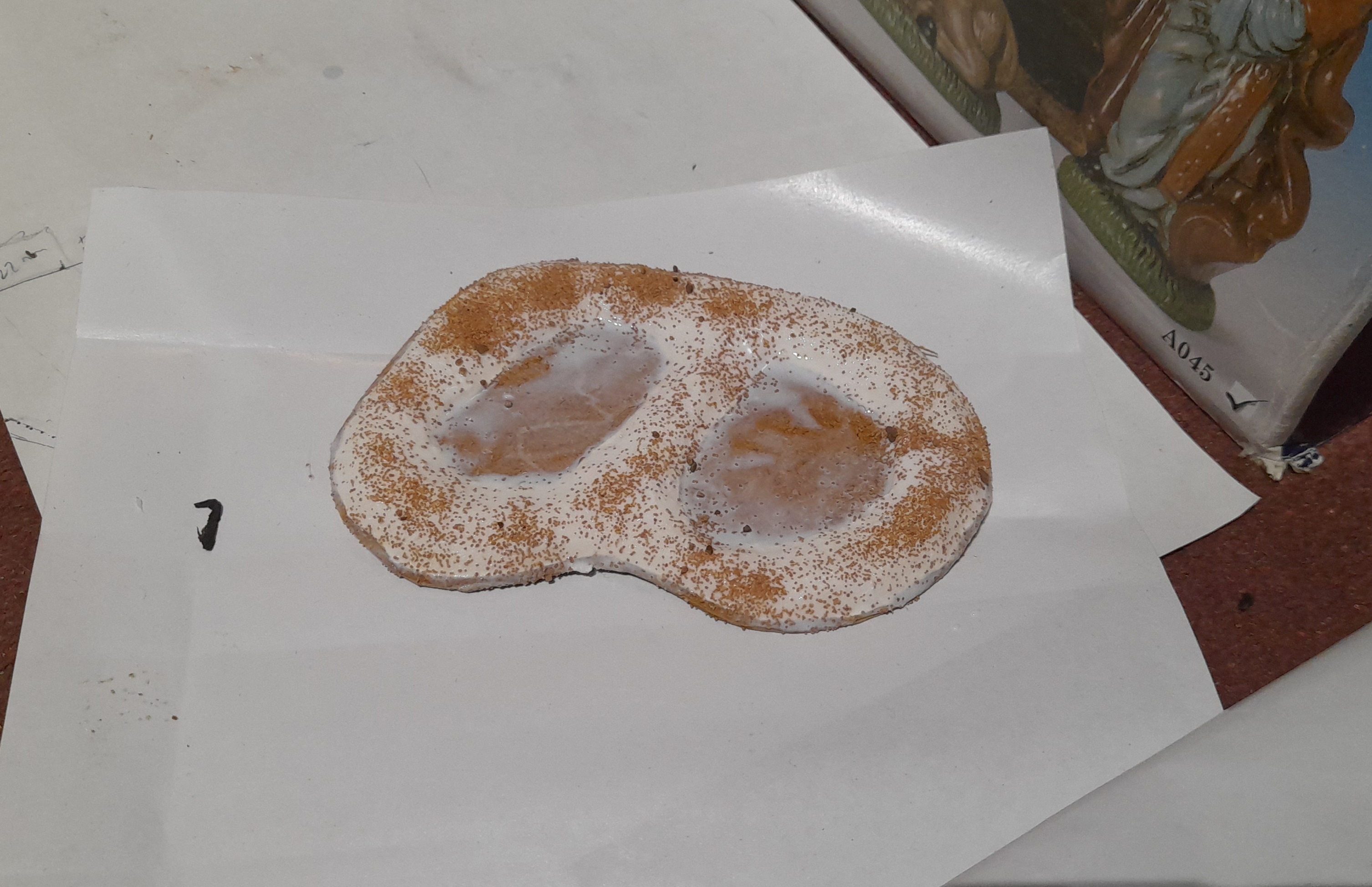 The foarmcard was trimmed down to give sloping edges. I then sealed it with PVA, sprinkling on some sand while it was drying. I also sanded down a spare rifleman head, with the intent of sticking it in one of the pools.