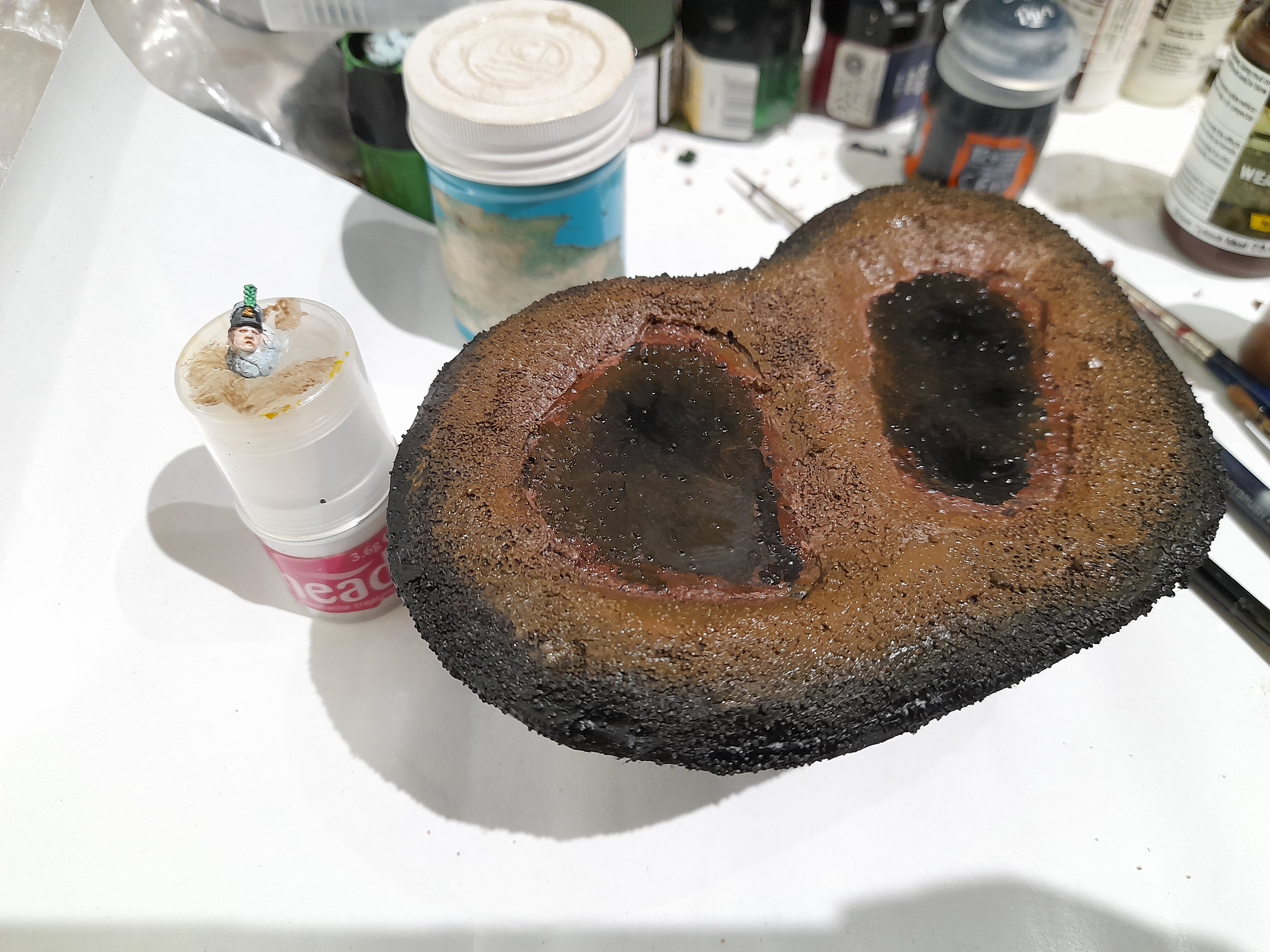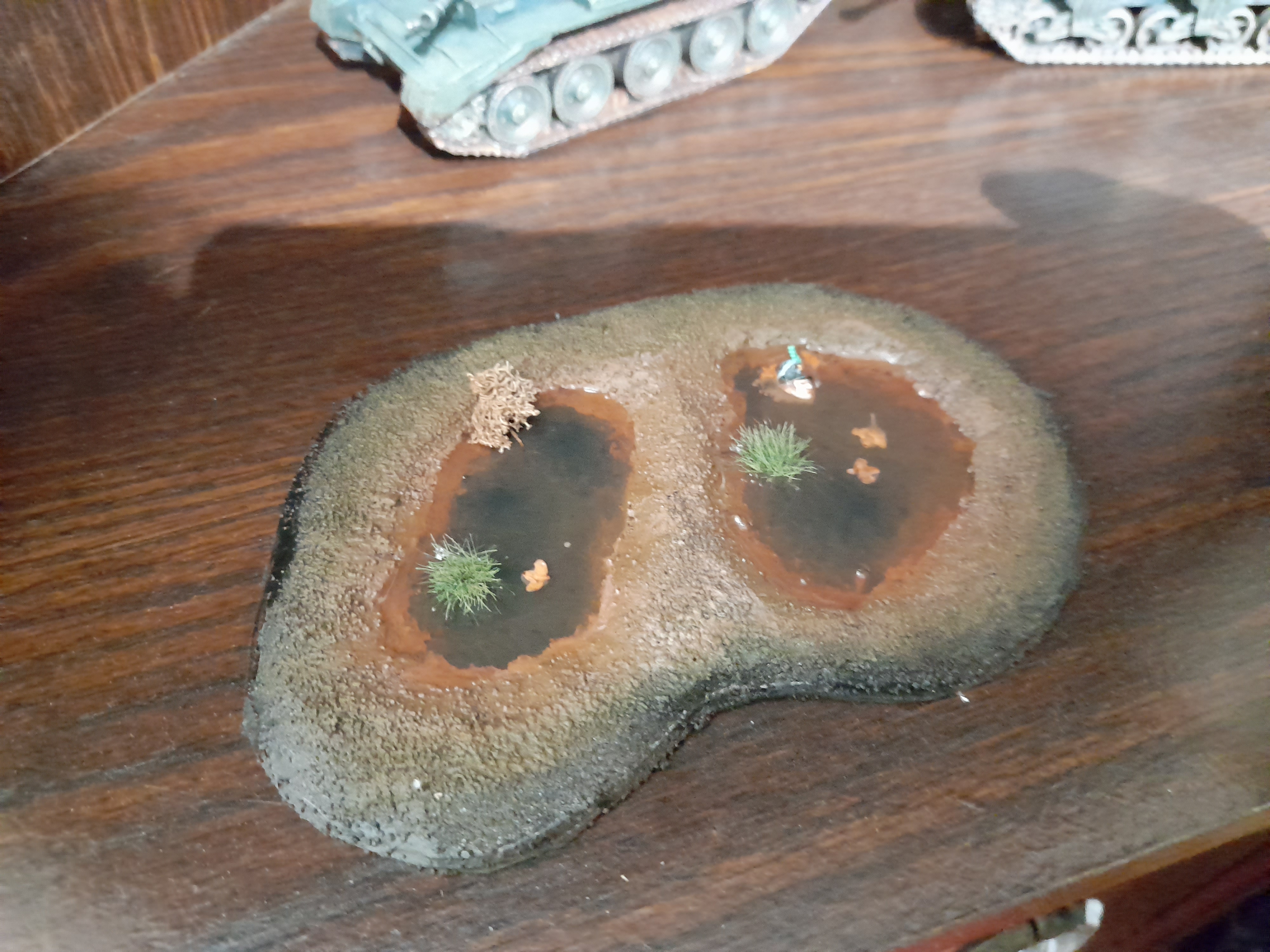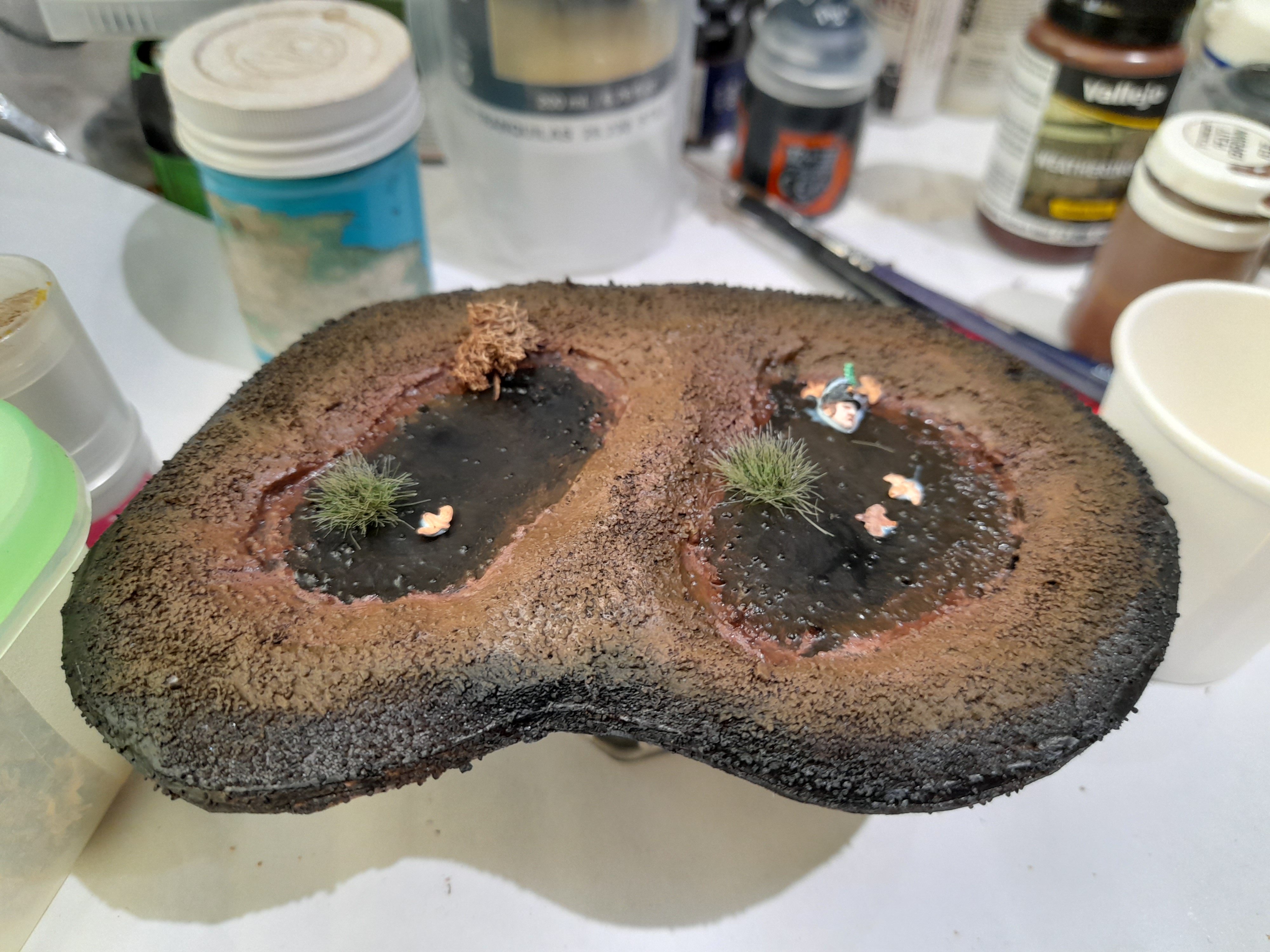 Subsequently I added an arm to the head in the pool, and several more pours, some of which were tinted brown. Painted up the edges, then added flock, and some clumps.