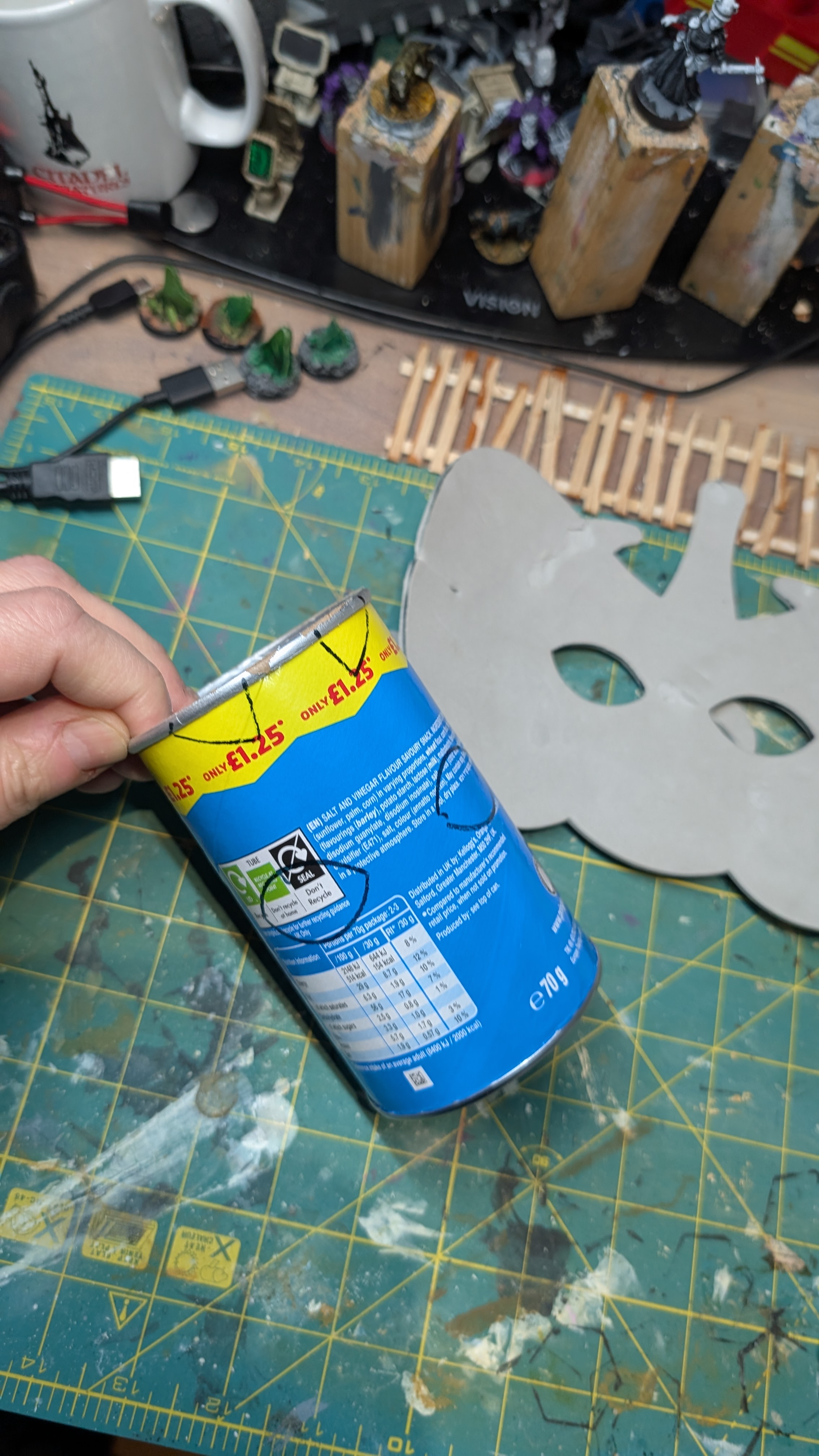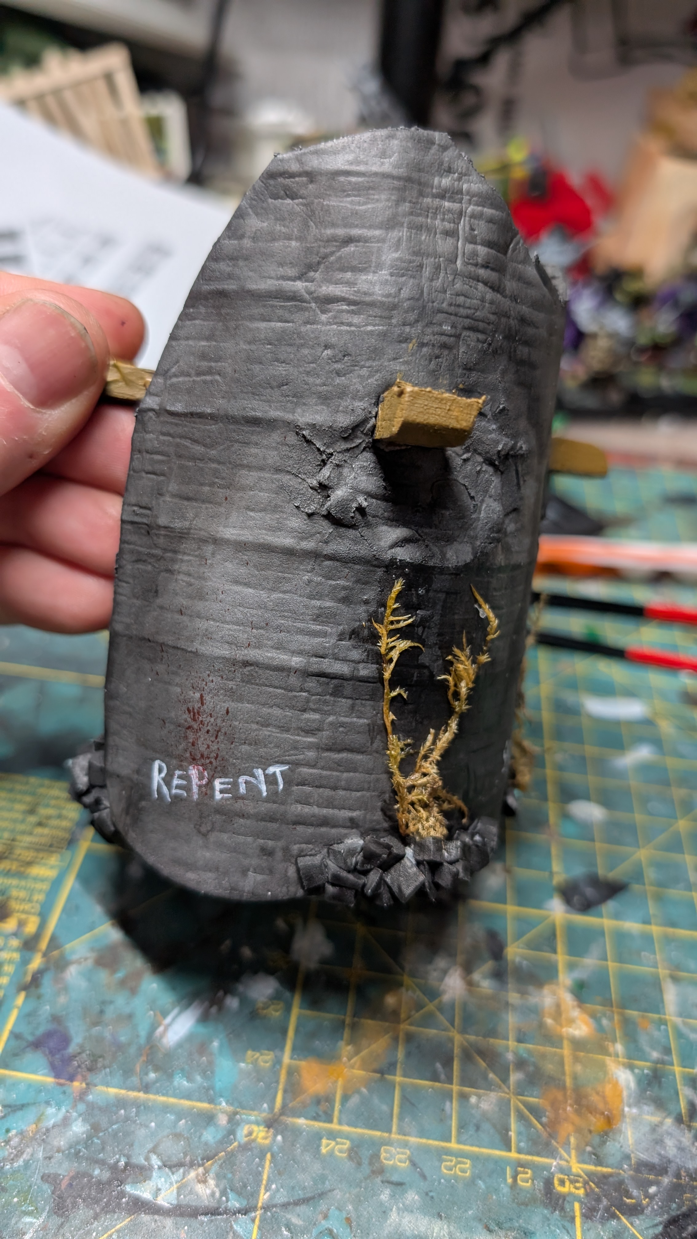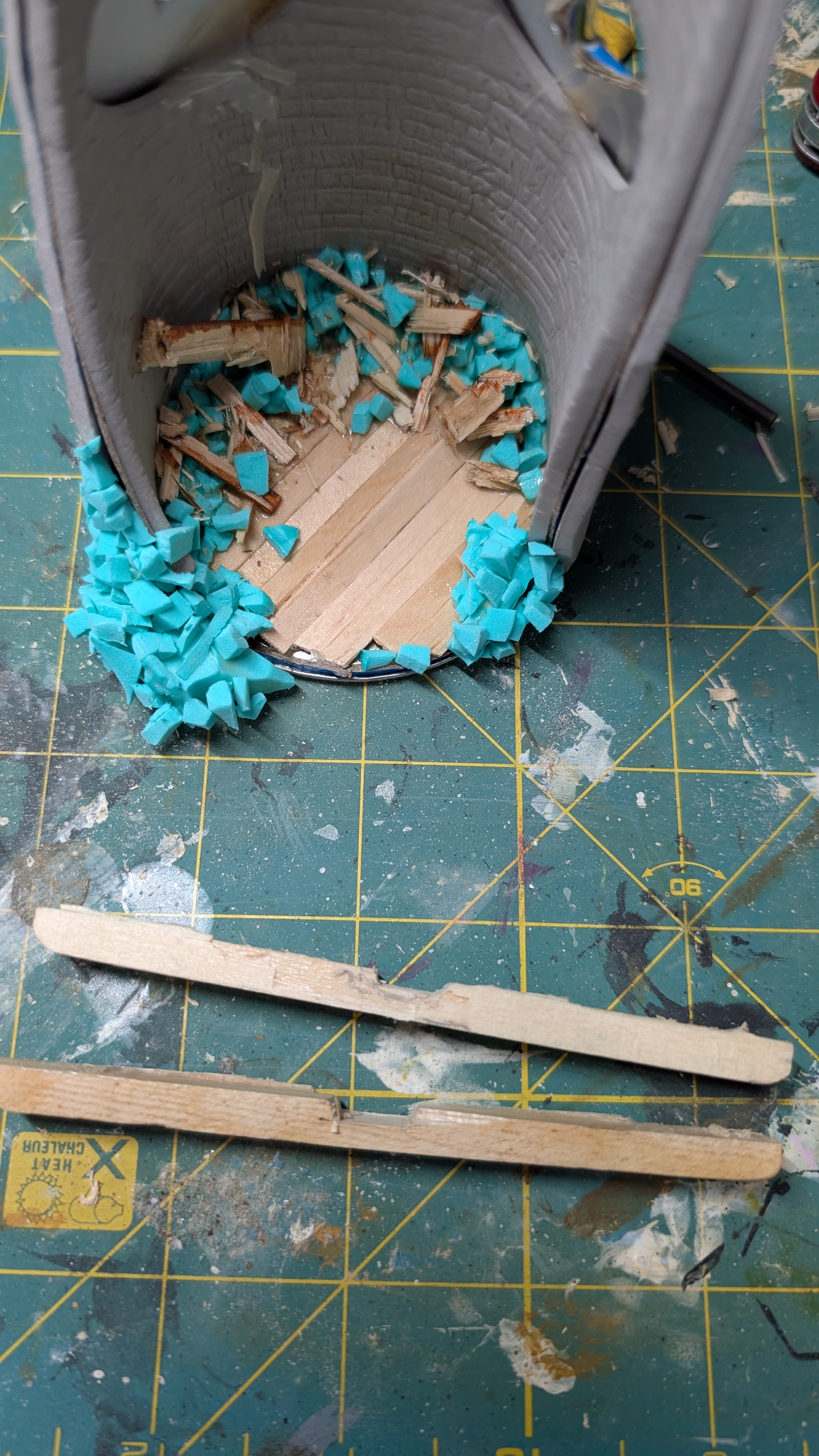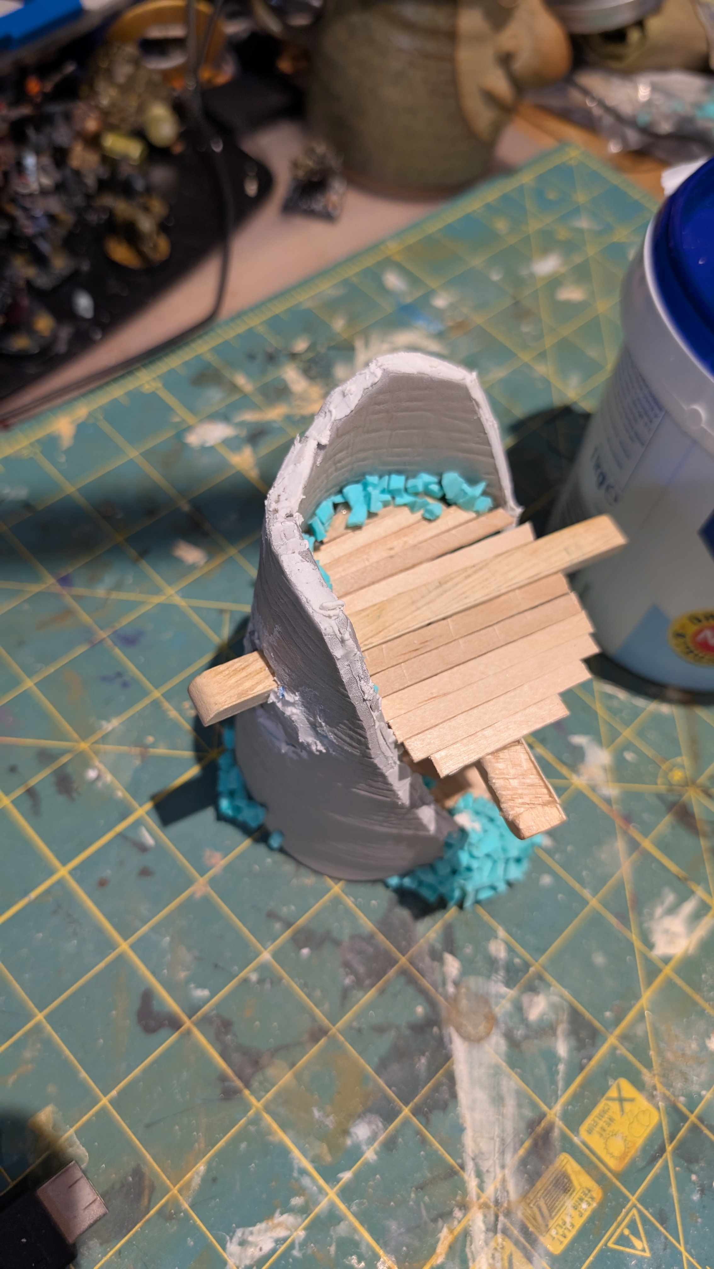 After that I covered the metal bottom of the pringle tin stir sticks, tiny EVA off cuts (made while on Teams calls at work instead of doodling) and some balsa salvaged from when I attacked the roofs in the previous post.