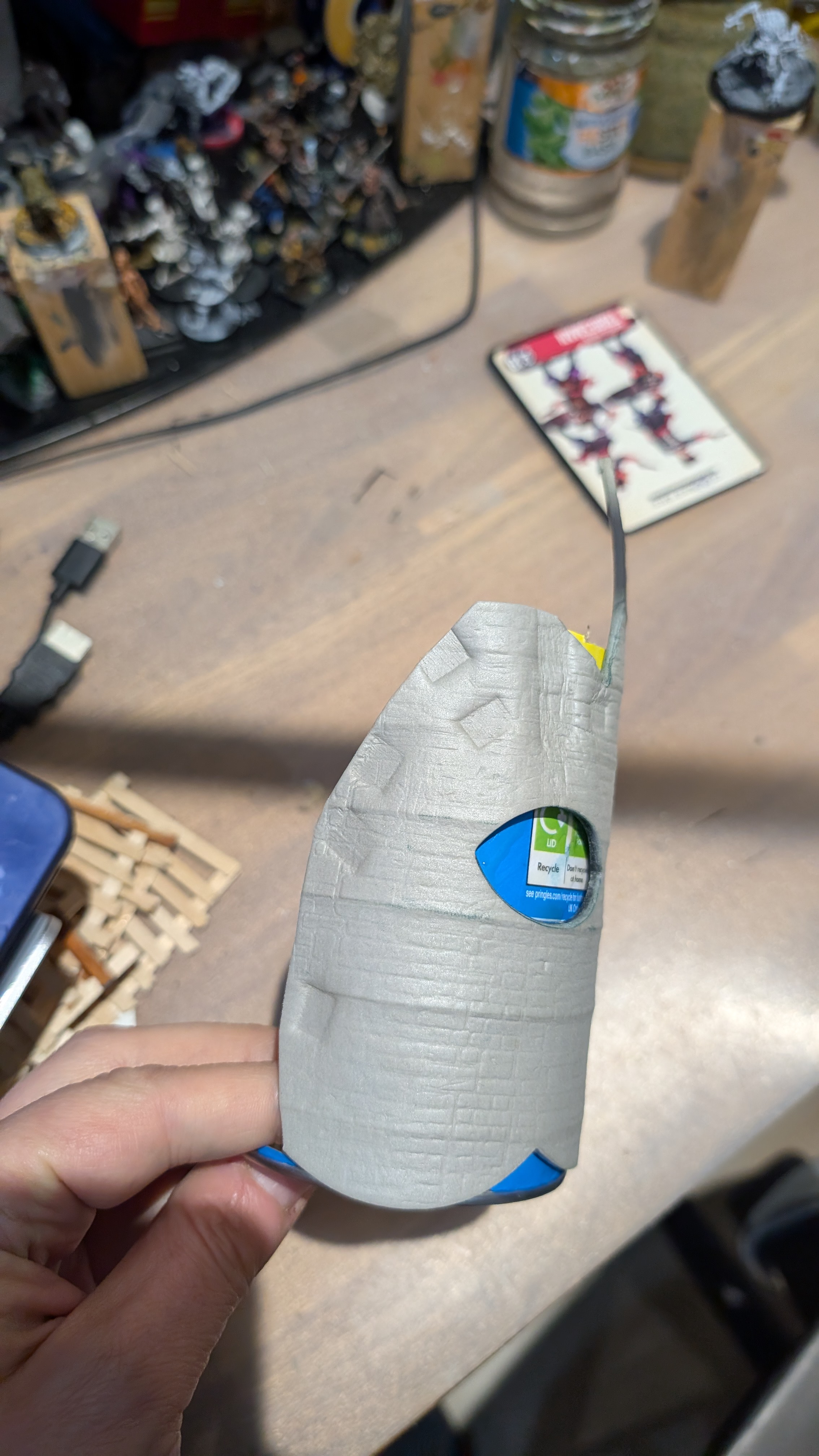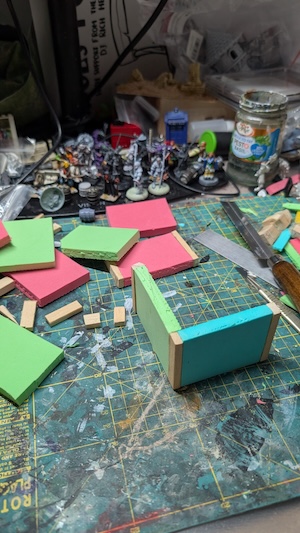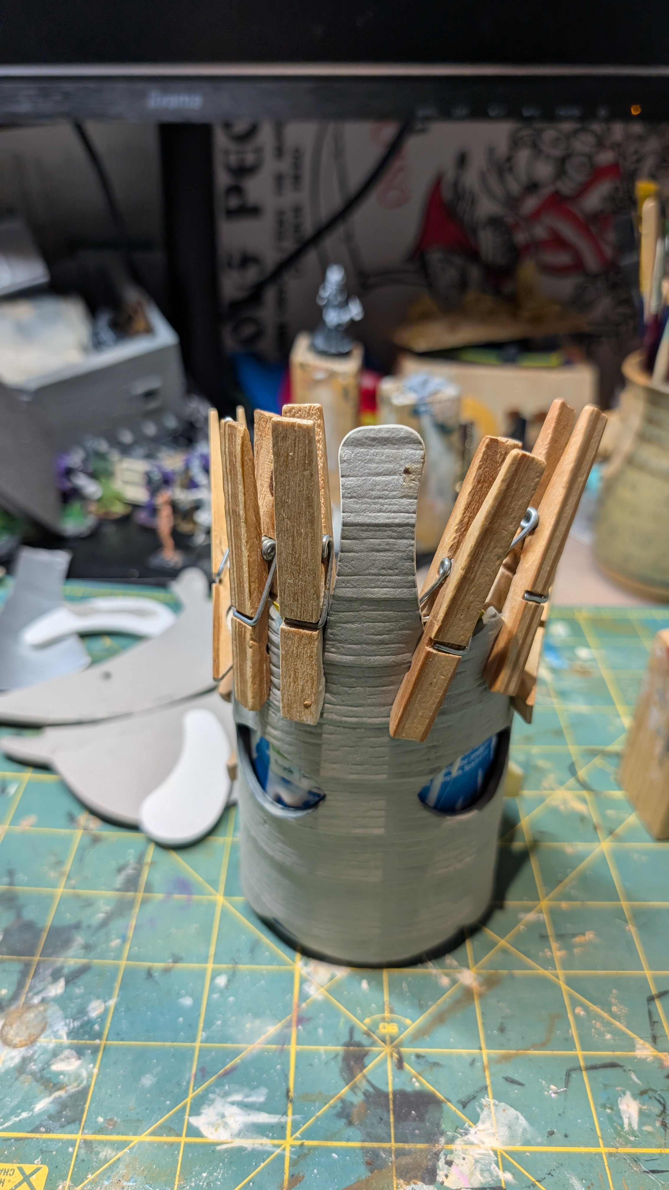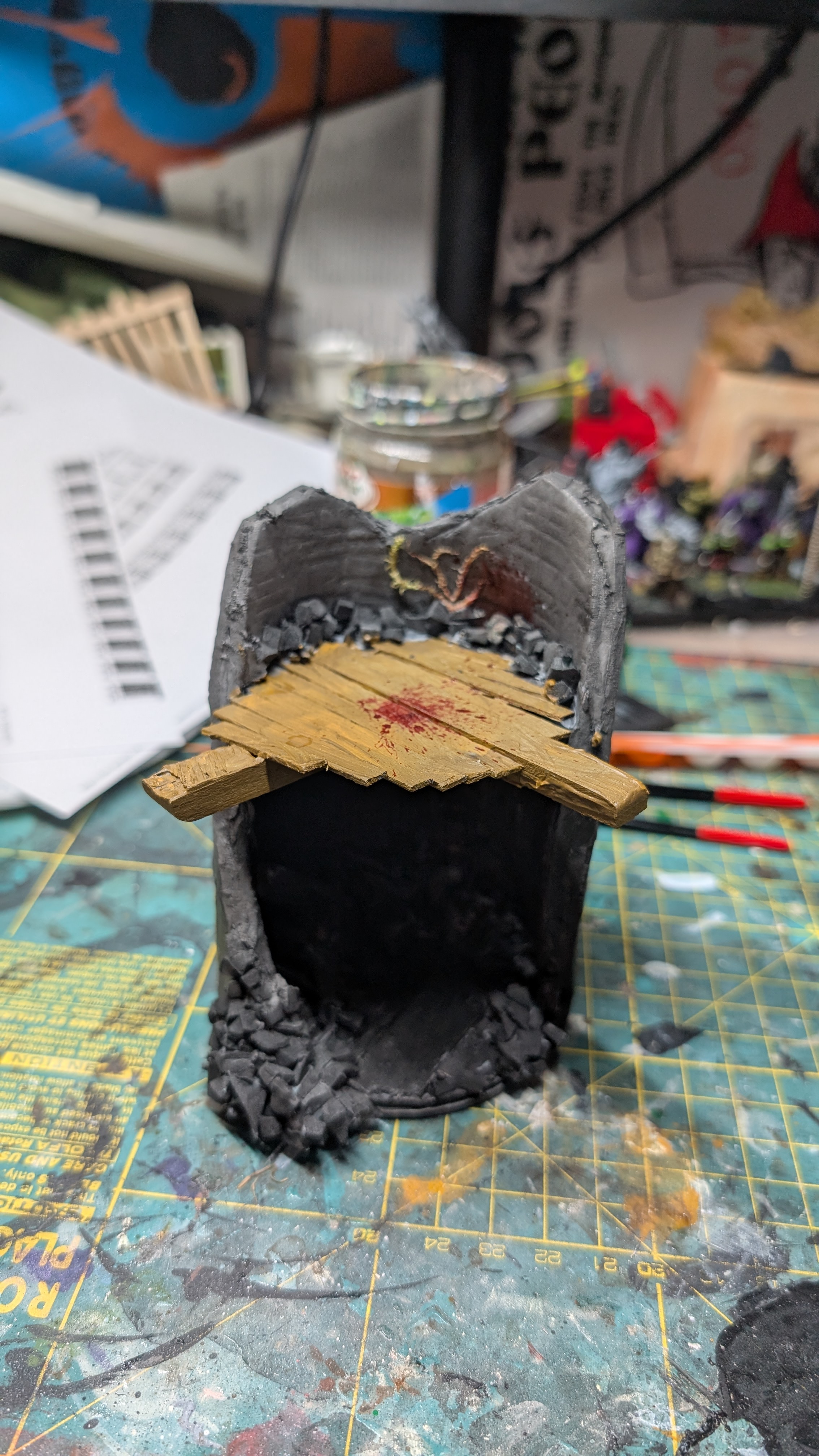 After that I covered the metal bottom of the pringle tin stir sticks, tiny EVA off cuts (made while on Teams calls at work instead of doodling) and some balsa salvaged from when I attacked the roofs in the previous post.
